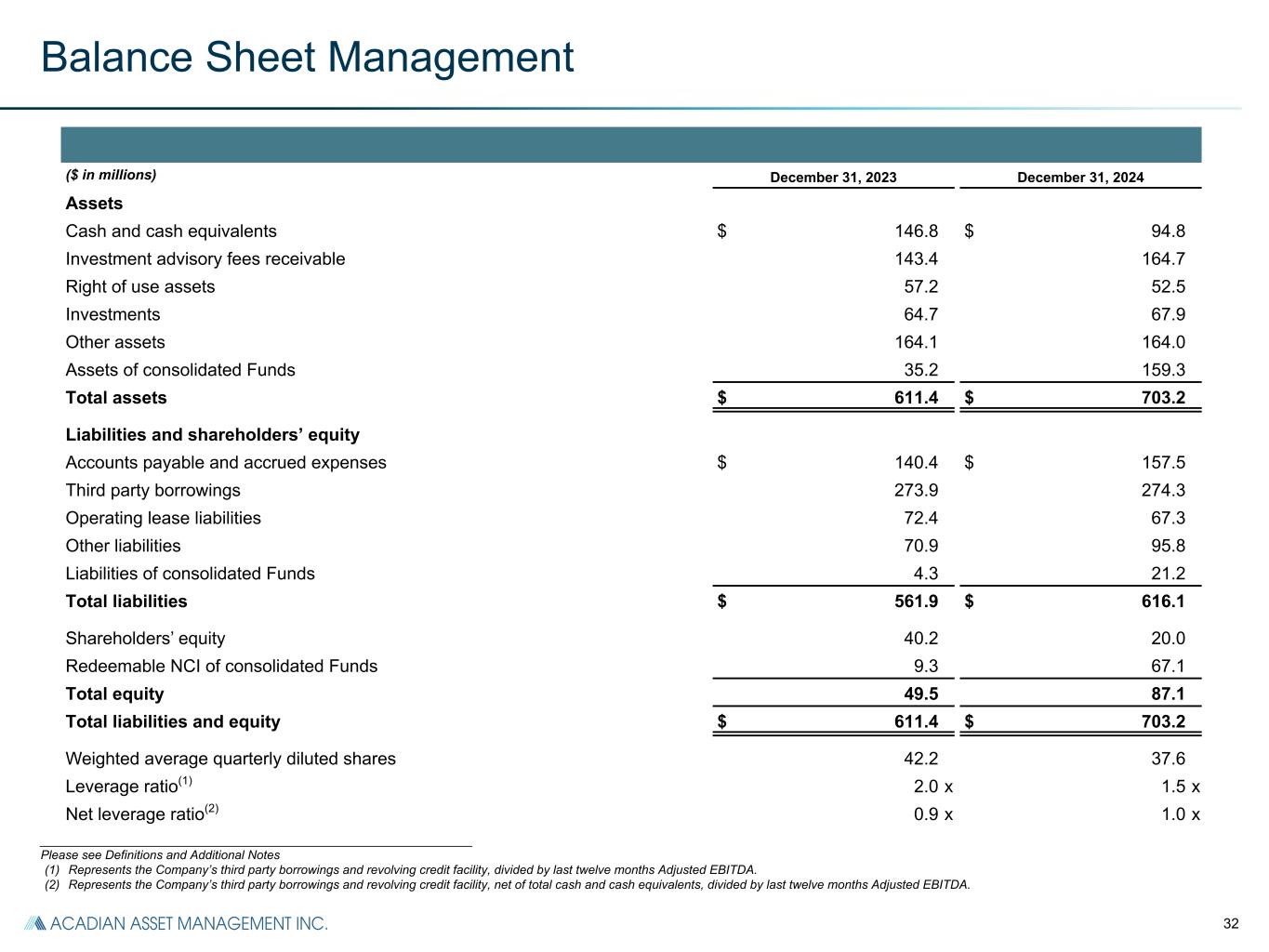 31 Acadian LLC Key Employee Distributions ($ in millions) Q4'23 Q4'24 Increase (Decrease) Earnings after variable compensation (ENI operating earnings) $ 47.8 $ 70.5 47% Less: Acadian LLC key employee distributions (1.2) (2.3) n/m Earnings after Acadian LLC key employee distributions $ 46.6 $ 68.2 46% Acadian LLC Key Employee Distribution Ratio ( / ) 2.5 % 3.3 % 75 bps ▪ Represents key employees’ share of profit from Acadian LLC’s earnings ▪ 2025 full-year Distribution Ratio expected to be 7%-8% if the equity market remains at the same level; mix of core and performance fee profits will impact the ratio __________________________________________________________ Please see Definitions and Additional Notes Acadian LLC Key Employee Distributions A A B B Commentary