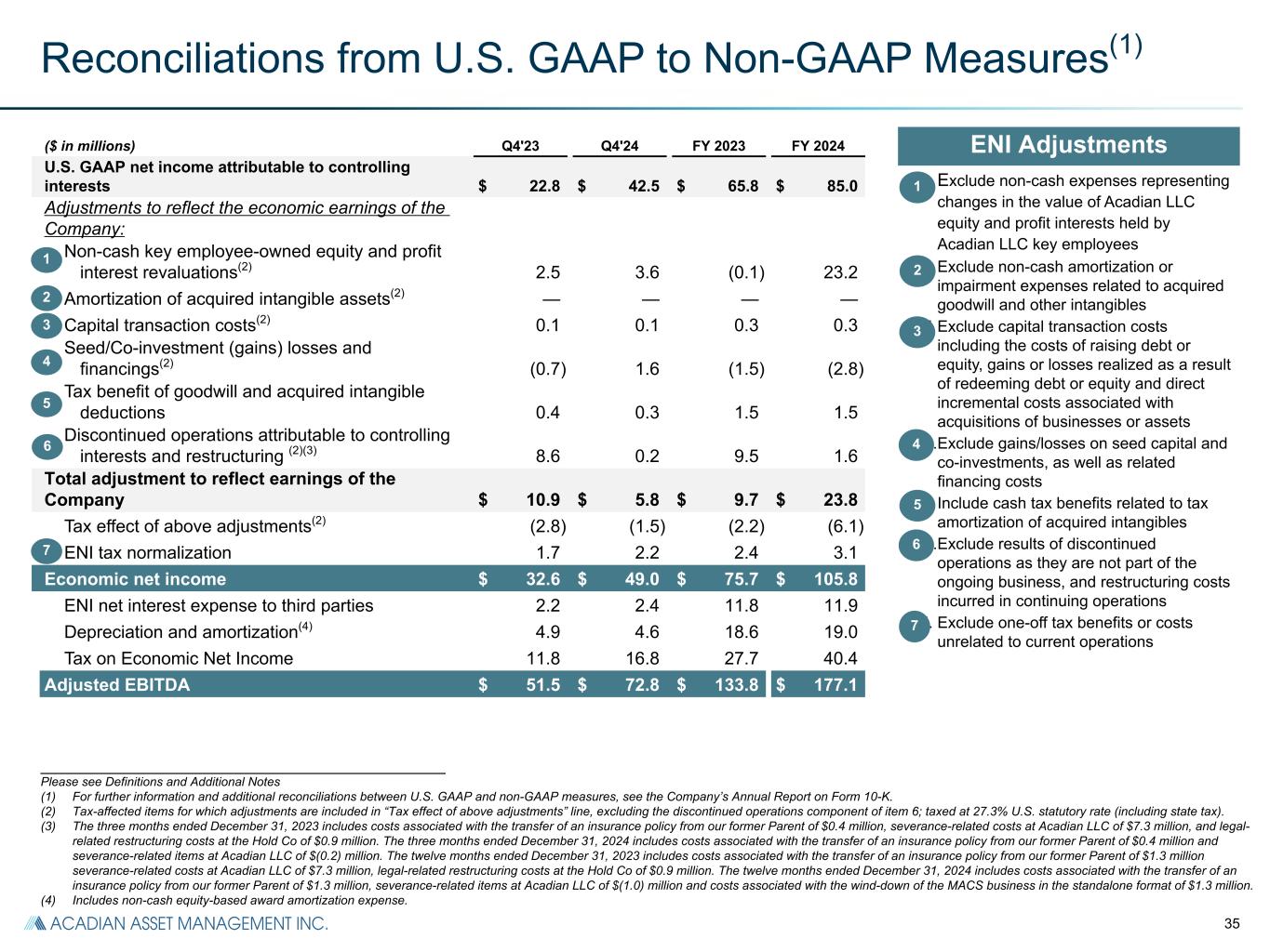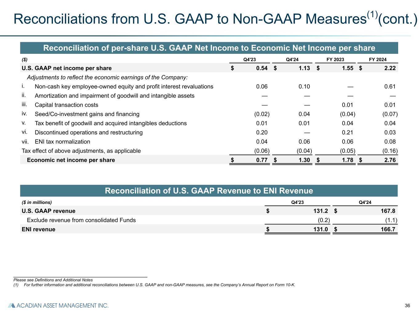 35 ($ in millions) Q4'23 Q4'24 FY 2023 FY 2024 U.S. GAAP net income attributable to controlling interests $ 22.8 $ 42.5 $ 65.8 $ 85.0 Adjustments to reflect the economic earnings of the Company: Non-cash key employee-owned equity and profit interest revaluations(2) 2.5 3.6 (0.1) 23.2 Amortization of acquired intangible assets(2) — — — — Capital transaction costs(2) 0.1 0.1 0.3 0.3 Seed/Co-investment (gains) losses and financings(2) (0.7) 1.6 (1.5) (2.8) Tax benefit of goodwill and acquired intangible deductions 0.4 0.3 1.5 1.5 Discontinued operations attributable to controlling interests and restructuring (2)(3) 8.6 0.2 9.5 1.6 Total adjustment to reflect earnings of the Company $ 10.9 $ 5.8 $ 9.7 $ 23.8 Tax effect of above adjustments(2) (2.8) (1.5) (2.2) (6.1) ENI tax normalization 1.7 2.2 2.4 3.1 Economic net income $ 32.6 $ 49.0 $ 75.7 $ 105.8 ENI net interest expense to third parties 2.2 2.4 11.8 11.9 Depreciation and amortization(4) 4.9 4.6 18.6 19.0 Tax on Economic Net Income 11.8 16.8 27.7 40.4 Adjusted EBITDA $ 51.5 $ 72.8 $ 133.8 $ 177.1 Reconciliations from U.S. GAAP to Non-GAAP Measures(1) i. Exclude non-cash expenses representing changes in the value of Acadian LLC equity and profit interests held by Acadian LLC key employees ii. Exclude non-cash amortization or impairment expenses related to acquired goodwill and other intangibles iii.Exclude capital transaction costs including the costs of raising debt or equity, gains or losses realized as a result of redeeming debt or equity and direct incremental costs associated with acquisitions of businesses or assets iv.Exclude gains/losses on seed capital and co-investments, as well as related financing costs v. Include cash tax benefits related to tax amortization of acquired intangibles vi.Exclude results of discontinued operations as they are not part of the ongoing business, and restructuring costs incurred in continuing operations vii. Exclude one-off tax benefits or costs unrelated to current operations ENI Adjustments 1 3 2 3 4 5 7 6 2 1 4 5 6 7 ___________________________________________________________ Please see Definitions and Additional Notes (1) For further information and additional reconciliations between U.S. GAAP and non-GAAP measures, see the Company’s Annual Report on Form 10-K. (2) Tax-affected items for which adjustments are included in “Tax effect of above adjustments” line, excluding the discontinued operations component of item 6; taxed at 27.3% U.S. statutory rate (including state tax). (3) The three months ended December 31, 2023 includes costs associated with the transfer of an insurance policy from our former Parent of $0.4 million, severance-related costs at Acadian LLC of $7.3 million, and legal- related restructuring costs at the Hold Co of $0.9 million. The three months ended December 31, 2024 includes costs associated with the transfer of an insurance policy from our former Parent of $0.4 million and severance-related items at Acadian LLC of $(0.2) million. The twelve months ended December 31, 2023 includes costs associated with the transfer of an insurance policy from our former Parent of $1.3 million severance-related costs at Acadian LLC of $7.3 million, legal-related restructuring costs at the Hold Co of $0.9 million. The twelve months ended December 31, 2024 includes costs associated with the transfer of an insurance policy from our former Parent of $1.3 million, severance-related items at Acadian LLC of $(1.0) million and costs associated with the wind-down of the MACS business in the standalone format of $1.3 million. (4) Includes non-cash equity-based award amortization expense.