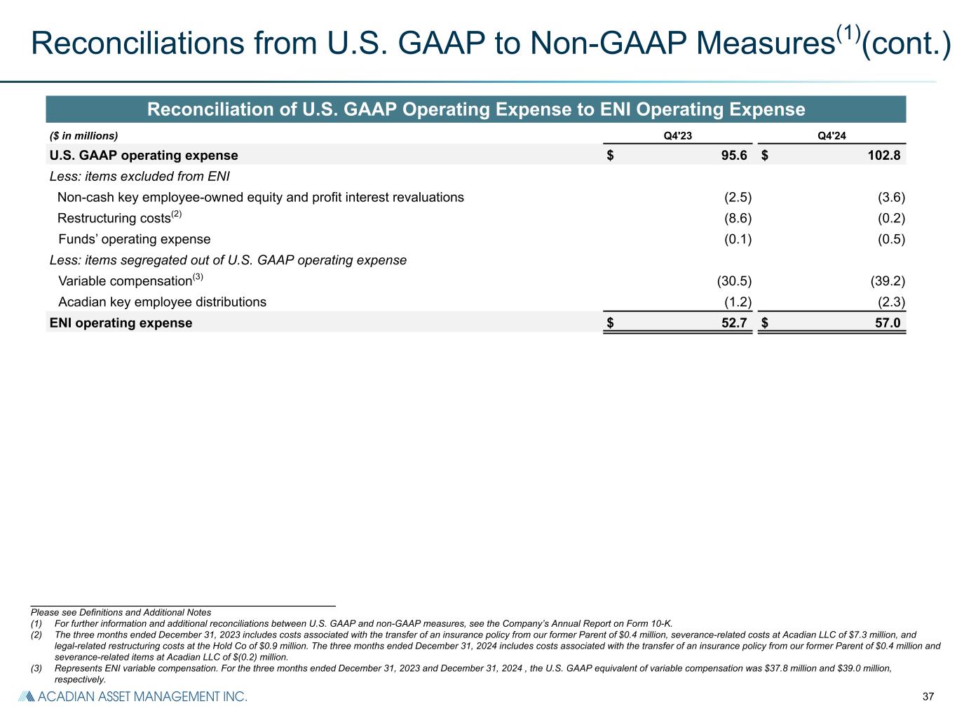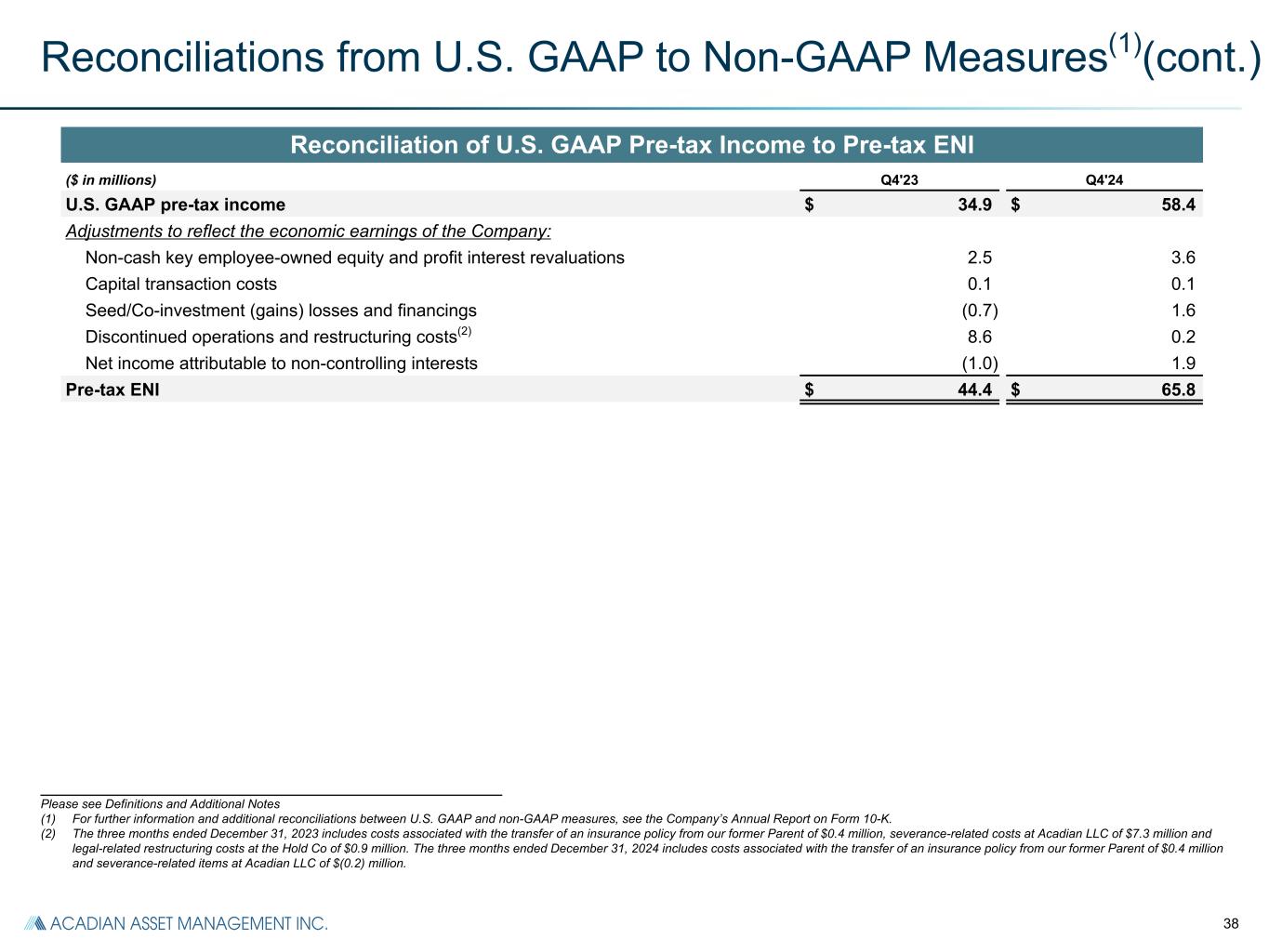 37 Reconciliations from U.S. GAAP to Non-GAAP Measures(1)(cont.) Reconciliation of U.S. GAAP Operating Expense to ENI Operating Expense ($ in millions) Q4'23 Q4'24 U.S. GAAP operating expense $ 95.6 $ 102.8 Less: items excluded from ENI Non-cash key employee-owned equity and profit interest revaluations (2.5) (3.6) Restructuring costs(2) (8.6) (0.2) Funds’ operating expense (0.1) (0.5) Less: items segregated out of U.S. GAAP operating expense Variable compensation(3) (30.5) (39.2) Acadian key employee distributions (1.2) (2.3) ENI operating expense $ 52.7 $ 57.0 ___________________________________________________________ Please see Definitions and Additional Notes (1) For further information and additional reconciliations between U.S. GAAP and non-GAAP measures, see the Company’s Annual Report on Form 10-K. (2) The three months ended December 31, 2023 includes costs associated with the transfer of an insurance policy from our former Parent of $0.4 million, severance-related costs at Acadian LLC of $7.3 million, and legal-related restructuring costs at the Hold Co of $0.9 million. The three months ended December 31, 2024 includes costs associated with the transfer of an insurance policy from our former Parent of $0.4 million and severance-related items at Acadian LLC of $(0.2) million. (3) Represents ENI variable compensation. For the three months ended December 31, 2023 and December 31, 2024 , the U.S. GAAP equivalent of variable compensation was $37.8 million and $39.0 million, respectively.