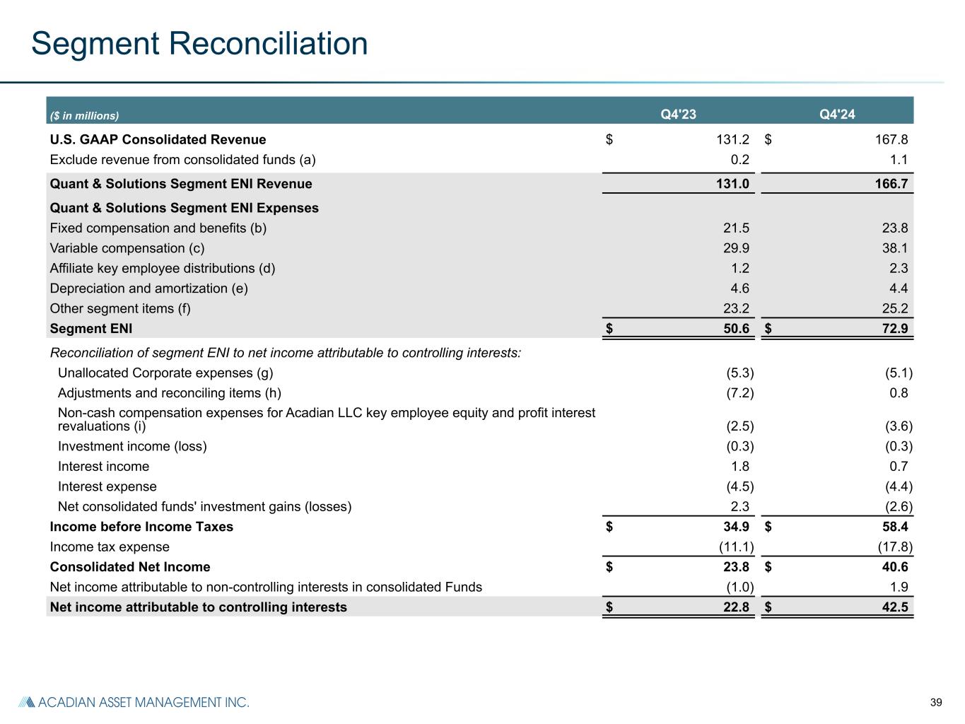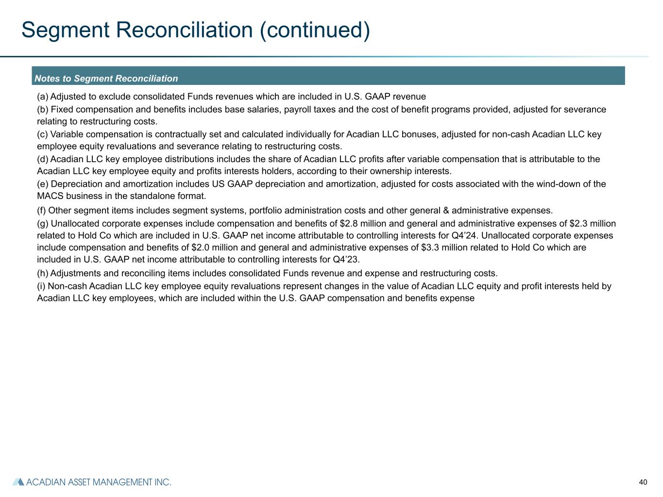 39 Segment Reconciliation ($ in millions) Q4'23 Q4'24 U.S. GAAP Consolidated Revenue $ 131.2 $ 167.8 Exclude revenue from consolidated funds (a) 0.2 1.1 Quant & Solutions Segment ENI Revenue 131.0 166.7 Quant & Solutions Segment ENI Expenses Fixed compensation and benefits (b) 21.5 23.8 Variable compensation (c) 29.9 38.1 Affiliate key employee distributions (d) 1.2 2.3 Depreciation and amortization (e) 4.6 4.4 Other segment items (f) 23.2 25.2 Segment ENI $ 50.6 $ 72.9 Reconciliation of segment ENI to net income attributable to controlling interests: Unallocated Corporate expenses (g) (5.3) (5.1) Adjustments and reconciling items (h) (7.2) 0.8 Non-cash compensation expenses for Acadian LLC key employee equity and profit interest revaluations (i) (2.5) (3.6) Investment income (loss) (0.3) (0.3) Interest income 1.8 0.7 Interest expense (4.5) (4.4) Net consolidated funds' investment gains (losses) 2.3 (2.6) Income before Income Taxes $ 34.9 $ 58.4 Income tax expense (11.1) (17.8) Consolidated Net Income $ 23.8 $ 40.6 Net income attributable to non-controlling interests in consolidated Funds (1.0) 1.9 Net income attributable to controlling interests $ 22.8 $ 42.5