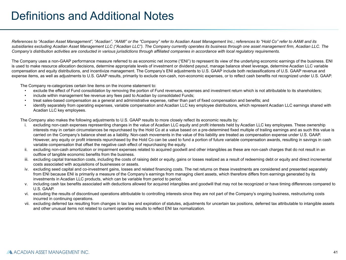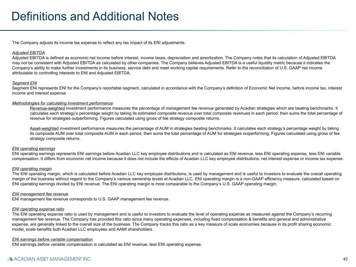 41 References to “Acadian Asset Management”, “Acadian”, “AAMI” or the “Company” refer to Acadian Asset Management Inc.; references to “Hold Co” refer to AAMI and its subsidiaries excluding Acadian Asset Management LLC (“Acadian LLC”). The Company currently operates its business through one asset management firm, Acadian LLC. The Company’s distribution activities are conducted in various jurisdictions through affiliated companies in accordance with local regulatory requirements. The Company uses a non-GAAP performance measure referred to as economic net income (“ENI”) to represent its view of the underlying economic earnings of the business. ENI is used to make resource allocation decisions, determine appropriate levels of investment or dividend payout, manage balance sheet leverage, determine Acadian LLC variable compensation and equity distributions, and incentivize management. The Company’s ENI adjustments to U.S. GAAP include both reclassifications of U.S. GAAP revenue and expense items, as well as adjustments to U.S. GAAP results, primarily to exclude non-cash, non-economic expenses, or to reflect cash benefits not recognized under U.S. GAAP. The Company re-categorizes certain line items on the income statement to: • exclude the effect of Fund consolidation by removing the portion of Fund revenues, expenses and investment return which is not attributable to its shareholders; • include within management fee revenue any fees paid to Acadian by consolidated Funds; • treat sales-based compensation as a general and administrative expense, rather than part of fixed compensation and benefits; and • identify separately from operating expenses, variable compensation and Acadian LLC key employee distributions, which represent Acadian LLC earnings shared with Acadian LLC key employees. The Company also makes the following adjustments to U.S. GAAP results to more closely reflect its economic results by: i. excluding non-cash expenses representing changes in the value of Acadian LLC equity and profit interests held by Acadian LLC key employees. These ownership interests may in certain circumstances be repurchased by the Hold Co at a value based on a pre-determined fixed multiple of trailing earnings and as such this value is carried on the Company’s balance sheet as a liability. Non-cash movements in the value of this liability are treated as compensation expense under U.S. GAAP. However, any equity or profit interests repurchased by the Hold Co can be used to fund a portion of future variable compensation awards, resulting in savings in cash variable compensation that offset the negative cash effect of repurchasing the equity. ii. excluding non-cash amortization or impairment expenses related to acquired goodwill and other intangibles as these are non-cash charges that do not result in an outflow of tangible economic benefits from the business. iii. excluding capital transaction costs, including the costs of raising debt or equity, gains or losses realized as a result of redeeming debt or equity and direct incremental costs associated with acquisitions of businesses or assets. iv. excluding seed capital and co-investment gains, losses and related financing costs. The net returns on these investments are considered and presented separately from ENI because ENI is primarily a measure of the Company’s earnings from managing client assets, which therefore differs from earnings generated by its investments in Acadian LLC products, which can be variable from period to period. v. including cash tax benefits associated with deductions allowed for acquired intangibles and goodwill that may not be recognized or have timing differences compared to U.S. GAAP. vi. excluding the results of discontinued operations attributable to controlling interests since they are not part of the Company’s ongoing business, restructuring costs incurred in continuing operations. vii. excluding deferred tax resulting from changes in tax law and expiration of statutes, adjustments for uncertain tax positions, deferred tax attributable to intangible assets and other unusual items not related to current operating results to reflect ENI tax normalization. Definitions and Additional Notes