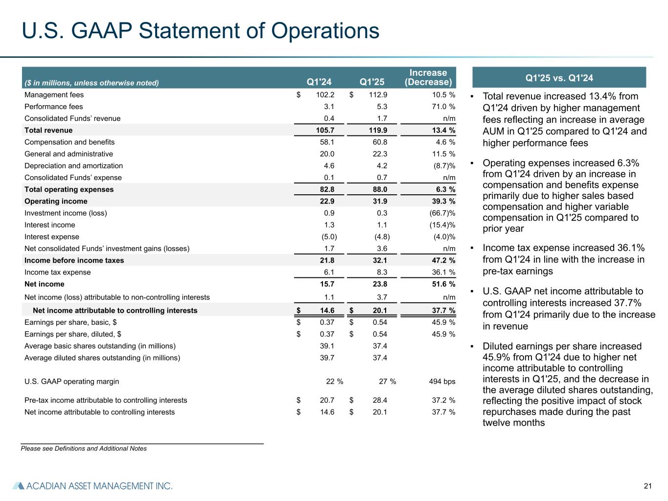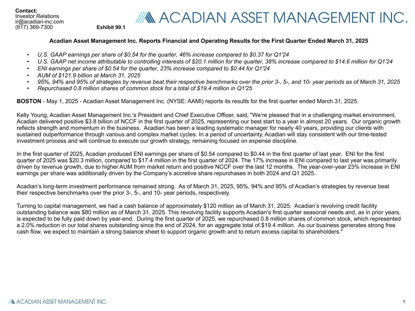 1 Acadian Asset Management Inc. Reports Financial and Operating Results for the First Quarter Ended March 31, 2025 • U.S. GAAP earnings per share of $0.54 for the quarter, 46% increase compared to $0.37 for Q1'24 • U.S. GAAP net income attributable to controlling interests of $20.1 million for the quarter, 38% increase compared to $14.6 million for Q1'24 • ENI earnings per share of $0.54 for the quarter, 23% increase compared to $0.44 for Q1'24 • AUM of $121.9 billion at March 31, 2025 • 95%, 94% and 95% of strategies by revenue beat their respective benchmarks over the prior 3-, 5-, and 10- year periods as of March 31, 2025 • Repurchased 0.8 million shares of common stock for a total of $19.4 million in Q1'25 BOSTON - May 1, 2025 - Acadian Asset Management Inc. (NYSE: AAMI) reports its results for the first quarter ended March 31, 2025. Kelly Young, Acadian Asset Management Inc.’s President and Chief Executive Officer, said, "We’re pleased that in a challenging market environment, Acadian delivered positive $3.8 billion of NCCF in the first quarter of 2025, representing our best start to a year in almost 20 years. Our organic growth reflects strength and momentum in the business. Acadian has been a leading systematic manager for nearly 40 years, providing our clients with sustained outperformance through various and complex market cycles. In a period of uncertainty, Acadian will stay consistent with our time-tested investment process and will continue to execute our growth strategy, remaining focused on expense discipline. In the first quarter of 2025, Acadian produced ENI earnings per share of $0.54 compared to $0.44 in the first quarter of last year. ENI for the first quarter of 2025 was $20.3 million, compared to $17.4 million in the first quarter of 2024. The 17% increase in ENI compared to last year was primarily driven by revenue growth, due to higher AUM from market return and positive NCCF over the last 12 months. The year-over-year 23% increase in ENI earnings per share was additionally driven by the Company’s accretive share repurchases in both 2024 and Q1 2025. Acadian’s long-term investment performance remained strong. As of March 31, 2025, 95%, 94% and 95% of Acadian’s strategies by revenue beat their respective benchmarks over the prior 3-, 5-, and 10- year periods, respectively. Turning to capital management, we had a cash balance of approximately $120 million as of March 31, 2025. Acadian’s revolving credit facility outstanding balance was $80 million as of March 31, 2025. This revolving facility supports Acadian’s first quarter seasonal needs and, as in prior years, is expected to be fully paid down by year-end. During the first quarter of 2025, we repurchased 0.8 million shares of common stock, which represented a 2.0% reduction in our total shares outstanding since the end of 2024, for an aggregate total of $19.4 million. As our business generates strong free cash flow, we expect to maintain a strong balance sheet to support organic growth and to return excess capital to shareholders." Contact: Investor Relations ir@acadian-inc.com (617) 369-7300 Exhibit 99.1