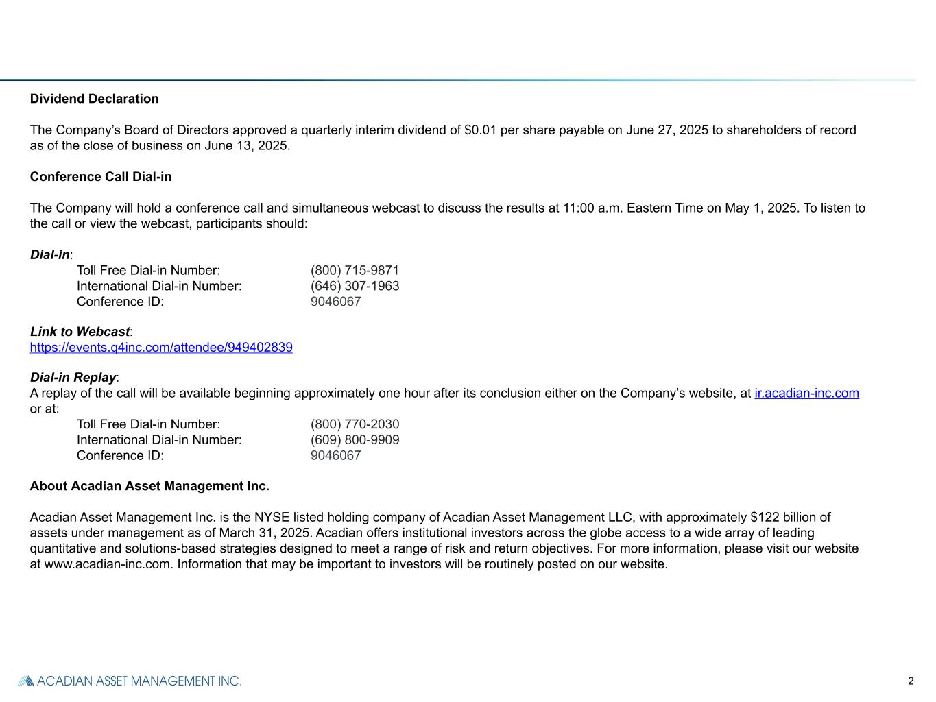 2 Dividend Declaration The Company’s Board of Directors approved a quarterly interim dividend of $0.01 per share payable on June 27, 2025 to shareholders of record as of the close of business on June 13, 2025. Conference Call Dial-in The Company will hold a conference call and simultaneous webcast to discuss the results at 11:00 a.m. Eastern Time on May 1, 2025. To listen to the call or view the webcast, participants should: Dial-in: Toll Free Dial-in Number: (800) 715-9871 International Dial-in Number: (646) 307-1963 Conference ID: 9046067 Link to Webcast: https://events.q4inc.com/attendee/949402839 Dial-in Replay: A replay of the call will be available beginning approximately one hour after its conclusion either on the Company’s website, at ir.acadian-inc.com or at: Toll Free Dial-in Number: (800) 770-2030 International Dial-in Number: (609) 800-9909 Conference ID: 9046067 About Acadian Asset Management Inc. Acadian Asset Management Inc. is the NYSE listed holding company of Acadian Asset Management LLC, with approximately $122 billion of assets under management as of March 31, 2025. Acadian offers institutional investors across the globe access to a wide array of leading quantitative and solutions-based strategies designed to meet a range of risk and return objectives. For more information, please visit our website at www.acadian-inc.com. Information that may be important to investors will be routinely posted on our website.