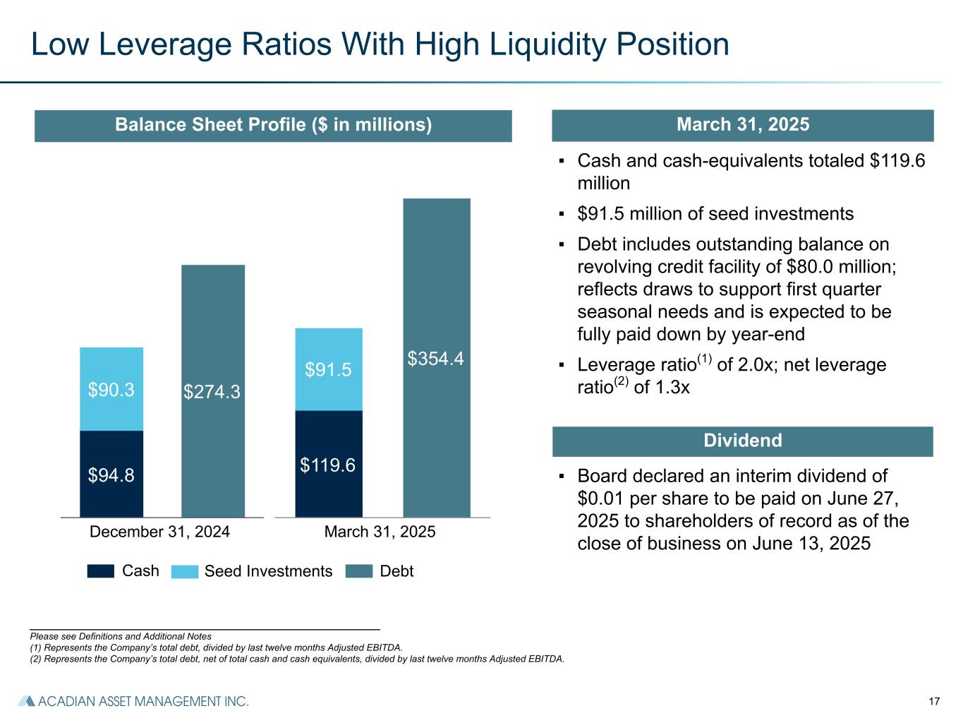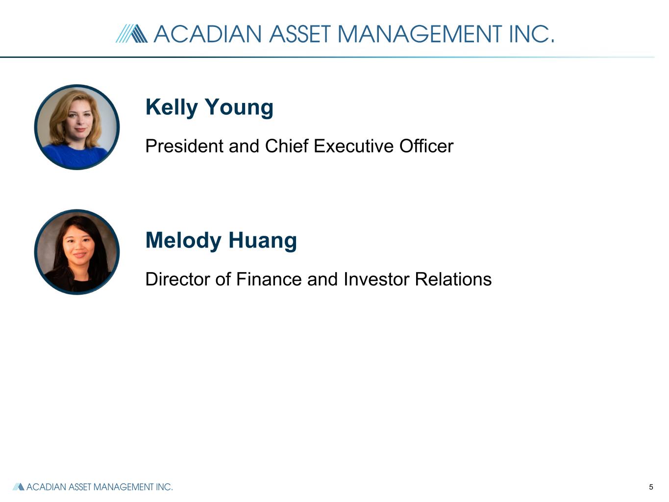 3 Forward-Looking Statements This communication includes forward-looking statements which may include, from time to time, anticipated revenues, margins, operating expense, variable compensation and distribution ratios, cash flows or earnings growth profile, expectations regarding investment process, expectations regarding investment process, anticipated performance and growth of the Company’s business going forward, expected AUM growth, expected sector trends and their potential impact, expected future net cash flows, expected uses of capital, including expectations for paying down our revolving credit facility, and capital management, including expectations regarding market conditions and returning capital to shareholders. The words or phrases ‘‘will likely result,’’ ‘‘are expected to,’’ ‘‘will continue,’’ ‘‘is anticipated,’’ ‘‘can be,’’ ‘‘may be,’’ ‘‘aim to,’’ ‘‘may affect,’’ ‘‘may depend,’’ ‘‘intends,’’ ‘‘expects,’’ ‘‘believes,’’ ‘‘estimate,’’ ‘‘project,’’ and other similar expressions are intended to identify such forward-looking statements. Such statements are subject to various known and unknown risks and uncertainties and readers should be cautioned that any forward-looking information provided by or on behalf of the Company is not a guarantee of future performance. Actual results may differ materially from those in forward-looking information as a result of various factors, some of which are beyond the Company’s control, including but not limited to those discussed elsewhere in this communication. Additional factors that could cause actual results to differ from the forward-looking statements in this release include: our financial results are dependent on Acadian Asset Management LLC; our reliance on key personnel; our use of a limited number of investment strategies; our ability to attract and retain assets under management; the potential for losses on seed and co-investment capital; foreign currency exchange risk; risks associated with government regulation; and other facts that may be described in the Company's most recent Annual Report on Form 10-K filed with the Securities and Exchange Commission on February 27, 2025. Due to such risks and uncertainties and other factors, the Company cautions each person receiving such forward-looking information not to place undue reliance on such statements. Further, such forward-looking statements speak only as of the date of this communication and the Company undertakes no obligations to update any forward looking statement to reflect events or circumstances after the date of this communication or to reflect the occurrence of unanticipated events. This communication does not constitute an offer for any fund managed by the Company or any subsidiary of the Company. Non-GAAP Financial Measures This communication contains non-GAAP financial measures. Reconciliations of non-GAAP to GAAP financial measures, along with certain segment measures, are included in the Reconciliations and Disclosures section of this communication.