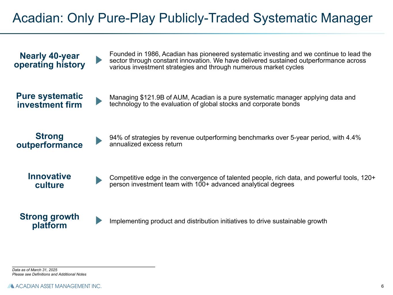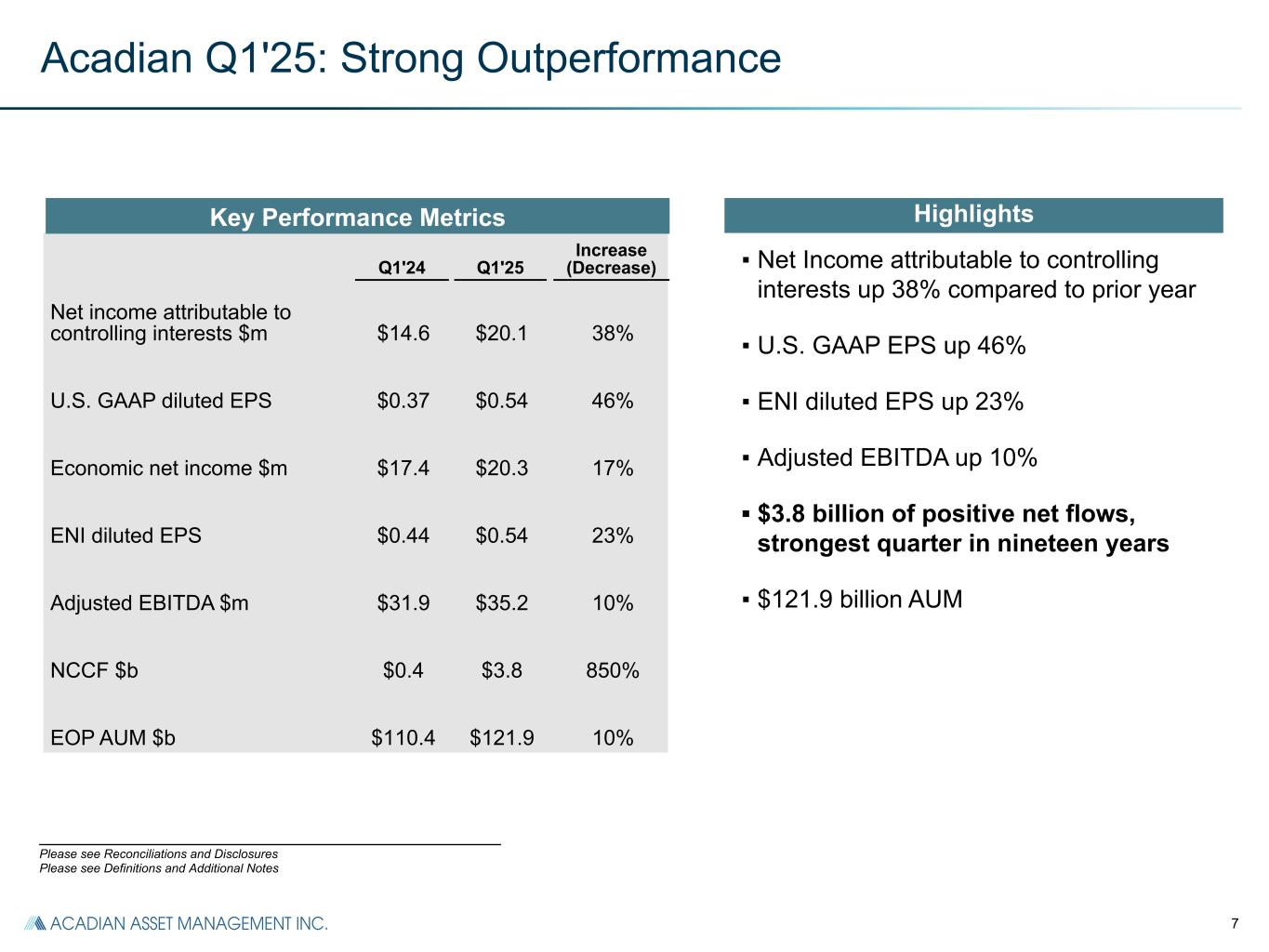 6 Nearly 40-year operating history Founded in 1986, Acadian has pioneered systematic investing and we continue to lead the sector through constant innovation. We have delivered sustained outperformance across various investment strategies and through numerous market cycles Pure systematic investment firm Managing $121.9B of AUM, Acadian is a pure systematic manager applying data and technology to the evaluation of global stocks and corporate bonds Strong outperformance 94% of strategies by revenue outperforming benchmarks over 5-year period, with 4.4% annualized excess return Innovative culture Competitive edge in the convergence of talented people, rich data, and powerful tools, 120+ person investment team with 100+ advanced analytical degrees Strong growth platform Implementing product and distribution initiatives to drive sustainable growth Acadian: Only Pure-Play Publicly-Traded Systematic Manager ___________________________________________________________ Data as of March 31, 2025 Please see Definitions and Additional Notes