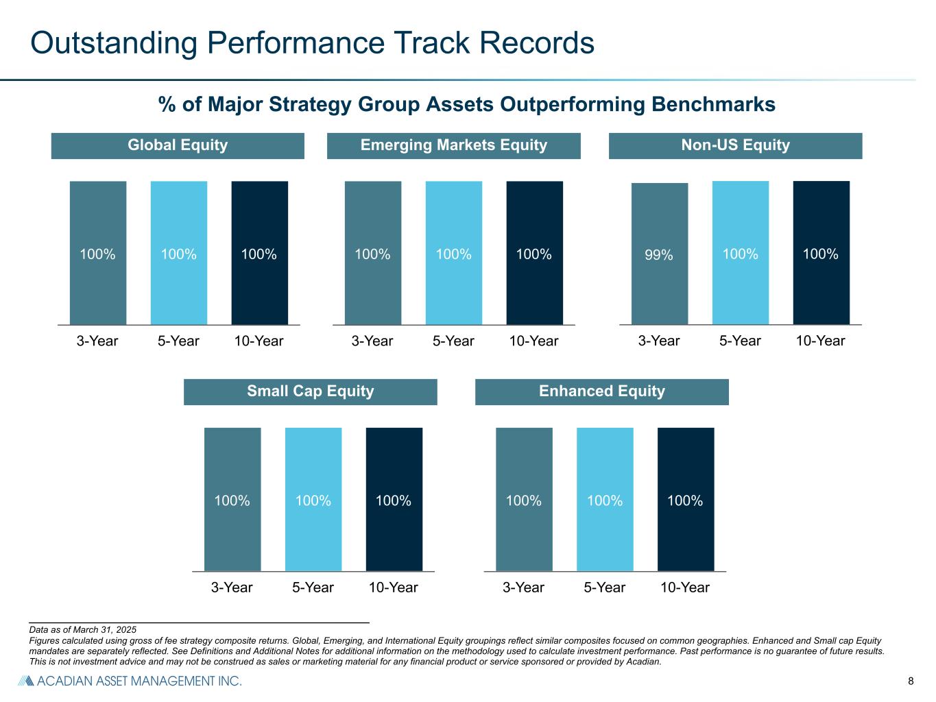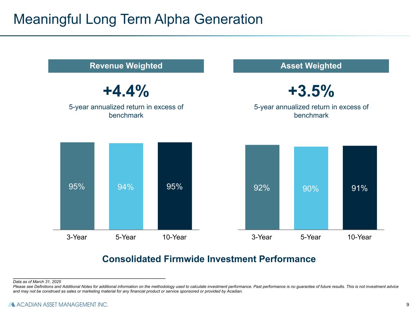 8 100% 100% 100% 3-Year 5-Year 10-Year 100% 100% 100% 3-Year 5-Year 10-Year 99% 100% 100% 3-Year 5-Year 10-Year 100% 100% 100% 3-Year 5-Year 10-Year 100% 100% 100% 3-Year 5-Year 10-Year Global Equity Outstanding Performance Track Records % of Major Strategy Group Assets Outperforming Benchmarks Emerging Markets Equity Non-US Equity Small Cap Equity Enhanced Equity ___________________________________________________________ Data as of March 31, 2025 Figures calculated using gross of fee strategy composite returns. Global, Emerging, and International Equity groupings reflect similar composites focused on common geographies. Enhanced and Small cap Equity mandates are separately reflected. See Definitions and Additional Notes for additional information on the methodology used to calculate investment performance. Past performance is no guarantee of future results. This is not investment advice and may not be construed as sales or marketing material for any financial product or service sponsored or provided by Acadian.