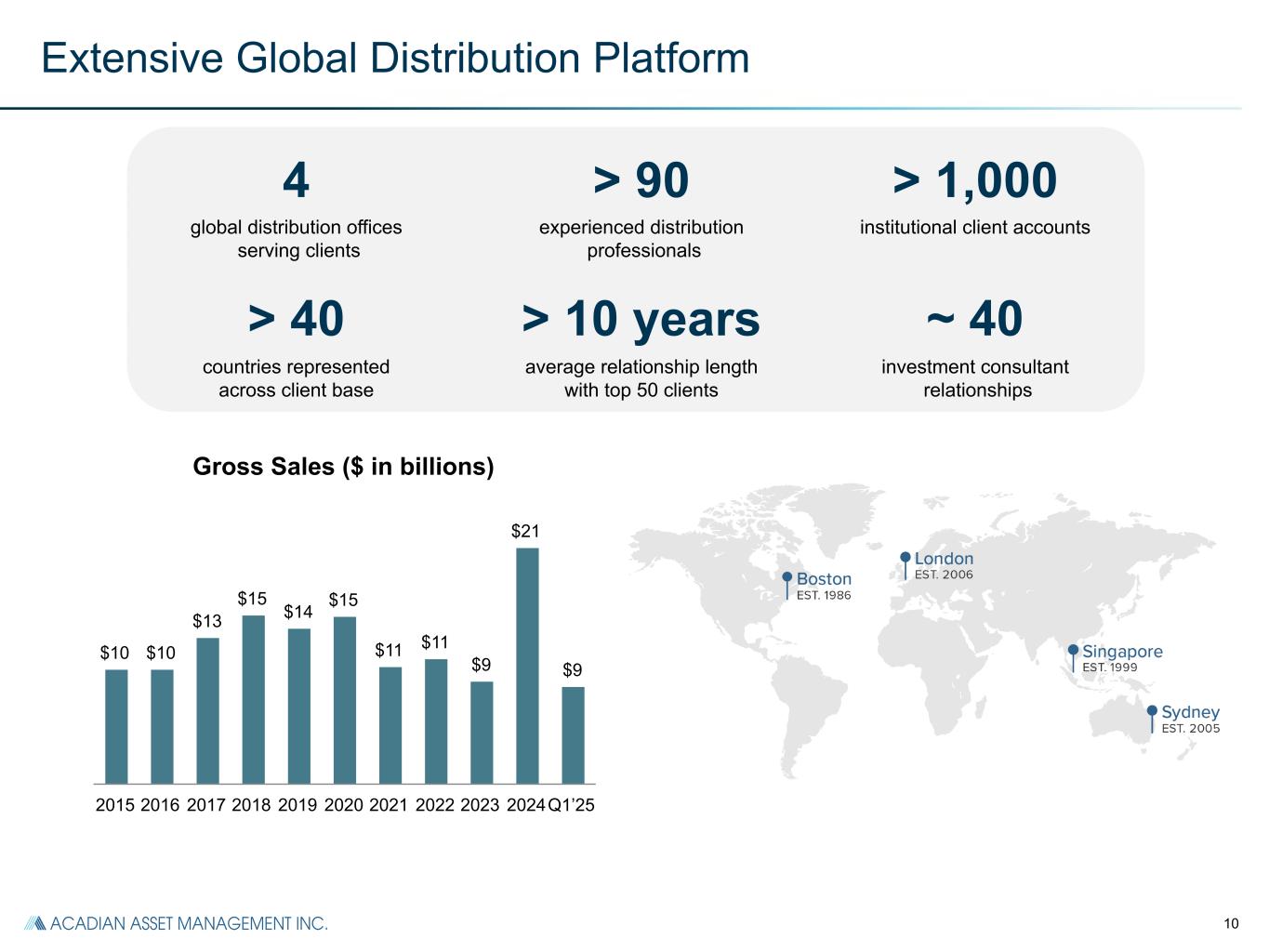 9 95% 94% 95% 3-Year 5-Year 10-Year Meaningful Long Term Alpha Generation 92% 90% 91% 3-Year 5-Year 10-Year +4.4% 5-year annualized return in excess of benchmark +3.5% 5-year annualized return in excess of benchmark Revenue Weighted Asset Weighted Consolidated Firmwide Investment Performance ___________________________________________________________ Data as of March 31, 2025 Please see Definitions and Additional Notes for additional information on the methodology used to calculate investment performance. Past performance is no guarantee of future results. This is not investment advice and may not be construed as sales or marketing material for any financial product or service sponsored or provided by Acadian.