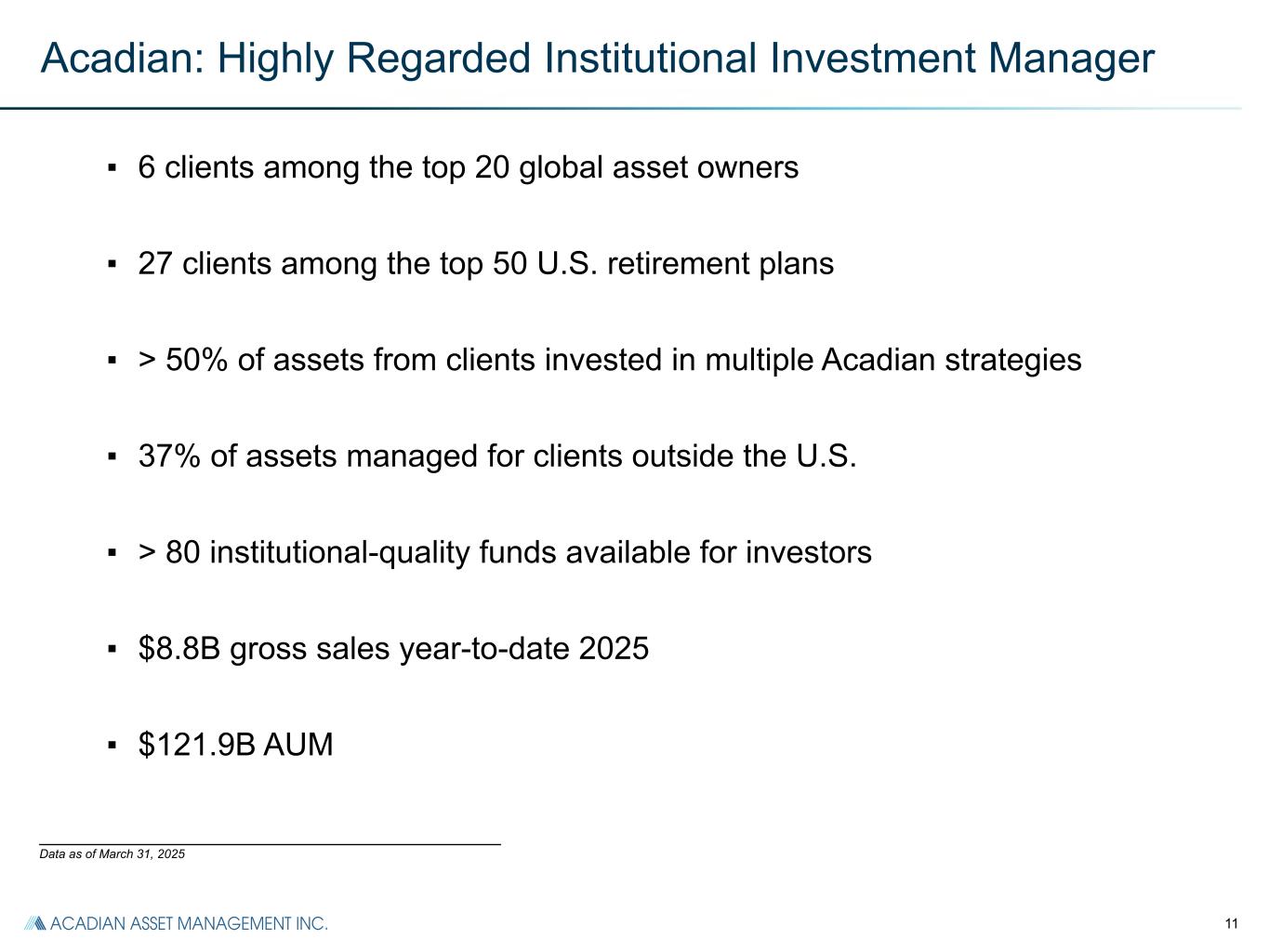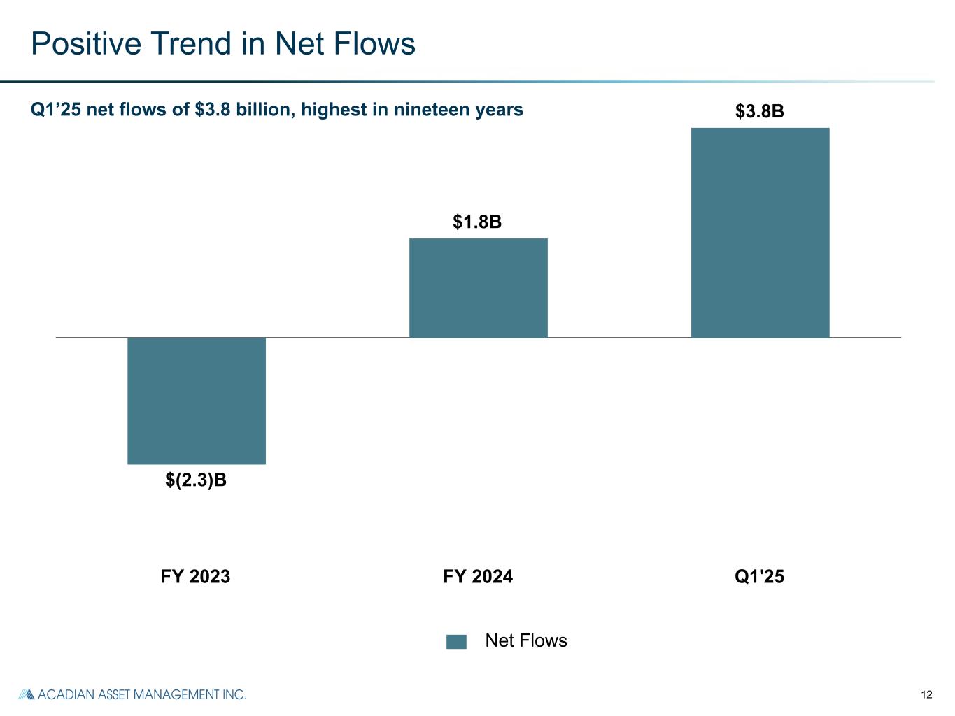 11 Acadian: Highly Regarded Institutional Investment Manager ▪ 6 clients among the top 20 global asset owners ▪ 27 clients among the top 50 U.S. retirement plans ▪ > 50% of assets from clients invested in multiple Acadian strategies ▪ 37% of assets managed for clients outside the U.S. ▪ > 80 institutional-quality funds available for investors ▪ $8.8B gross sales year-to-date 2025 ▪ $121.9B AUM ___________________________________________________________ Data as of March 31, 2025