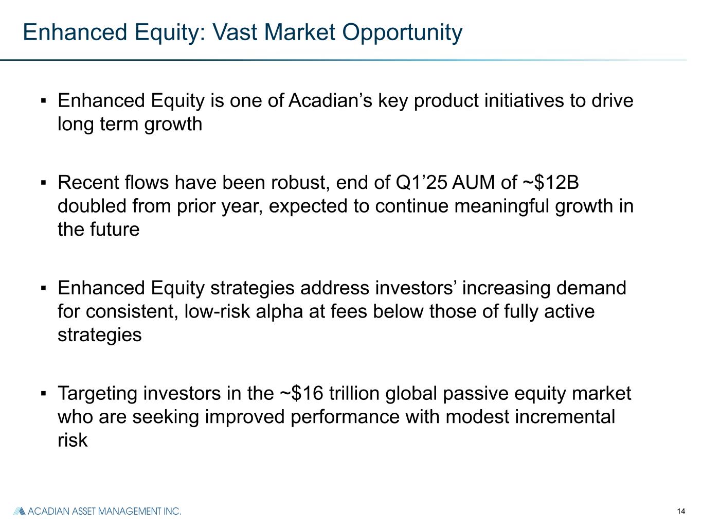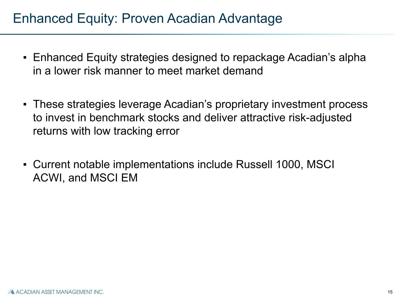 14 Enhanced Equity: Vast Market Opportunity ▪ Enhanced Equity is one of Acadian’s key product initiatives to drive long term growth ▪ Recent flows have been robust, end of Q1’25 AUM of ~$12B doubled from prior year, expected to continue meaningful growth in the future ▪ Enhanced Equity strategies address investors’ increasing demand for consistent, low-risk alpha at fees below those of fully active strategies ▪ Targeting investors in the ~$16 trillion global passive equity market who are seeking improved performance with modest incremental risk