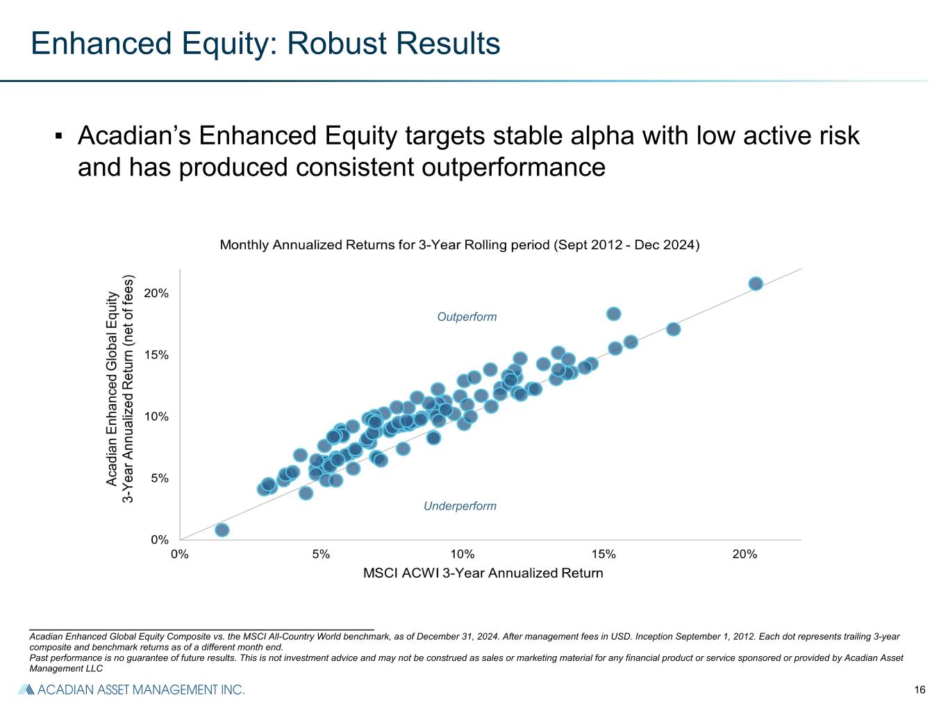 15 Enhanced Equity: Proven Acadian Advantage ▪ Enhanced Equity strategies designed to repackage Acadian’s alpha in a lower risk manner to meet market demand ▪ These strategies leverage Acadian’s proprietary investment process to invest in benchmark stocks and deliver attractive risk-adjusted returns with low tracking error ▪ Current notable implementations include Russell 1000, MSCI ACWI, and MSCI EM