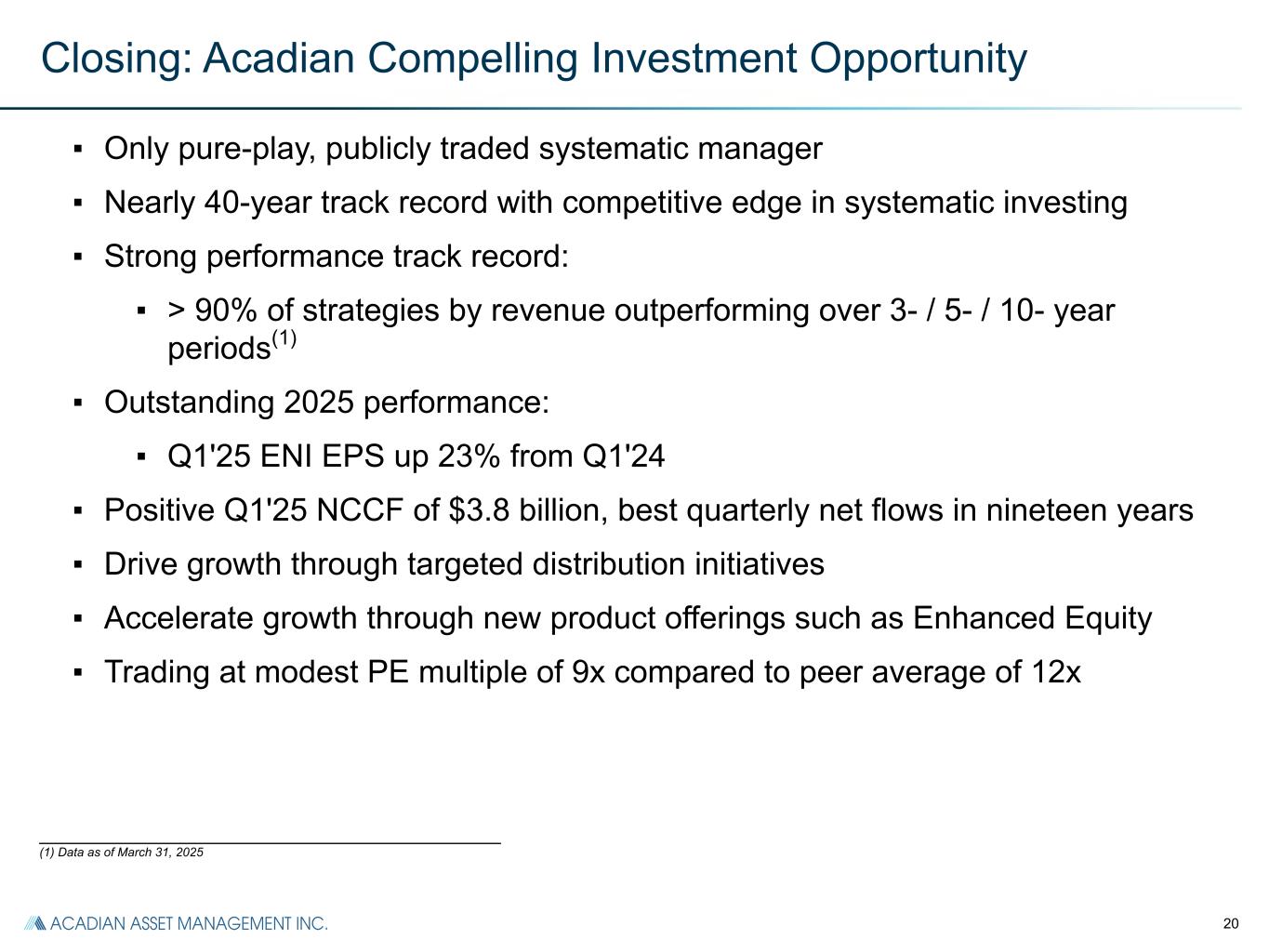 19 9x 12x AAMI Peer Average Acadian: Positioned for Multiple Expansion & Value Creation 33% Q1’25 LTM P/E Multiple ___________________________________________________________ AAMI calculation based on Q1’25 LTM ENI EPS and share price as of April 29, 2025 at $26.69 (increase 33% at peer average multiple of approximately 12x would be $35.50); Peer EPS based on Q1’25 LTM actuals and consensus estimates and share price as of April 29, 2025. Peers include BEN, VRTS, FHI, TROW, AMG, AB, IVZ, JHG, APAM, VCTR, WT, BLK, CNS $26.69 $35.50