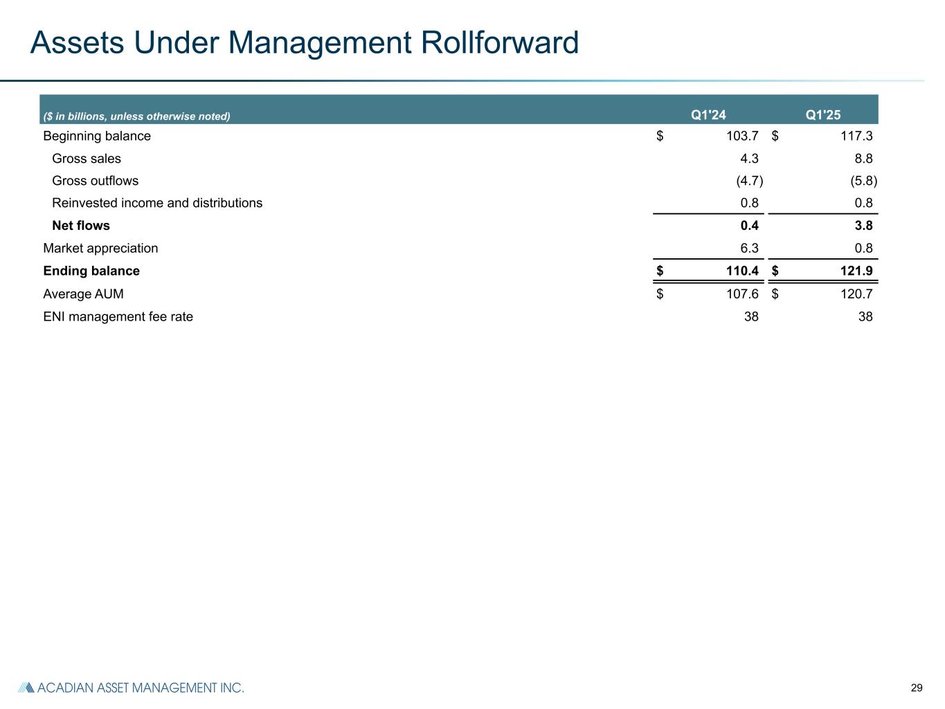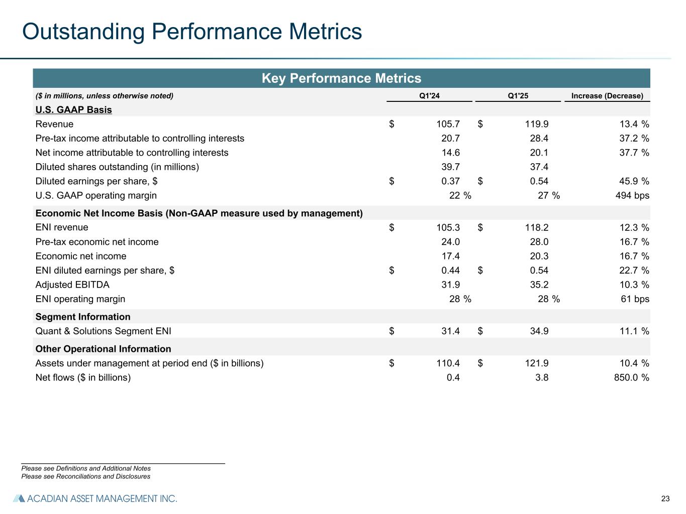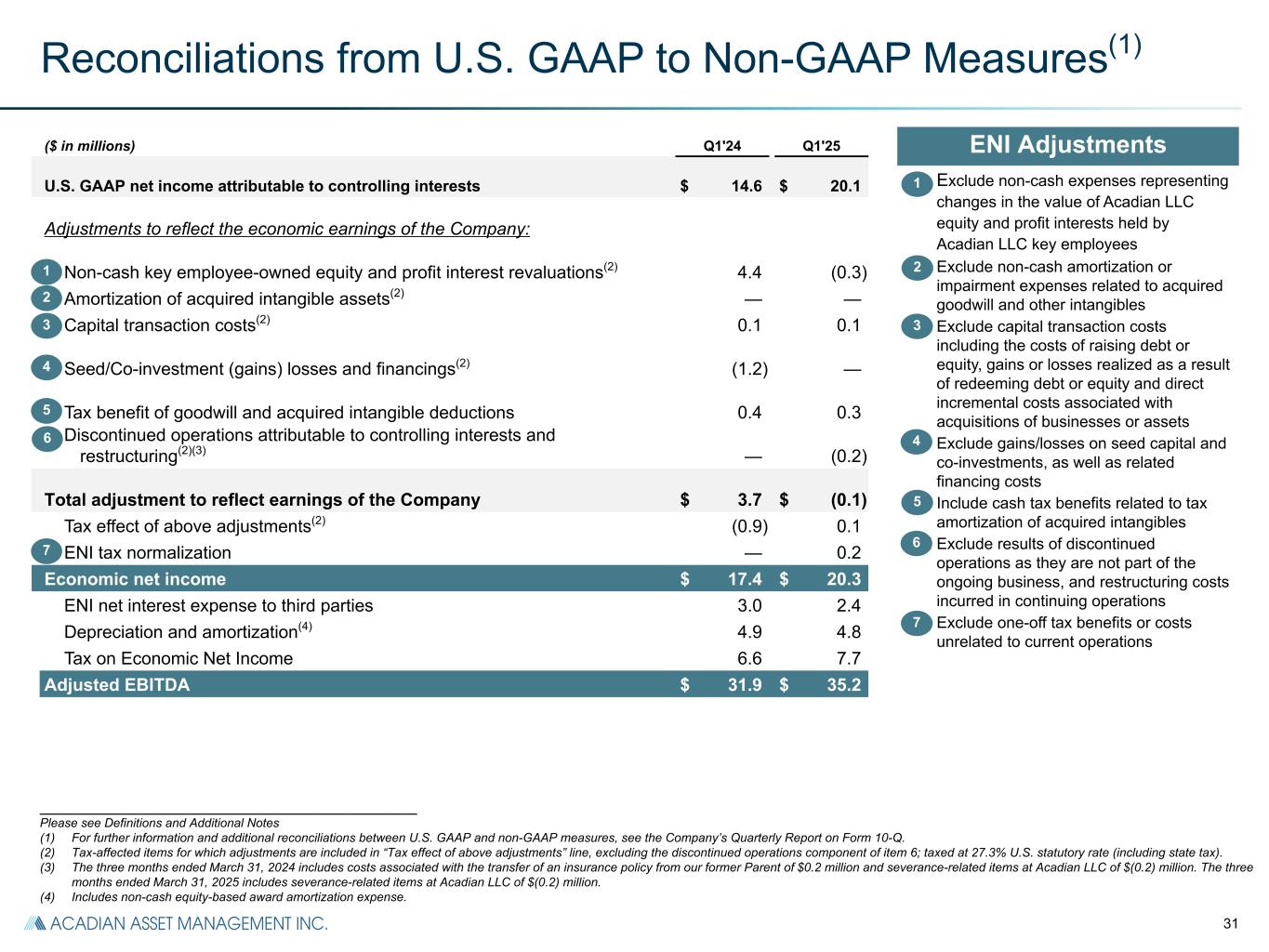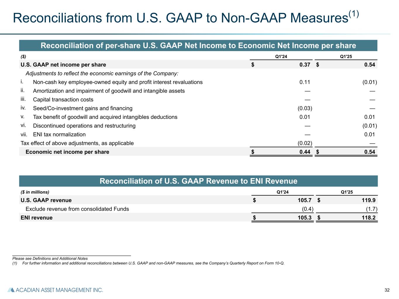 31 ($ in millions) Q1'24 Q1'25 U.S. GAAP net income attributable to controlling interests $ 14.6 $ 20.1 Adjustments to reflect the economic earnings of the Company: Non-cash key employee-owned equity and profit interest revaluations(2) 4.4 (0.3) Amortization of acquired intangible assets(2) — — Capital transaction costs(2) 0.1 0.1 Seed/Co-investment (gains) losses and financings(2) (1.2) — Tax benefit of goodwill and acquired intangible deductions 0.4 0.3 Discontinued operations attributable to controlling interests and restructuring(2)(3) — (0.2) Total adjustment to reflect earnings of the Company $ 3.7 $ (0.1) Tax effect of above adjustments(2) (0.9) 0.1 ENI tax normalization — 0.2 Economic net income $ 17.4 $ 20.3 ENI net interest expense to third parties 3.0 2.4 Depreciation and amortization(4) 4.9 4.8 Tax on Economic Net Income 6.6 7.7 Adjusted EBITDA $ 31.9 $ 35.2 Reconciliations from U.S. GAAP to Non-GAAP Measures(1) i Exclude non-cash expenses representing changes in the value of Acadian LLC equity and profit interests held by Acadian LLC key employees ii Exclude non-cash amortization or impairment expenses related to acquired goodwill and other intangibles iii Exclude capital transaction costs including the costs of raising debt or equity, gains or losses realized as a result of redeeming debt or equity and direct incremental costs associated with acquisitions of businesses or assets iv Exclude gains/losses on seed capital and co-investments, as well as related financing costs v Include cash tax benefits related to tax amortization of acquired intangibles vi Exclude results of discontinued operations as they are not part of the ongoing business, and restructuring costs incurred in continuing operations vii Exclude one-off tax benefits or costs unrelated to current operations ENI Adjustments 1 3 2 3 4 5 7 6 2 1 4 5 6 7 _______________________________________________________ Please see Definitions and Additional Notes (1) For further information and additional reconciliations between U.S. GAAP and non-GAAP measures, see the Company’s Quarterly Report on Form 10-Q. (2) Tax-affected items for which adjustments are included in “Tax effect of above adjustments” line, excluding the discontinued operations component of item 6; taxed at 27.3% U.S. statutory rate (including state tax). (3) The three months ended March 31, 2024 includes costs associated with the transfer of an insurance policy from our former Parent of $0.2 million and severance-related items at Acadian LLC of $(0.2) million. The three months ended March 31, 2025 includes severance-related items at Acadian LLC of $(0.2) million. (4) Includes non-cash equity-based award amortization expense.