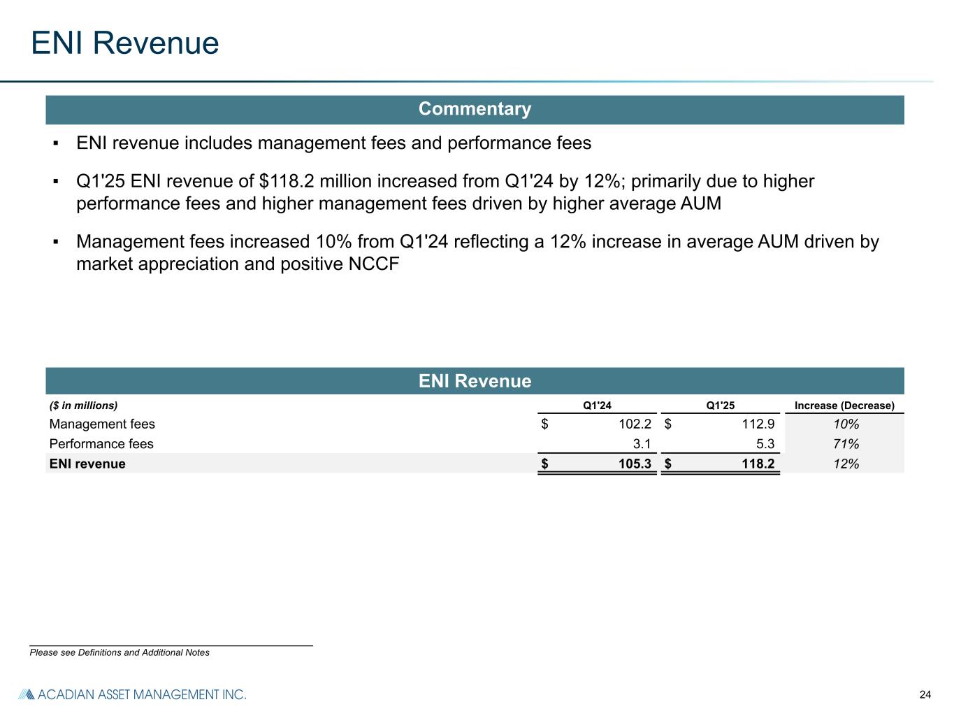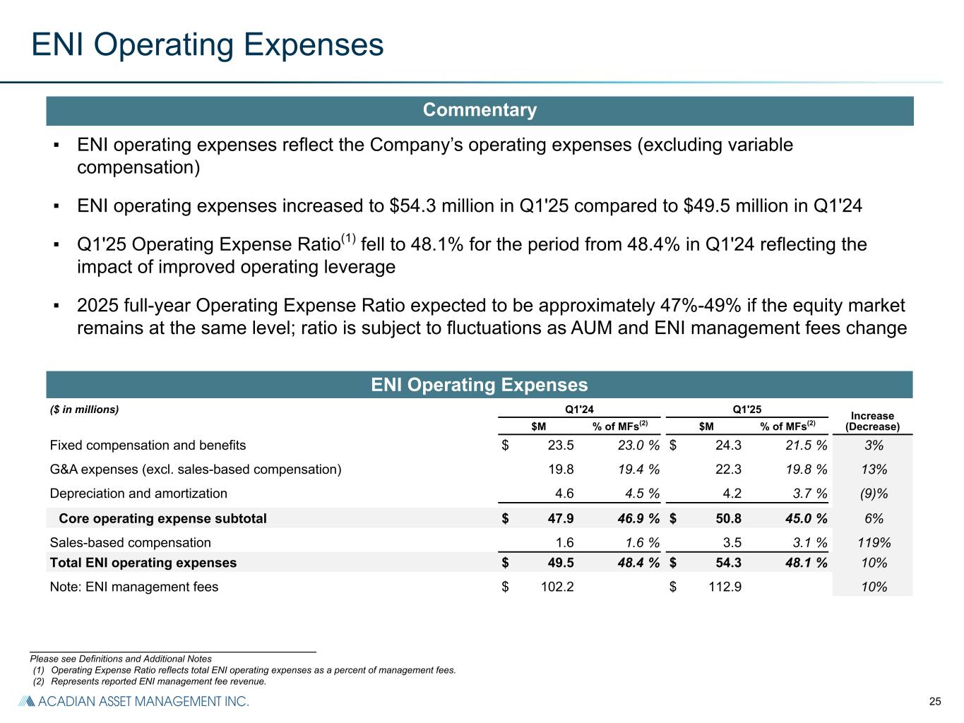 24 ENI Revenue ($ in millions) Q1'24 Q1'25 Increase (Decrease) Management fees $ 102.2 $ 112.9 10% Performance fees 3.1 5.3 71% ENI revenue $ 105.3 $ 118.2 12% ENI Revenue ▪ ENI revenue includes management fees and performance fees ▪ Q1'25 ENI revenue of $118.2 million increased from Q1'24 by 12%; primarily due to higher performance fees and higher management fees driven by higher average AUM ▪ Management fees increased 10% from Q1'24 reflecting a 12% increase in average AUM driven by market appreciation and positive NCCF Commentary _______________________________________________________ Please see Definitions and Additional Notes