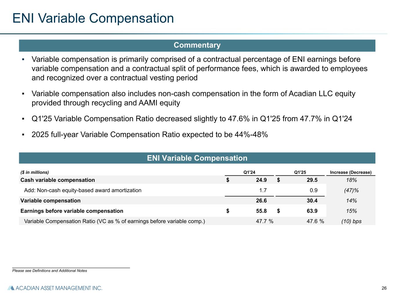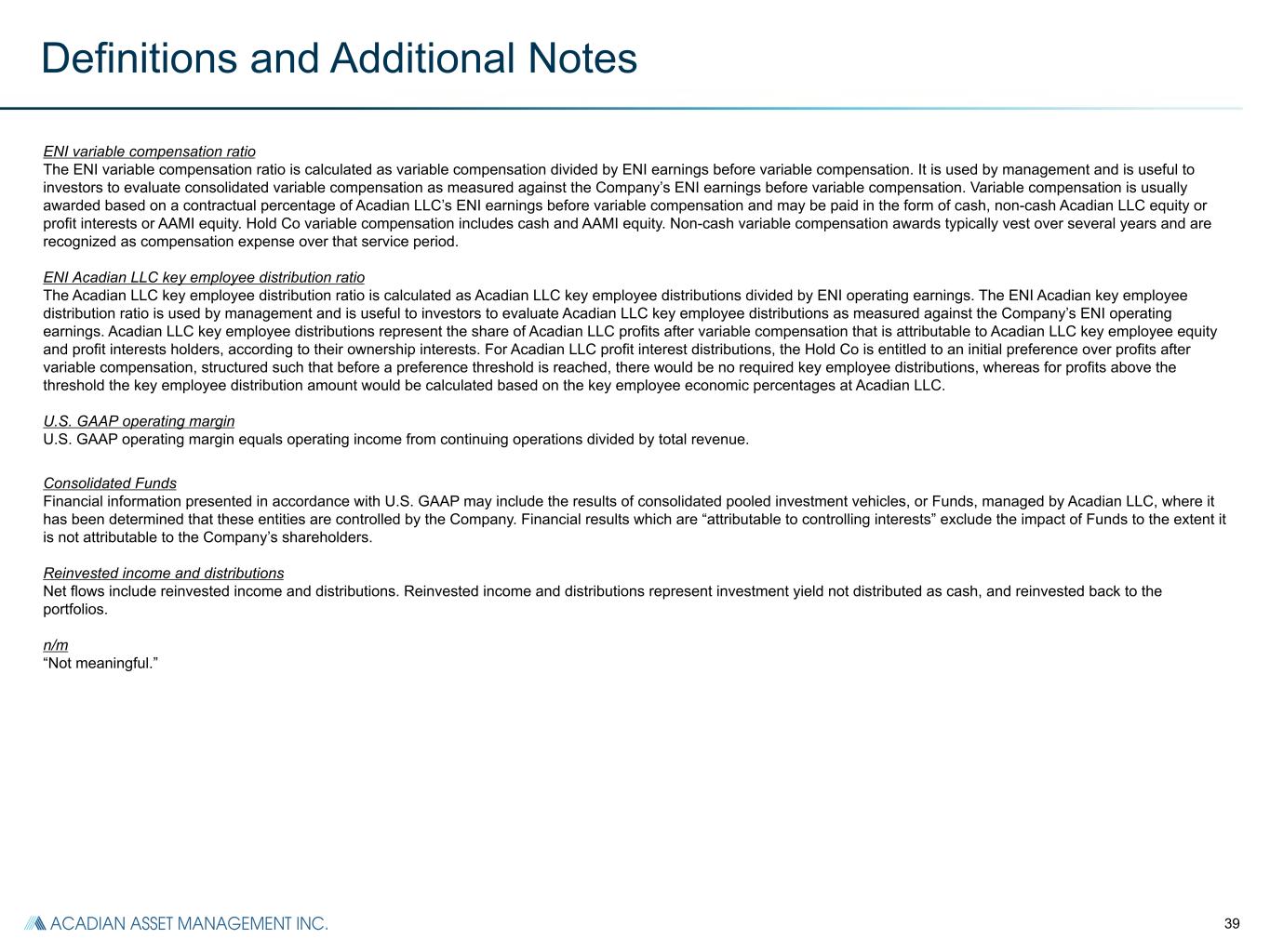 39 ENI variable compensation ratio The ENI variable compensation ratio is calculated as variable compensation divided by ENI earnings before variable compensation. It is used by management and is useful to investors to evaluate consolidated variable compensation as measured against the Company’s ENI earnings before variable compensation. Variable compensation is usually awarded based on a contractual percentage of Acadian LLC’s ENI earnings before variable compensation and may be paid in the form of cash, non-cash Acadian LLC equity or profit interests or AAMI equity. Hold Co variable compensation includes cash and AAMI equity. Non-cash variable compensation awards typically vest over several years and are recognized as compensation expense over that service period. ENI Acadian LLC key employee distribution ratio The Acadian LLC key employee distribution ratio is calculated as Acadian LLC key employee distributions divided by ENI operating earnings. The ENI Acadian key employee distribution ratio is used by management and is useful to investors to evaluate Acadian LLC key employee distributions as measured against the Company’s ENI operating earnings. Acadian LLC key employee distributions represent the share of Acadian LLC profits after variable compensation that is attributable to Acadian LLC key employee equity and profit interests holders, according to their ownership interests. For Acadian LLC profit interest distributions, the Hold Co is entitled to an initial preference over profits after variable compensation, structured such that before a preference threshold is reached, there would be no required key employee distributions, whereas for profits above the threshold the key employee distribution amount would be calculated based on the key employee economic percentages at Acadian LLC. U.S. GAAP operating margin U.S. GAAP operating margin equals operating income from continuing operations divided by total revenue. Consolidated Funds Financial information presented in accordance with U.S. GAAP may include the results of consolidated pooled investment vehicles, or Funds, managed by Acadian LLC, where it has been determined that these entities are controlled by the Company. Financial results which are “attributable to controlling interests” exclude the impact of Funds to the extent it is not attributable to the Company’s shareholders. Reinvested income and distributions Net flows include reinvested income and distributions. Reinvested income and distributions represent investment yield not distributed as cash, and reinvested back to the portfolios. n/m “Not meaningful.” Definitions and Additional Notes