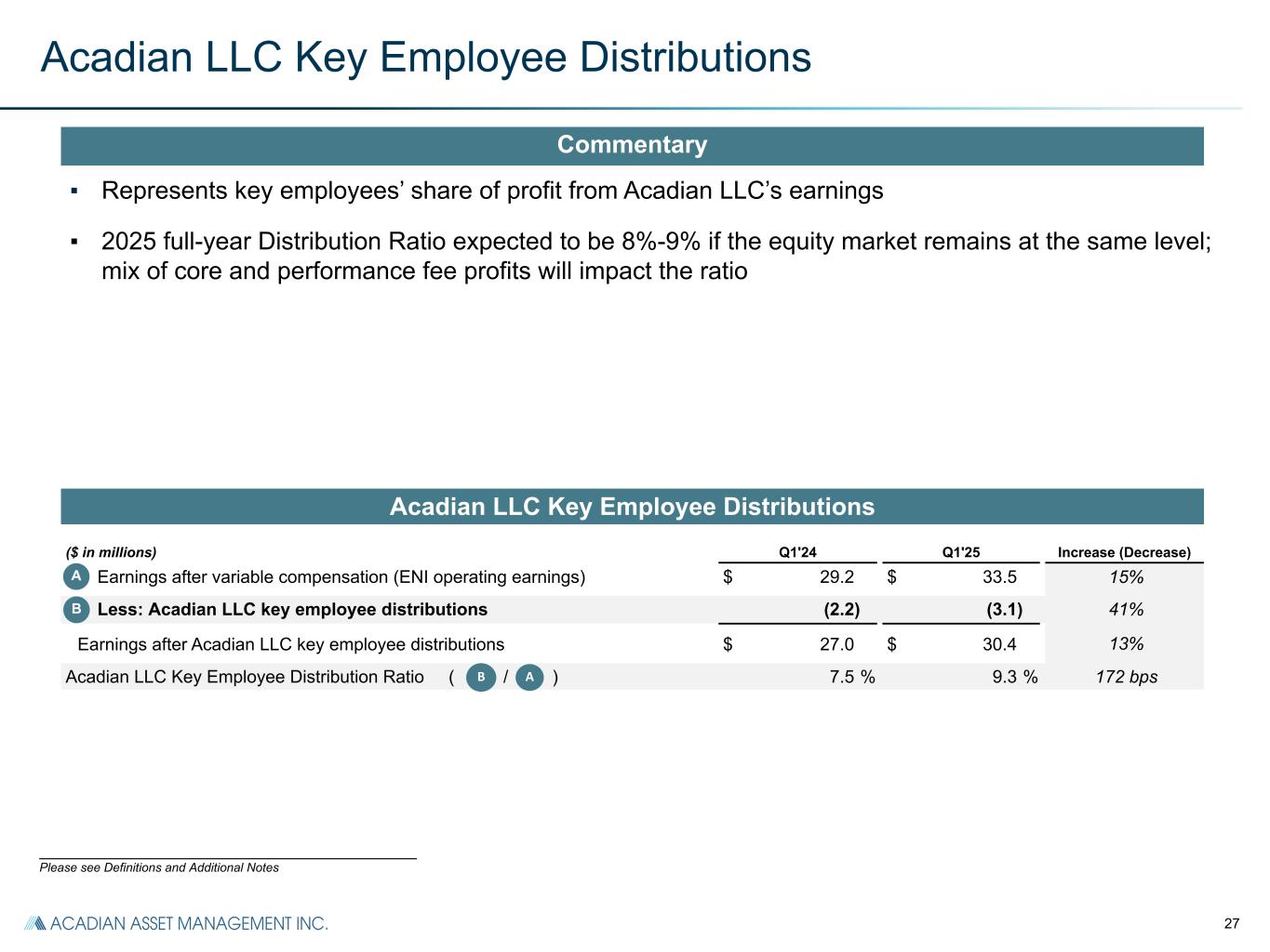 26 ENI Variable Compensation ($ in millions) Q1'24 Q1'25 Increase (Decrease) Cash variable compensation $ 24.9 $ 29.5 18% Add: Non-cash equity-based award amortization 1.7 0.9 (47)% Variable compensation 26.6 30.4 14% Earnings before variable compensation $ 55.8 $ 63.9 15% Variable Compensation Ratio (VC as % of earnings before variable comp.) 47.7 % 47.6 % (10) bps ▪ Variable compensation is primarily comprised of a contractual percentage of ENI earnings before variable compensation and a contractual split of performance fees, which is awarded to employees and recognized over a contractual vesting period ▪ Variable compensation also includes non-cash compensation in the form of Acadian LLC equity provided through recycling and AAMI equity ▪ Q1'25 Variable Compensation Ratio decreased slightly to 47.6% in Q1'25 from 47.7% in Q1'24 ▪ 2025 full-year Variable Compensation Ratio expected to be 44%-48% _______________________________________________________ Please see Definitions and Additional Notes ENI Variable Compensation Commentary
