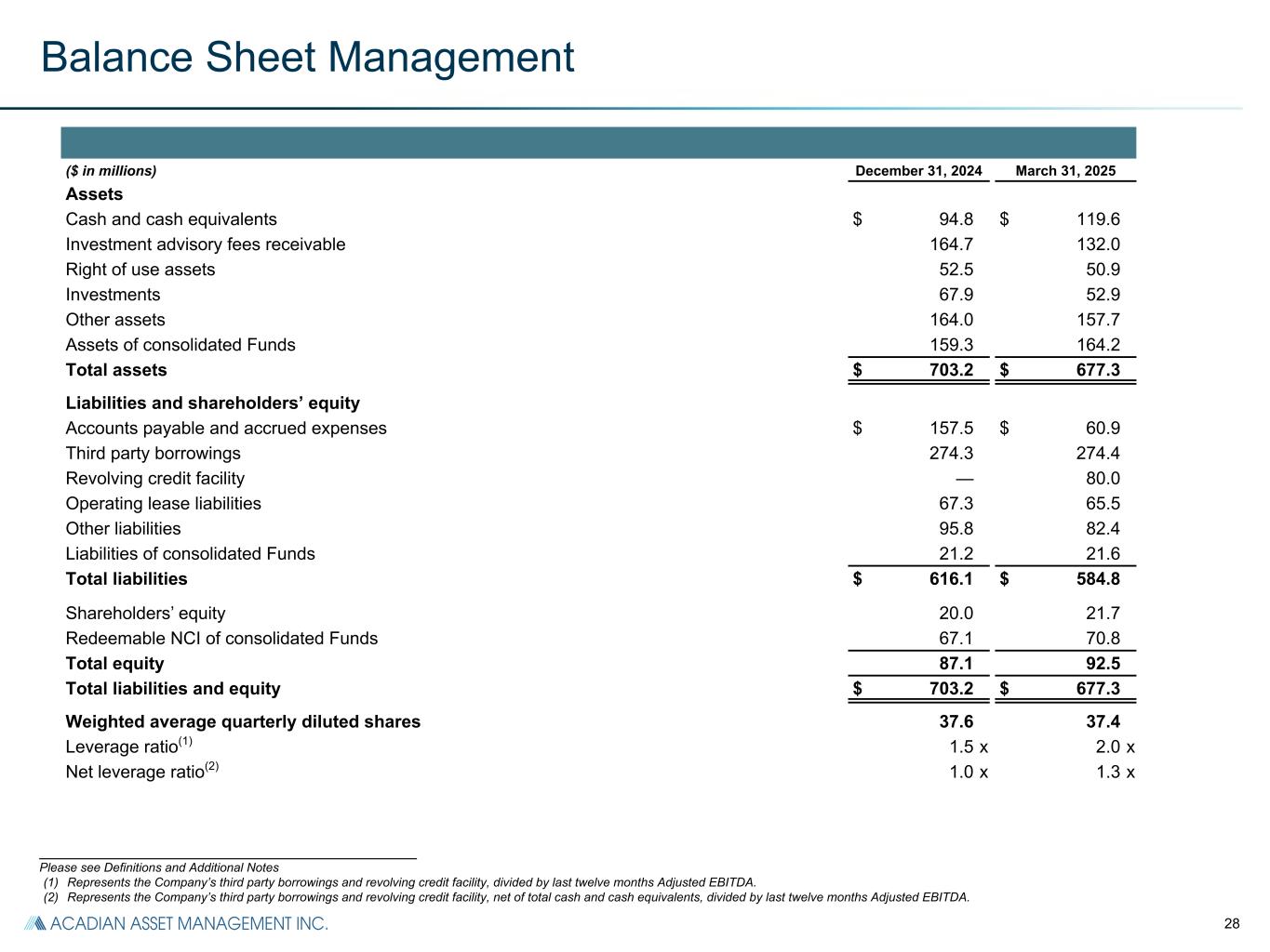27 Acadian LLC Key Employee Distributions ($ in millions) Q1'24 Q1'25 Increase (Decrease) Earnings after variable compensation (ENI operating earnings) $ 29.2 $ 33.5 15% Less: Acadian LLC key employee distributions (2.2) (3.1) 41% Earnings after Acadian LLC key employee distributions $ 27.0 $ 30.4 13% Acadian LLC Key Employee Distribution Ratio ( / ) 7.5 % 9.3 % 172 bps ▪ Represents key employees’ share of profit from Acadian LLC’s earnings ▪ 2025 full-year Distribution Ratio expected to be 8%-9% if the equity market remains at the same level; mix of core and performance fee profits will impact the ratio Acadian LLC Key Employee Distributions A A B B Commentary _______________________________________________________ Please see Definitions and Additional Notes
