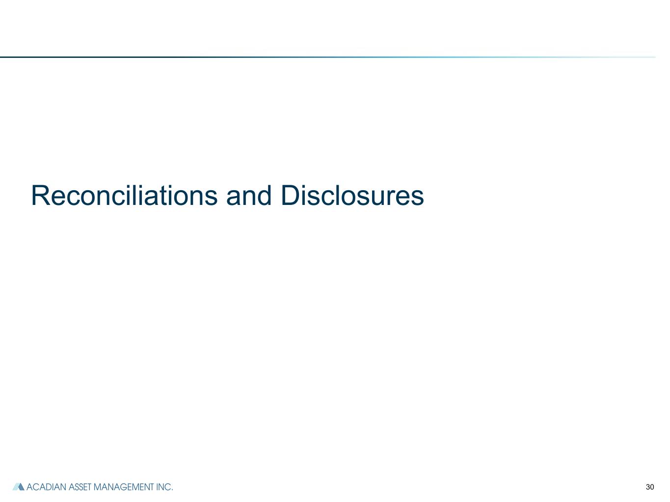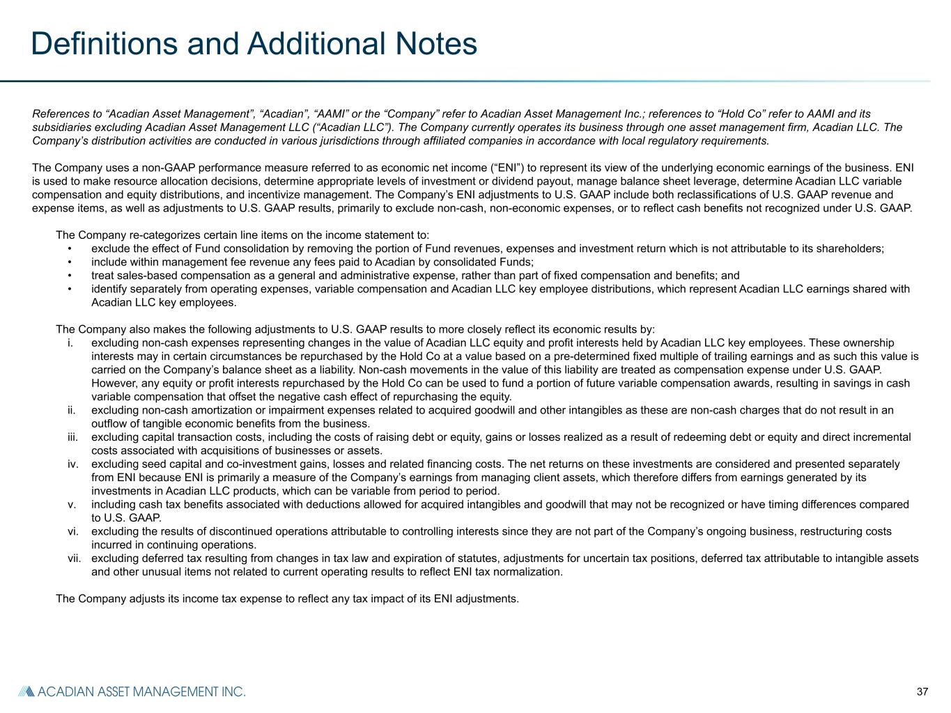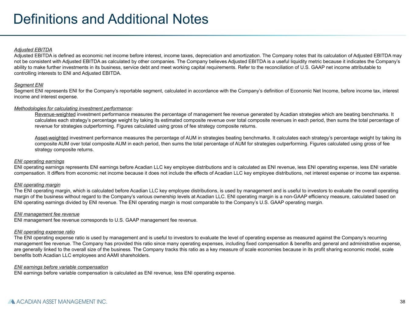 37 References to “Acadian Asset Management”, “Acadian”, “AAMI” or the “Company” refer to Acadian Asset Management Inc.; references to “Hold Co” refer to AAMI and its subsidiaries excluding Acadian Asset Management LLC (“Acadian LLC”). The Company currently operates its business through one asset management firm, Acadian LLC. The Company’s distribution activities are conducted in various jurisdictions through affiliated companies in accordance with local regulatory requirements. The Company uses a non-GAAP performance measure referred to as economic net income (“ENI”) to represent its view of the underlying economic earnings of the business. ENI is used to make resource allocation decisions, determine appropriate levels of investment or dividend payout, manage balance sheet leverage, determine Acadian LLC variable compensation and equity distributions, and incentivize management. The Company’s ENI adjustments to U.S. GAAP include both reclassifications of U.S. GAAP revenue and expense items, as well as adjustments to U.S. GAAP results, primarily to exclude non-cash, non-economic expenses, or to reflect cash benefits not recognized under U.S. GAAP. The Company re-categorizes certain line items on the income statement to: • exclude the effect of Fund consolidation by removing the portion of Fund revenues, expenses and investment return which is not attributable to its shareholders; • include within management fee revenue any fees paid to Acadian by consolidated Funds; • treat sales-based compensation as a general and administrative expense, rather than part of fixed compensation and benefits; and • identify separately from operating expenses, variable compensation and Acadian LLC key employee distributions, which represent Acadian LLC earnings shared with Acadian LLC key employees. The Company also makes the following adjustments to U.S. GAAP results to more closely reflect its economic results by: i. excluding non-cash expenses representing changes in the value of Acadian LLC equity and profit interests held by Acadian LLC key employees. These ownership interests may in certain circumstances be repurchased by the Hold Co at a value based on a pre-determined fixed multiple of trailing earnings and as such this value is carried on the Company’s balance sheet as a liability. Non-cash movements in the value of this liability are treated as compensation expense under U.S. GAAP. However, any equity or profit interests repurchased by the Hold Co can be used to fund a portion of future variable compensation awards, resulting in savings in cash variable compensation that offset the negative cash effect of repurchasing the equity. ii. excluding non-cash amortization or impairment expenses related to acquired goodwill and other intangibles as these are non-cash charges that do not result in an outflow of tangible economic benefits from the business. iii. excluding capital transaction costs, including the costs of raising debt or equity, gains or losses realized as a result of redeeming debt or equity and direct incremental costs associated with acquisitions of businesses or assets. iv. excluding seed capital and co-investment gains, losses and related financing costs. The net returns on these investments are considered and presented separately from ENI because ENI is primarily a measure of the Company’s earnings from managing client assets, which therefore differs from earnings generated by its investments in Acadian LLC products, which can be variable from period to period. v. including cash tax benefits associated with deductions allowed for acquired intangibles and goodwill that may not be recognized or have timing differences compared to U.S. GAAP. vi. excluding the results of discontinued operations attributable to controlling interests since they are not part of the Company’s ongoing business, restructuring costs incurred in continuing operations. vii. excluding deferred tax resulting from changes in tax law and expiration of statutes, adjustments for uncertain tax positions, deferred tax attributable to intangible assets and other unusual items not related to current operating results to reflect ENI tax normalization. The Company adjusts its income tax expense to reflect any tax impact of its ENI adjustments. Definitions and Additional Notes
