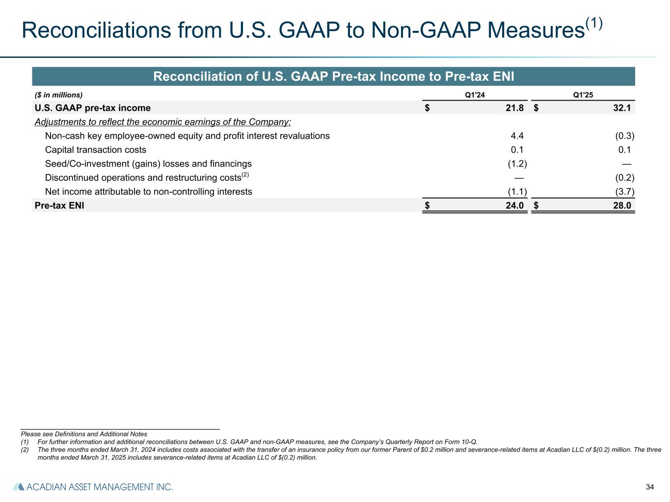 33 Reconciliations from U.S. GAAP to Non-GAAP Measures(1) Reconciliation of U.S. GAAP Operating Expense to ENI Operating Expense ($ in millions) Q1'24 Q1'25 U.S. GAAP operating expense $ 82.8 $ 88.0 Less: items excluded from ENI Non-cash key employee-owned equity and profit interest revaluations (4.4) 0.3 Restructuring costs(2) — 0.2 Funds’ operating expense (0.1) (0.7) Less: items segregated out of U.S. GAAP operating expense Variable compensation(3) (26.6) (30.4) Acadian key employee distributions (2.2) (3.1) ENI operating expense $ 49.5 $ 54.3 _______________________________________________________ Please see Definitions and Additional Notes (1) For further information and additional reconciliations between U.S. GAAP and non-GAAP measures, see the Company’s Quarterly Report on Form 10-Q. (2) The three months ended March 31, 2024 includes costs associated with the transfer of an insurance policy from our former Parent of $0.2 million and severance-related items at Acadian LLC of $(0.2) million. The three months ended March 31, 2025 includes severance-related items at Acadian LLC of $(0.2) million. (3) Represents ENI variable compensation. For the three months ended March 31, 2024 and March 31, 2025 , the U.S. GAAP equivalent of variable compensation was $26.4 million and $30.2 million, respectively.