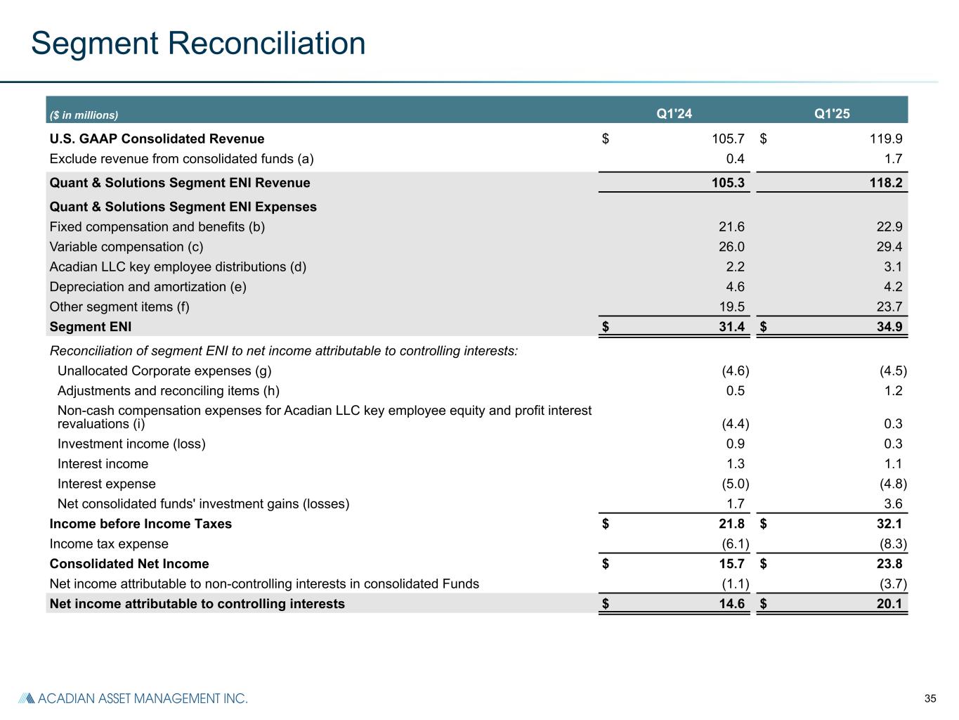 34 Reconciliation of U.S. GAAP Pre-tax Income to Pre-tax ENI ($ in millions) Q1'24 Q1'25 U.S. GAAP pre-tax income $ 21.8 $ 32.1 Adjustments to reflect the economic earnings of the Company: Non-cash key employee-owned equity and profit interest revaluations 4.4 (0.3) Capital transaction costs 0.1 0.1 Seed/Co-investment (gains) losses and financings (1.2) — Discontinued operations and restructuring costs(2) — (0.2) Net income attributable to non-controlling interests (1.1) (3.7) Pre-tax ENI $ 24.0 $ 28.0 Reconciliations from U.S. GAAP to Non-GAAP Measures(1) _______________________________________________________ Please see Definitions and Additional Notes (1) For further information and additional reconciliations between U.S. GAAP and non-GAAP measures, see the Company’s Quarterly Report on Form 10-Q. (2) The three months ended March 31, 2024 includes costs associated with the transfer of an insurance policy from our former Parent of $0.2 million and severance-related items at Acadian LLC of $(0.2) million. The three months ended March 31, 2025 includes severance-related items at Acadian LLC of $(0.2) million.
