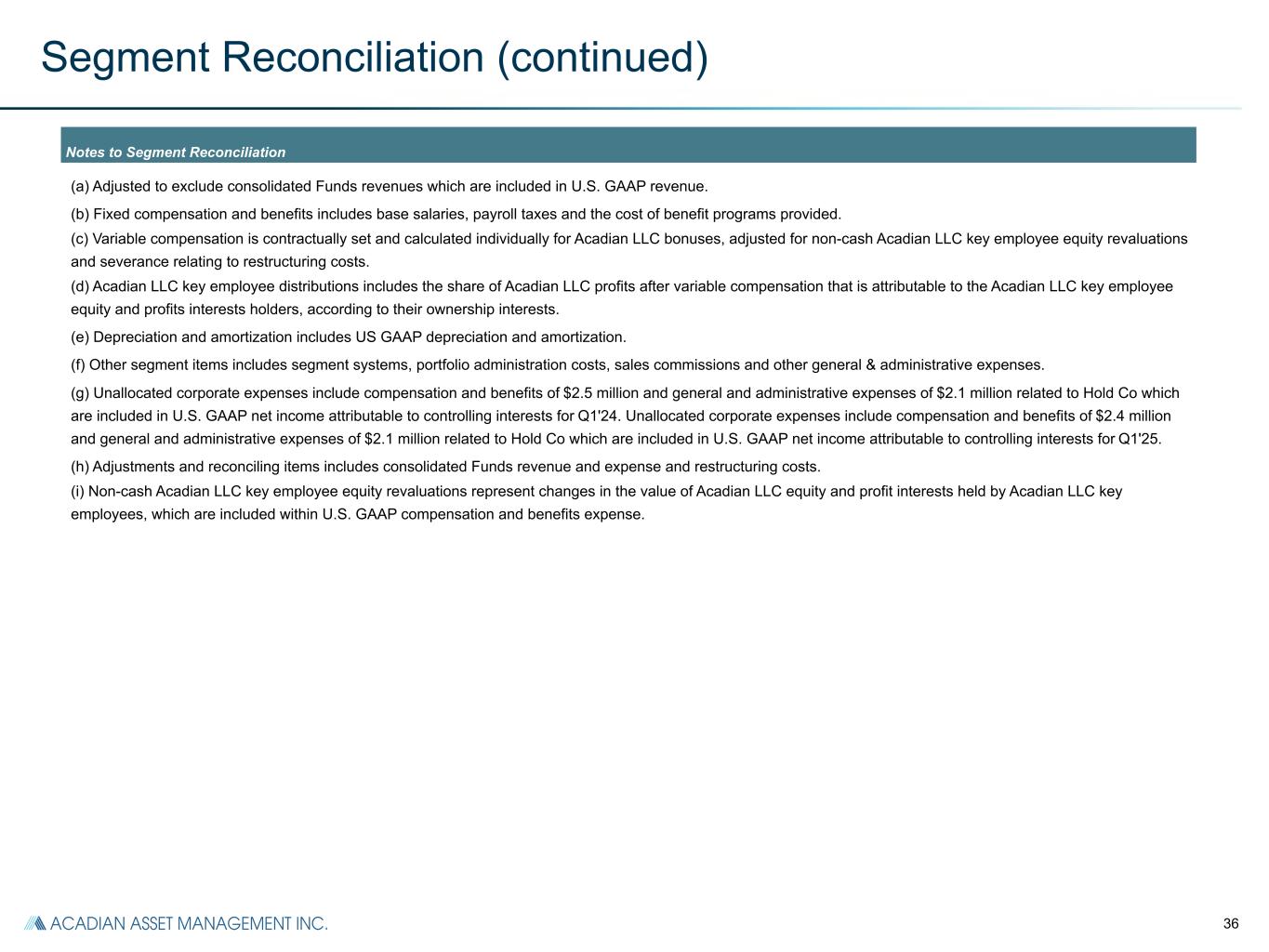 36 Segment Reconciliation (continued) Notes to Segment Reconciliation (a) Adjusted to exclude consolidated Funds revenues which are included in U.S. GAAP revenue. (b) Fixed compensation and benefits includes base salaries, payroll taxes and the cost of benefit programs provided. (c) Variable compensation is contractually set and calculated individually for Acadian LLC bonuses, adjusted for non-cash Acadian LLC key employee equity revaluations and severance relating to restructuring costs. (d) Acadian LLC key employee distributions includes the share of Acadian LLC profits after variable compensation that is attributable to the Acadian LLC key employee equity and profits interests holders, according to their ownership interests. (e) Depreciation and amortization includes US GAAP depreciation and amortization. (f) Other segment items includes segment systems, portfolio administration costs, sales commissions and other general & administrative expenses. (g) Unallocated corporate expenses include compensation and benefits of $2.5 million and general and administrative expenses of $2.1 million related to Hold Co which are included in U.S. GAAP net income attributable to controlling interests for Q1'24. Unallocated corporate expenses include compensation and benefits of $2.4 million and general and administrative expenses of $2.1 million related to Hold Co which are included in U.S. GAAP net income attributable to controlling interests for Q1'25. (h) Adjustments and reconciling items includes consolidated Funds revenue and expense and restructuring costs. (i) Non-cash Acadian LLC key employee equity revaluations represent changes in the value of Acadian LLC equity and profit interests held by Acadian LLC key employees, which are included within U.S. GAAP compensation and benefits expense.