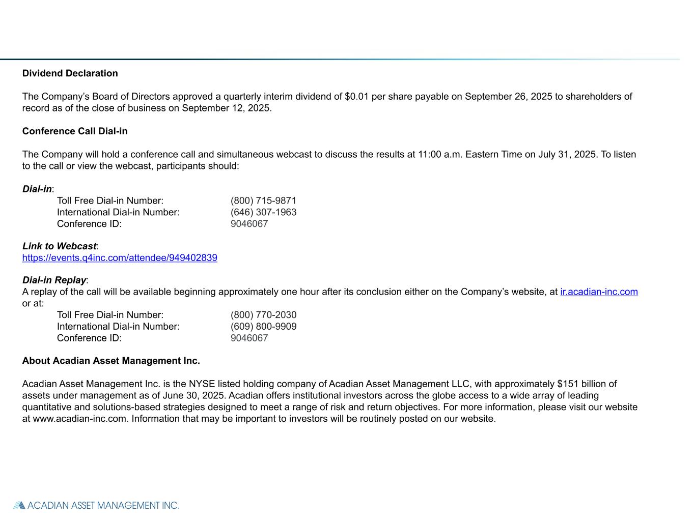 Dividend Declaration The Company’s Board of Directors approved a quarterly interim dividend of $0.01 per share payable on September 26, 2025 to shareholders of record as of the close of business on September 12, 2025. Conference Call Dial-in The Company will hold a conference call and simultaneous webcast to discuss the results at 11:00 a.m. Eastern Time on July 31, 2025. To listen to the call or view the webcast, participants should: Dial-in: Toll Free Dial-in Number: (800) 715-9871 International Dial-in Number: (646) 307-1963 Conference ID: 9046067 Link to Webcast: https://events.q4inc.com/attendee/949402839 Dial-in Replay: A replay of the call will be available beginning approximately one hour after its conclusion either on the Company’s website, at ir.acadian-inc.com or at: Toll Free Dial-in Number: (800) 770-2030 International Dial-in Number: (609) 800-9909 Conference ID: 9046067 About Acadian Asset Management Inc. Acadian Asset Management Inc. is the NYSE listed holding company of Acadian Asset Management LLC, with approximately $151 billion of assets under management as of June 30, 2025. Acadian offers institutional investors across the globe access to a wide array of leading quantitative and solutions-based strategies designed to meet a range of risk and return objectives. For more information, please visit our website at www.acadian-inc.com. Information that may be important to investors will be routinely posted on our website.