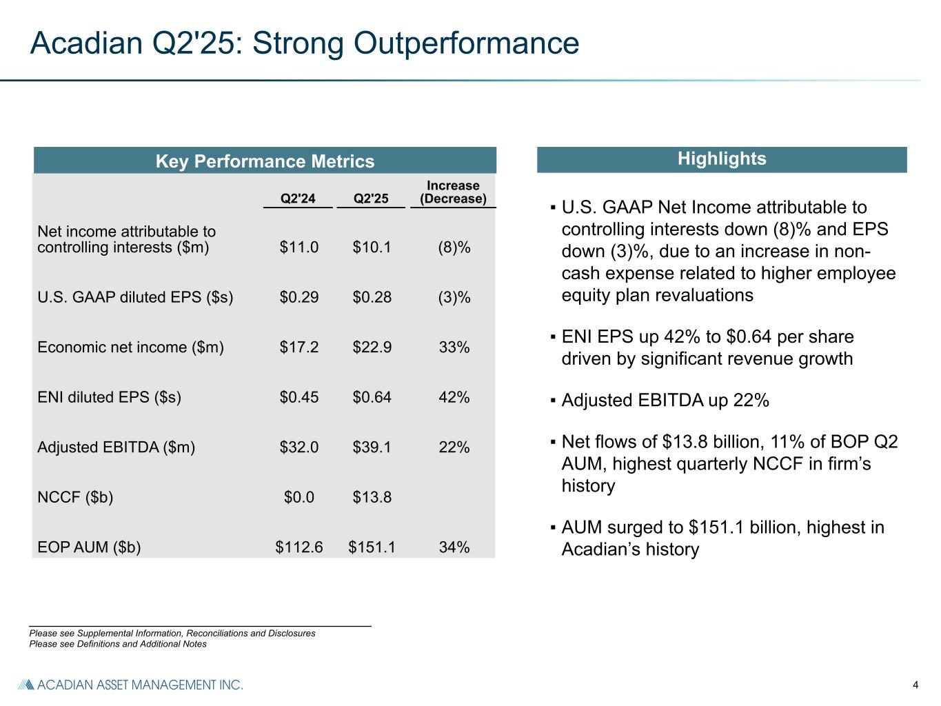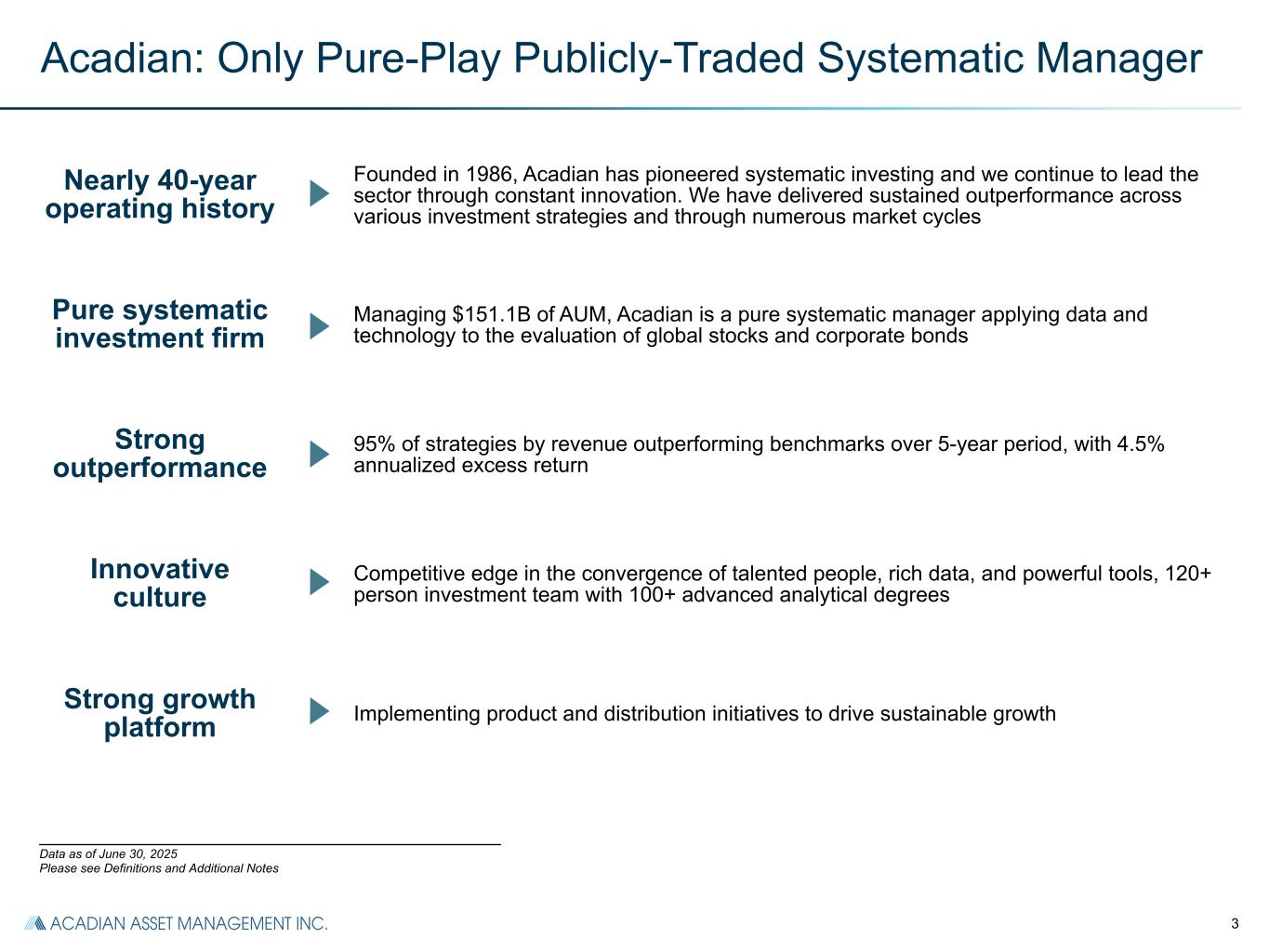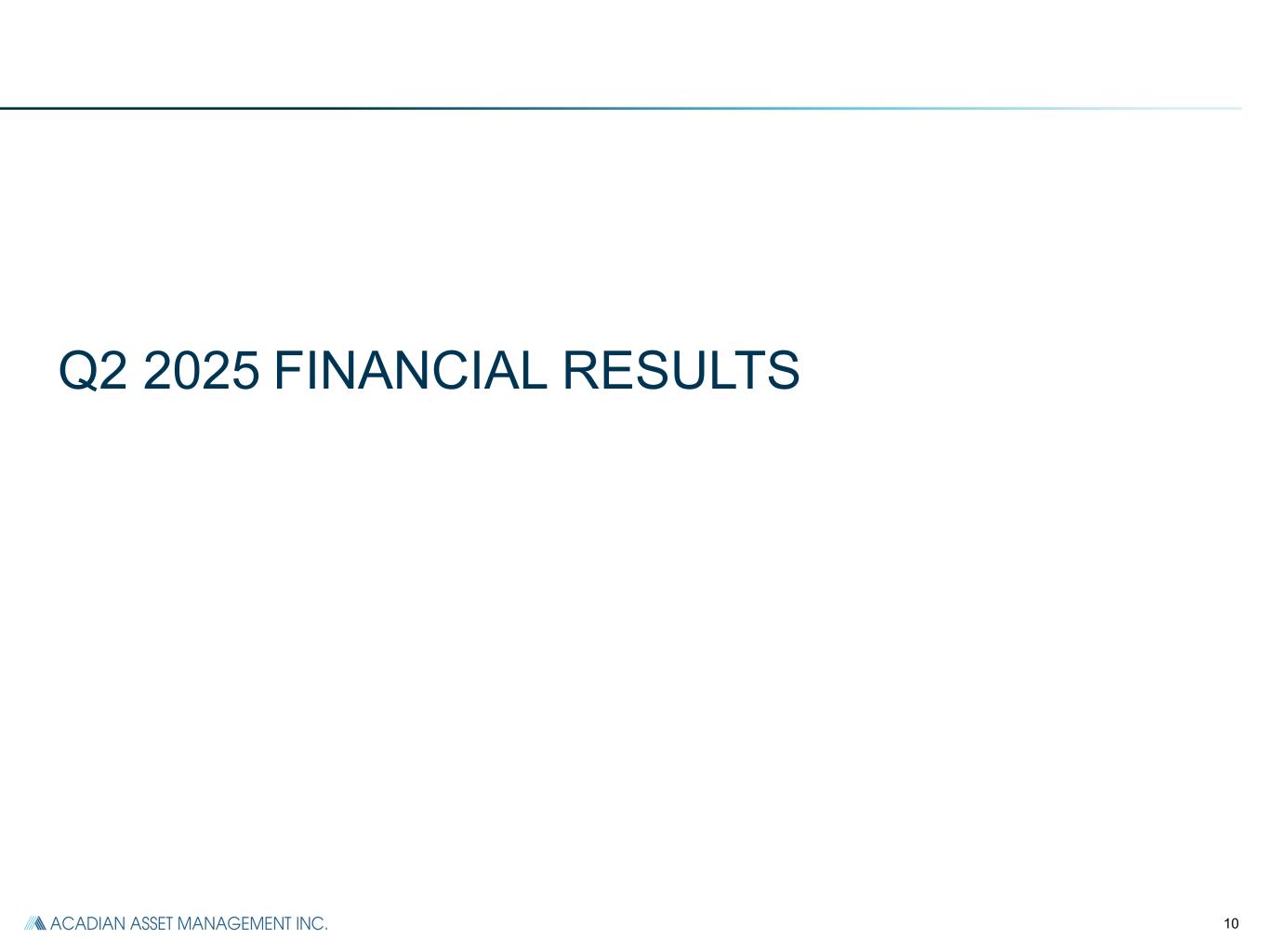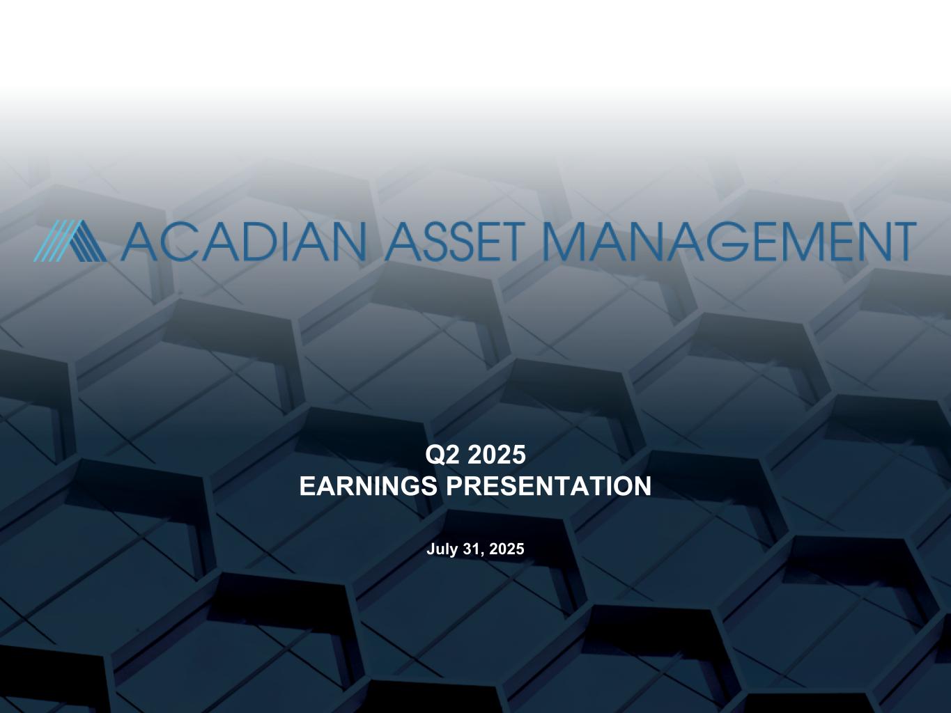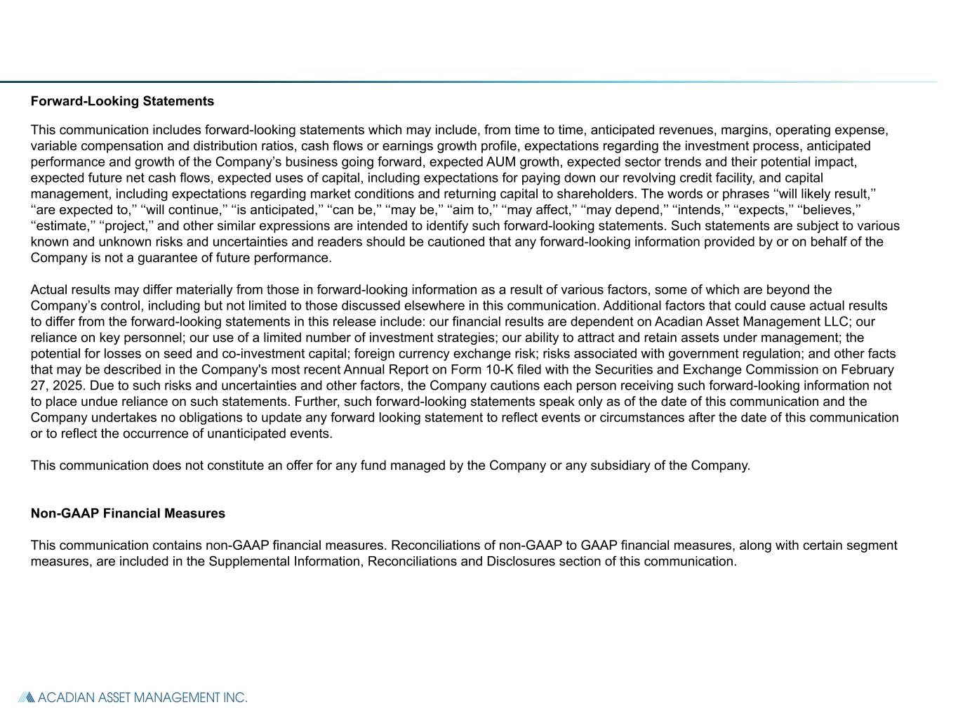 Forward-Looking Statements This communication includes forward-looking statements which may include, from time to time, anticipated revenues, margins, operating expense, variable compensation and distribution ratios, cash flows or earnings growth profile, expectations regarding the investment process, anticipated performance and growth of the Company’s business going forward, expected AUM growth, expected sector trends and their potential impact, expected future net cash flows, expected uses of capital, including expectations for paying down our revolving credit facility, and capital management, including expectations regarding market conditions and returning capital to shareholders. The words or phrases ‘‘will likely result,’’ ‘‘are expected to,’’ ‘‘will continue,’’ ‘‘is anticipated,’’ ‘‘can be,’’ ‘‘may be,’’ ‘‘aim to,’’ ‘‘may affect,’’ ‘‘may depend,’’ ‘‘intends,’’ ‘‘expects,’’ ‘‘believes,’’ ‘‘estimate,’’ ‘‘project,’’ and other similar expressions are intended to identify such forward-looking statements. Such statements are subject to various known and unknown risks and uncertainties and readers should be cautioned that any forward-looking information provided by or on behalf of the Company is not a guarantee of future performance. Actual results may differ materially from those in forward-looking information as a result of various factors, some of which are beyond the Company’s control, including but not limited to those discussed elsewhere in this communication. Additional factors that could cause actual results to differ from the forward-looking statements in this release include: our financial results are dependent on Acadian Asset Management LLC; our reliance on key personnel; our use of a limited number of investment strategies; our ability to attract and retain assets under management; the potential for losses on seed and co-investment capital; foreign currency exchange risk; risks associated with government regulation; and other facts that may be described in the Company's most recent Annual Report on Form 10-K filed with the Securities and Exchange Commission on February 27, 2025. Due to such risks and uncertainties and other factors, the Company cautions each person receiving such forward-looking information not to place undue reliance on such statements. Further, such forward-looking statements speak only as of the date of this communication and the Company undertakes no obligations to update any forward looking statement to reflect events or circumstances after the date of this communication or to reflect the occurrence of unanticipated events. This communication does not constitute an offer for any fund managed by the Company or any subsidiary of the Company. Non-GAAP Financial Measures This communication contains non-GAAP financial measures. Reconciliations of non-GAAP to GAAP financial measures, along with certain segment measures, are included in the Supplemental Information, Reconciliations and Disclosures section of this communication.