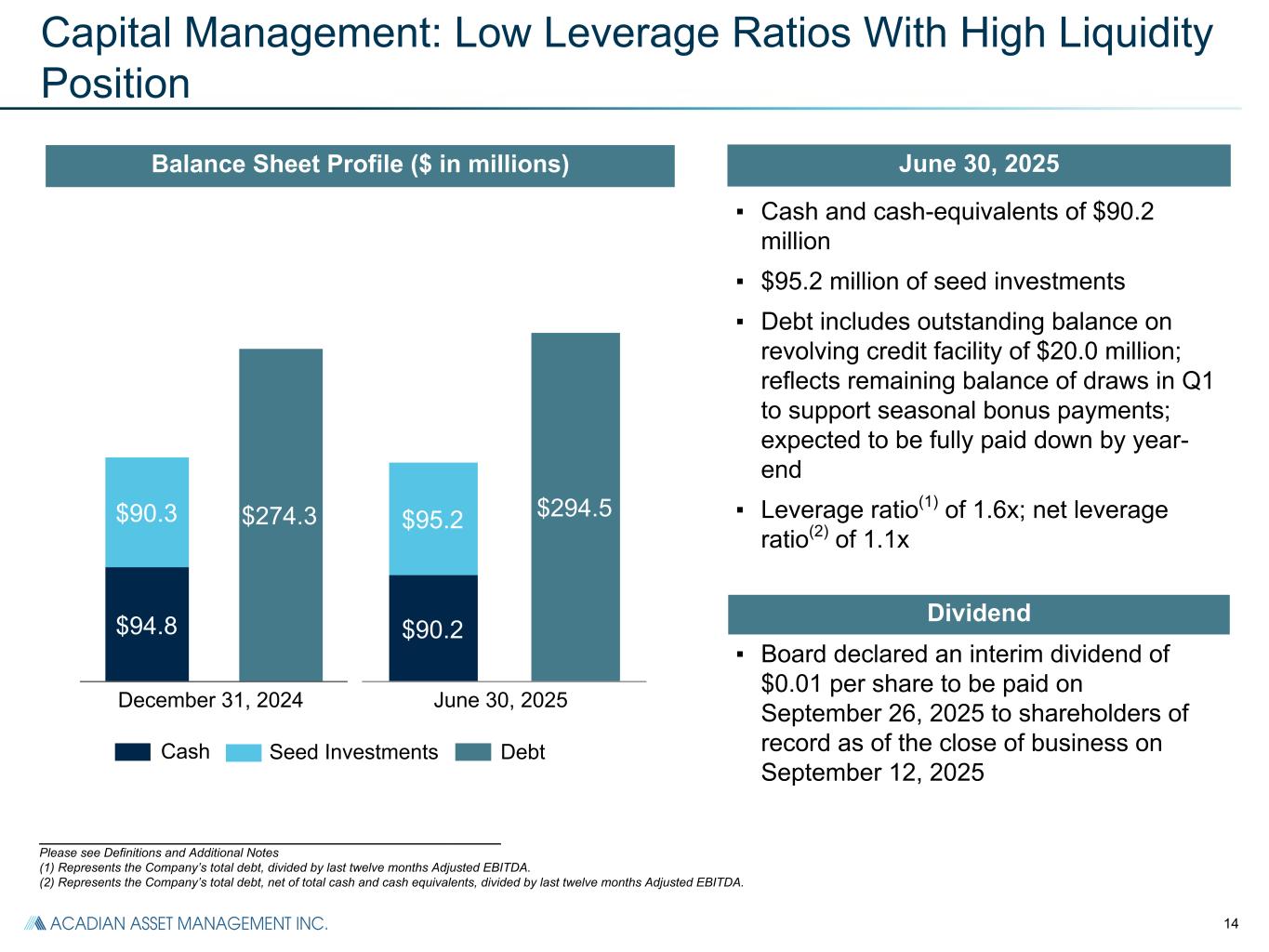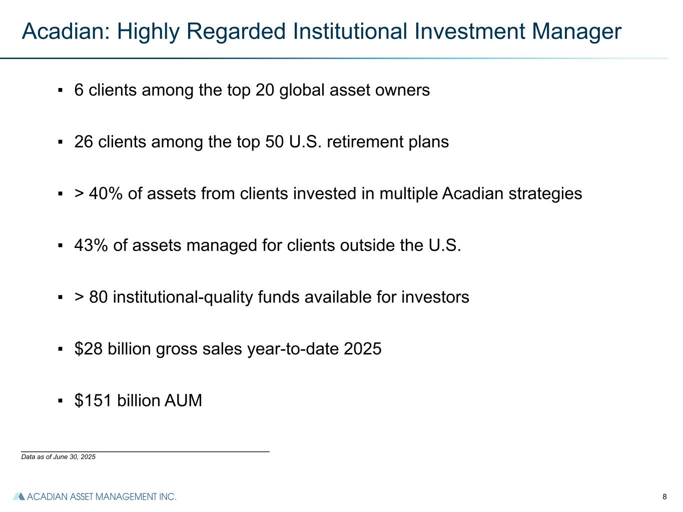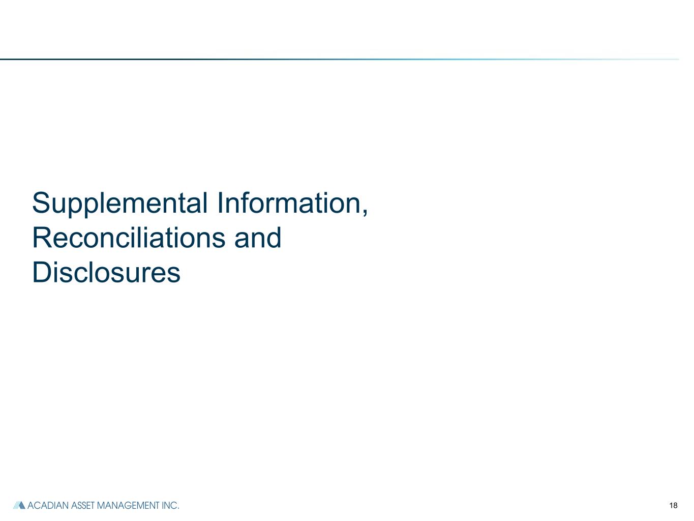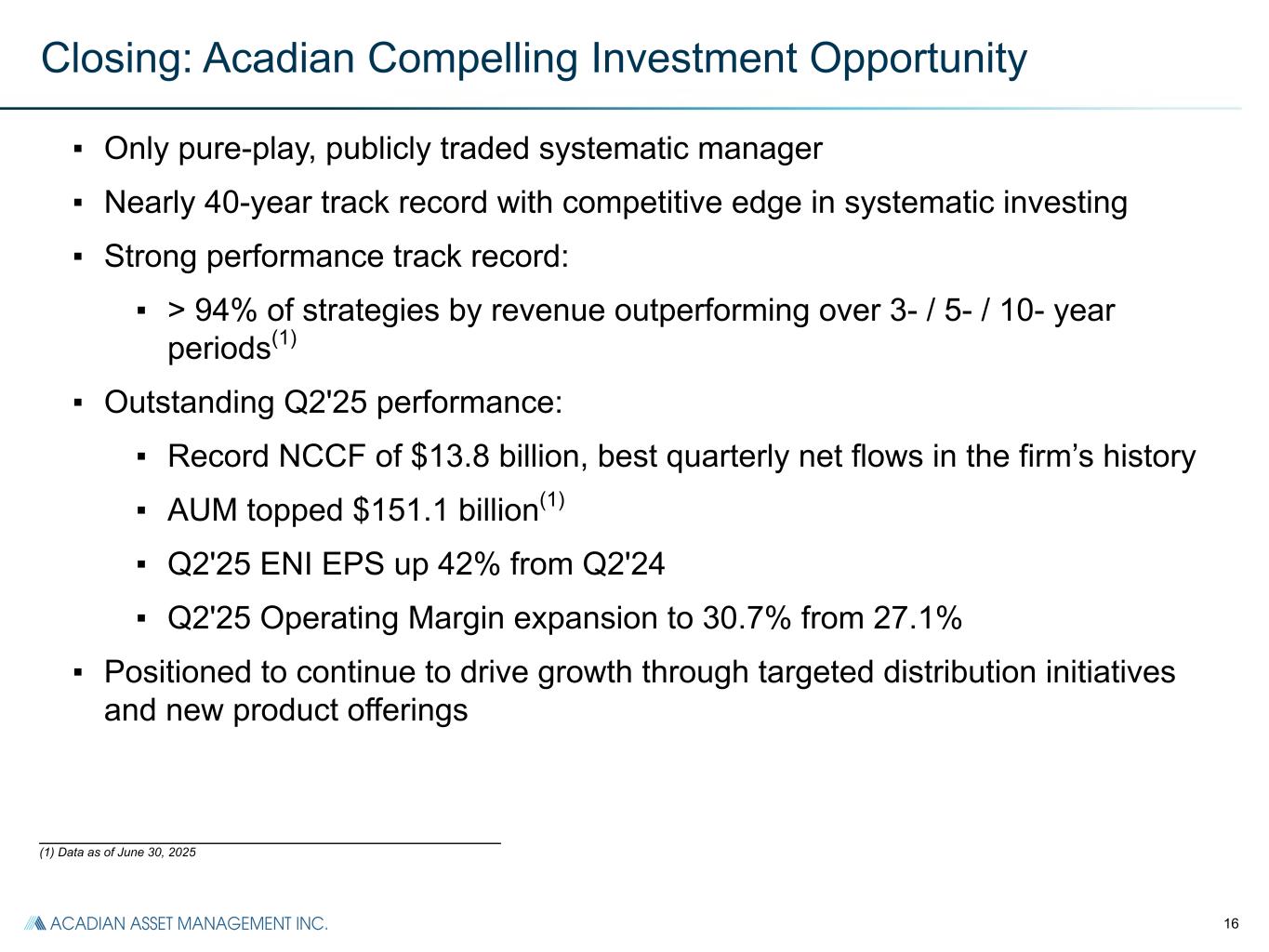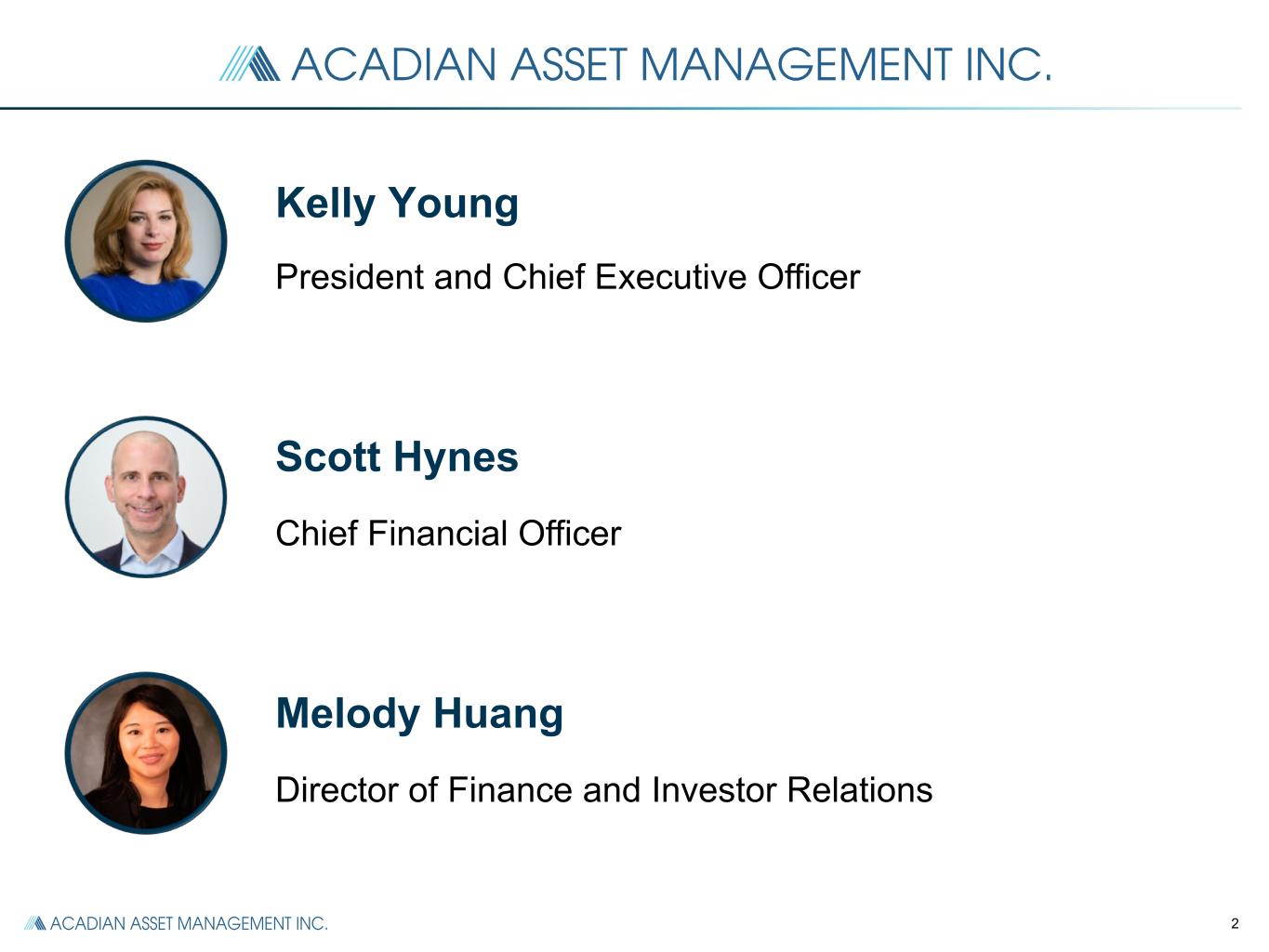 Forward-Looking Statements This communication includes forward-looking statements which may include, from time to time, anticipated revenues, margins, operating expense, variable compensation and distribution ratios, cash flows or earnings growth profile, expectations regarding the investment process, anticipated performance and growth of the Company’s business going forward, expected AUM growth, expected sector trends and their potential impact, expected future net cash flows, expected uses of capital, including expectations for paying down our revolving credit facility, and capital management, including expectations regarding market conditions and returning capital to shareholders. The words or phrases ‘‘will likely result,’’ ‘‘are expected to,’’ ‘‘will continue,’’ ‘‘is anticipated,’’ ‘‘can be,’’ ‘‘may be,’’ ‘‘aim to,’’ ‘‘may affect,’’ ‘‘may depend,’’ ‘‘intends,’’ ‘‘expects,’’ ‘‘believes,’’ ‘‘estimate,’’ ‘‘project,’’ and other similar expressions are intended to identify such forward-looking statements. Such statements are subject to various known and unknown risks and uncertainties and readers should be cautioned that any forward-looking information provided by or on behalf of the Company is not a guarantee of future performance. Actual results may differ materially from those in forward-looking information as a result of various factors, some of which are beyond the Company’s control, including but not limited to those discussed elsewhere in this communication. Additional factors that could cause actual results to differ from the forward-looking statements in this release include: our financial results are dependent on Acadian Asset Management LLC; our reliance on key personnel; our use of a limited number of investment strategies; our ability to attract and retain assets under management; the potential for losses on seed and co-investment capital; foreign currency exchange risk; risks associated with government regulation; and other facts that may be described in the Company's most recent Annual Report on Form 10-K filed with the Securities and Exchange Commission on February 27, 2025. Due to such risks and uncertainties and other factors, the Company cautions each person receiving such forward-looking information not to place undue reliance on such statements. Further, such forward-looking statements speak only as of the date of this communication and the Company undertakes no obligations to update any forward looking statement to reflect events or circumstances after the date of this communication or to reflect the occurrence of unanticipated events. This communication does not constitute an offer for any fund managed by the Company or any subsidiary of the Company. Non-GAAP Financial Measures This communication contains non-GAAP financial measures. Reconciliations of non-GAAP to GAAP financial measures, along with certain segment measures, are included in the Supplemental Information, Reconciliations and Disclosures section of this communication.