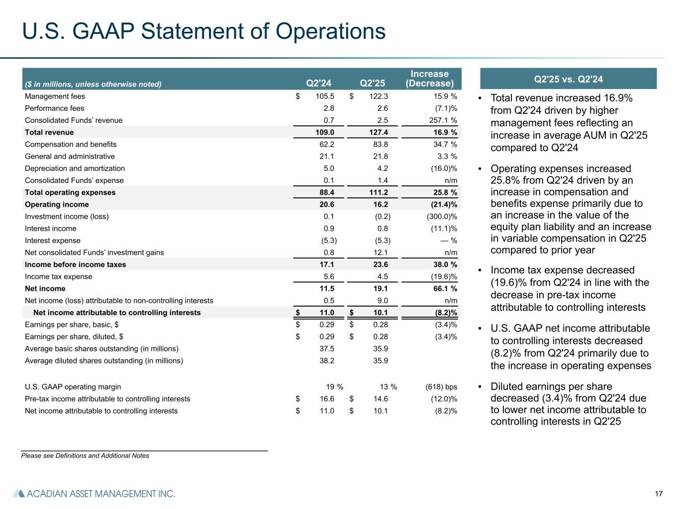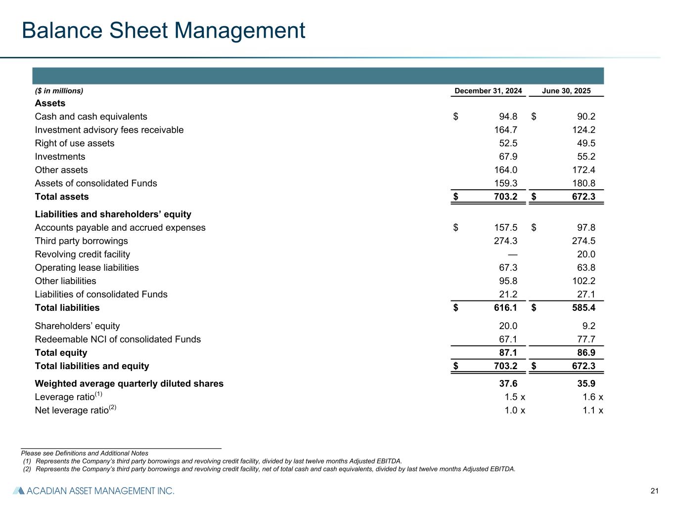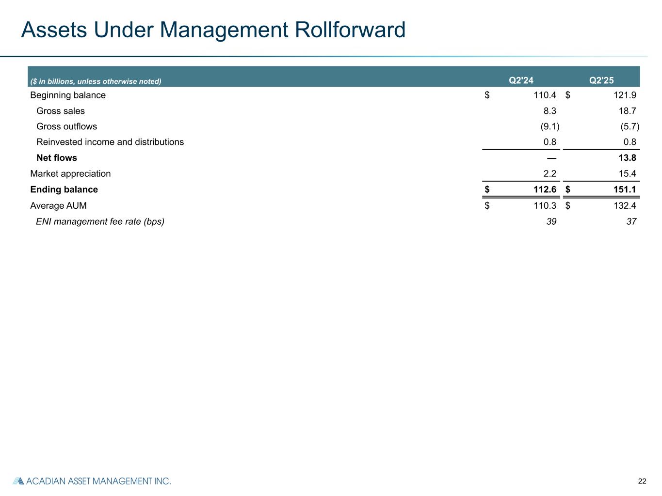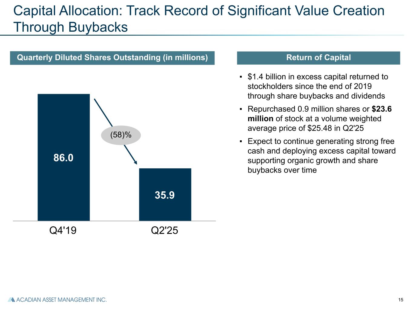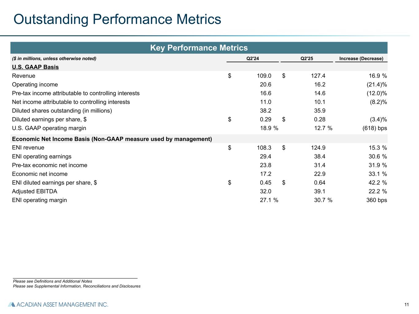 Forward-Looking Statements This communication includes forward-looking statements which may include, from time to time, anticipated revenues, margins, operating expense, variable compensation and distribution ratios, cash flows or earnings growth profile, expectations regarding the investment process, anticipated performance and growth of the Company’s business going forward, expected AUM growth, expected sector trends and their potential impact, expected future net cash flows, expected uses of capital, including expectations for paying down our revolving credit facility, and capital management, including expectations regarding market conditions and returning capital to shareholders. The words or phrases ‘‘will likely result,’’ ‘‘are expected to,’’ ‘‘will continue,’’ ‘‘is anticipated,’’ ‘‘can be,’’ ‘‘may be,’’ ‘‘aim to,’’ ‘‘may affect,’’ ‘‘may depend,’’ ‘‘intends,’’ ‘‘expects,’’ ‘‘believes,’’ ‘‘estimate,’’ ‘‘project,’’ and other similar expressions are intended to identify such forward-looking statements. Such statements are subject to various known and unknown risks and uncertainties and readers should be cautioned that any forward-looking information provided by or on behalf of the Company is not a guarantee of future performance. Actual results may differ materially from those in forward-looking information as a result of various factors, some of which are beyond the Company’s control, including but not limited to those discussed elsewhere in this communication. Additional factors that could cause actual results to differ from the forward-looking statements in this release include: our financial results are dependent on Acadian Asset Management LLC; our reliance on key personnel; our use of a limited number of investment strategies; our ability to attract and retain assets under management; the potential for losses on seed and co-investment capital; foreign currency exchange risk; risks associated with government regulation; and other facts that may be described in the Company's most recent Annual Report on Form 10-K filed with the Securities and Exchange Commission on February 27, 2025. Due to such risks and uncertainties and other factors, the Company cautions each person receiving such forward-looking information not to place undue reliance on such statements. Further, such forward-looking statements speak only as of the date of this communication and the Company undertakes no obligations to update any forward looking statement to reflect events or circumstances after the date of this communication or to reflect the occurrence of unanticipated events. This communication does not constitute an offer for any fund managed by the Company or any subsidiary of the Company. Non-GAAP Financial Measures This communication contains non-GAAP financial measures. Reconciliations of non-GAAP to GAAP financial measures, along with certain segment measures, are included in the Supplemental Information, Reconciliations and Disclosures section of this communication.