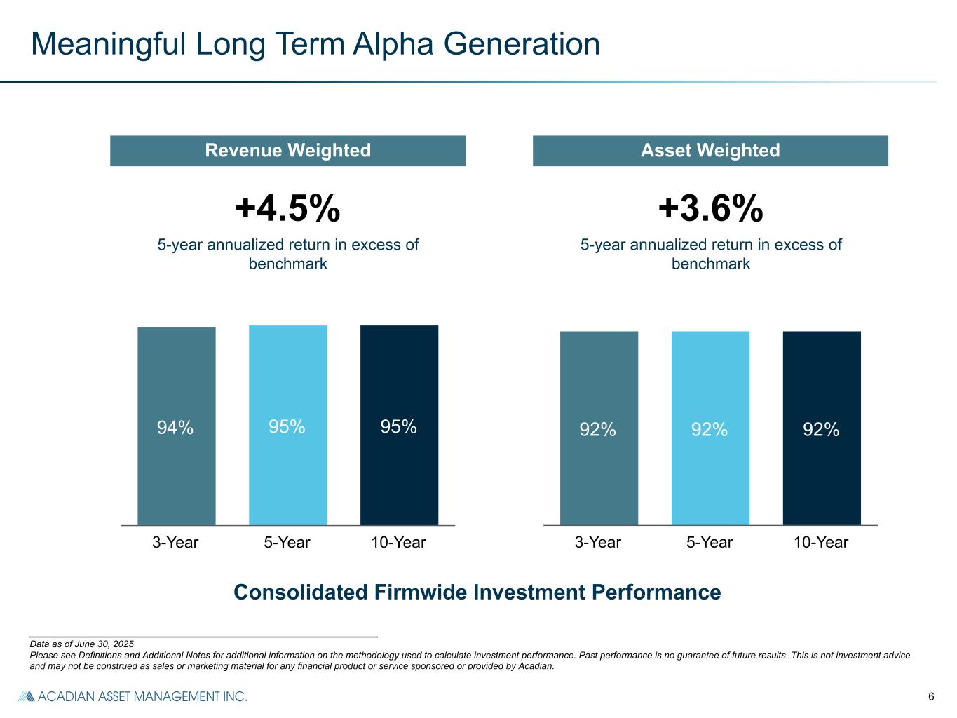 5 100% 100% 100% 3-Year 5-Year 10-Year 100% 100% 100% 3-Year 5-Year 10-Year 100% 100% 100% 3-Year 5-Year 10-Year 100% 100% 100% 3-Year 5-Year 10-Year 100% 100% 100% 3-Year 5-Year 10-Year Global Equity Outstanding Performance Track Records % of Major Strategy Group Assets Outperforming Benchmarks Emerging Markets Equity Non-US Equity Small Cap Equity Enhanced Equity ___________________________________________________________ Data as of June 30, 2025 Figures calculated using gross of fee strategy composite returns. Global, Emerging, and International Equity groupings reflect similar composites focused on common geographies. Enhanced and Small Cap Equity mandates are separately reflected. See Definitions and Additional Notes for additional information on the methodology used to calculate investment performance. Past performance is no guarantee of future results. This is not investment advice and may not be construed as sales or marketing material for any financial product or service sponsored or provided by Acadian.
