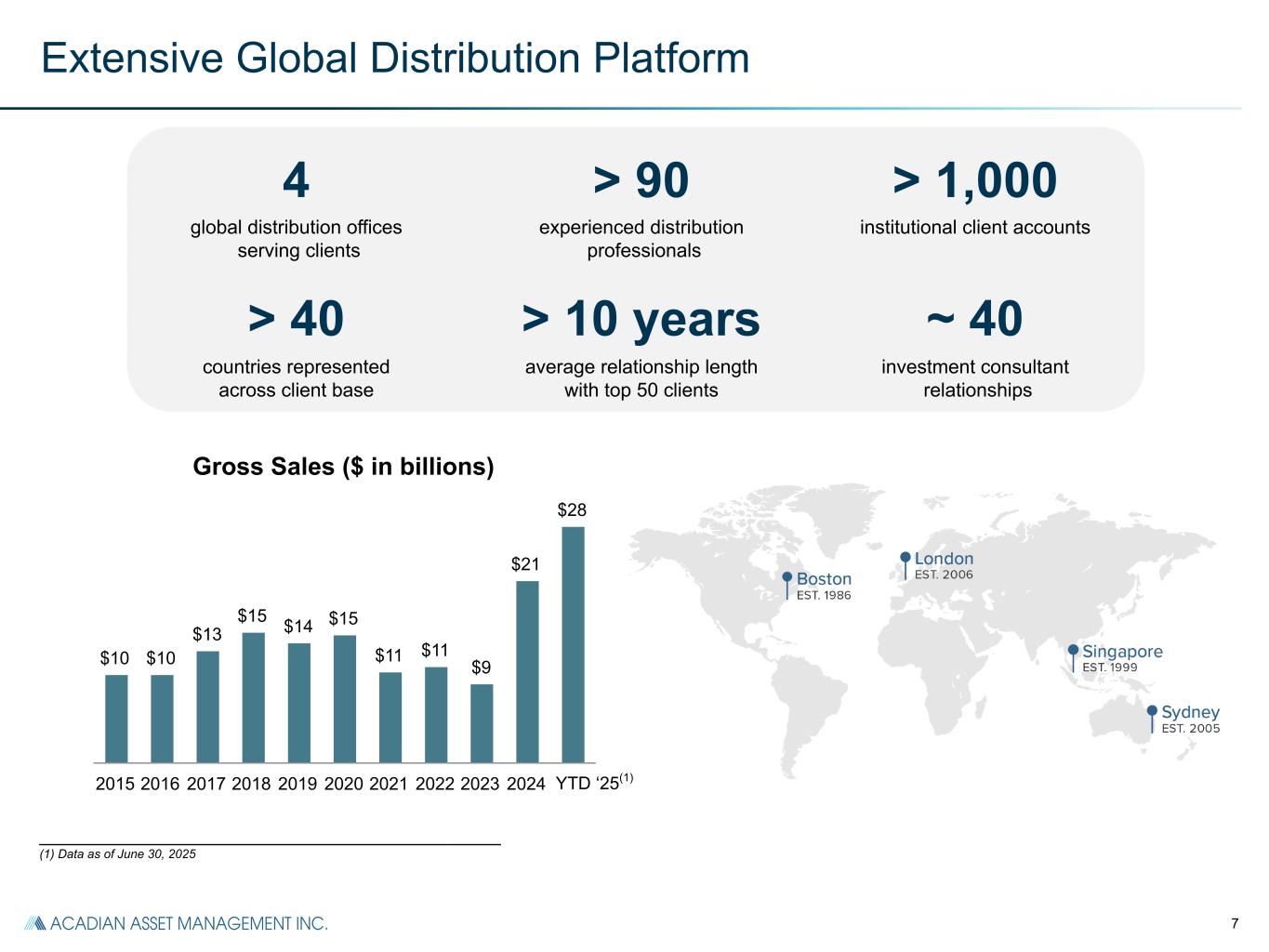 6 94% 95% 95% 3-Year 5-Year 10-Year Meaningful Long Term Alpha Generation 92% 92% 92% 3-Year 5-Year 10-Year +4.5% 5-year annualized return in excess of benchmark +3.6% 5-year annualized return in excess of benchmark Revenue Weighted Asset Weighted Consolidated Firmwide Investment Performance ___________________________________________________________ Data as of June 30, 2025 Please see Definitions and Additional Notes for additional information on the methodology used to calculate investment performance. Past performance is no guarantee of future results. This is not investment advice and may not be construed as sales or marketing material for any financial product or service sponsored or provided by Acadian.