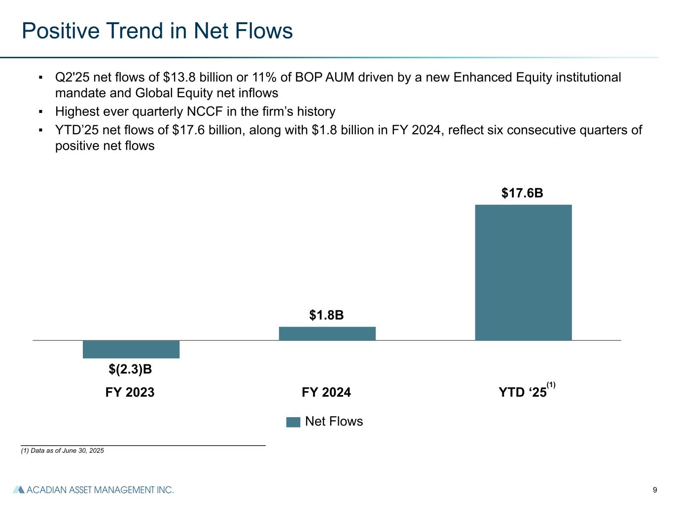 8 Acadian: Highly Regarded Institutional Investment Manager ▪ 6 clients among the top 20 global asset owners ▪ 26 clients among the top 50 U.S. retirement plans ▪ > 40% of assets from clients invested in multiple Acadian strategies ▪ 43% of assets managed for clients outside the U.S. ▪ > 80 institutional-quality funds available for investors ▪ $28 billion gross sales year-to-date 2025 ▪ $151 billion AUM ___________________________________________________________ Data as of June 30, 2025