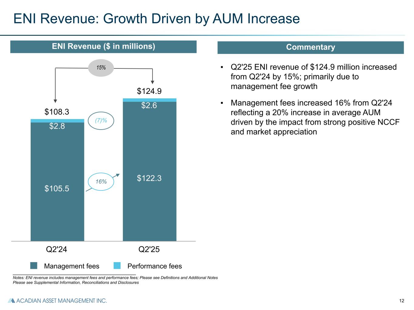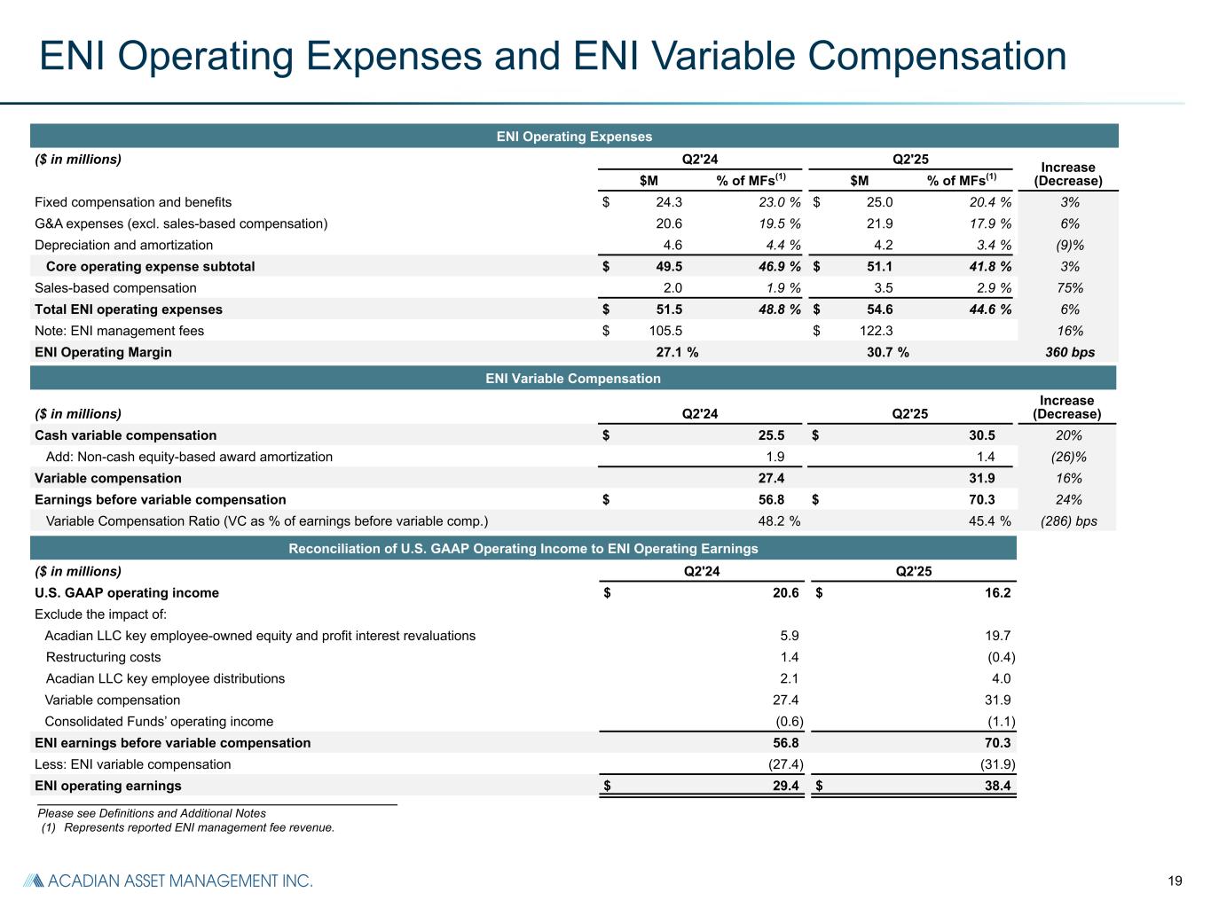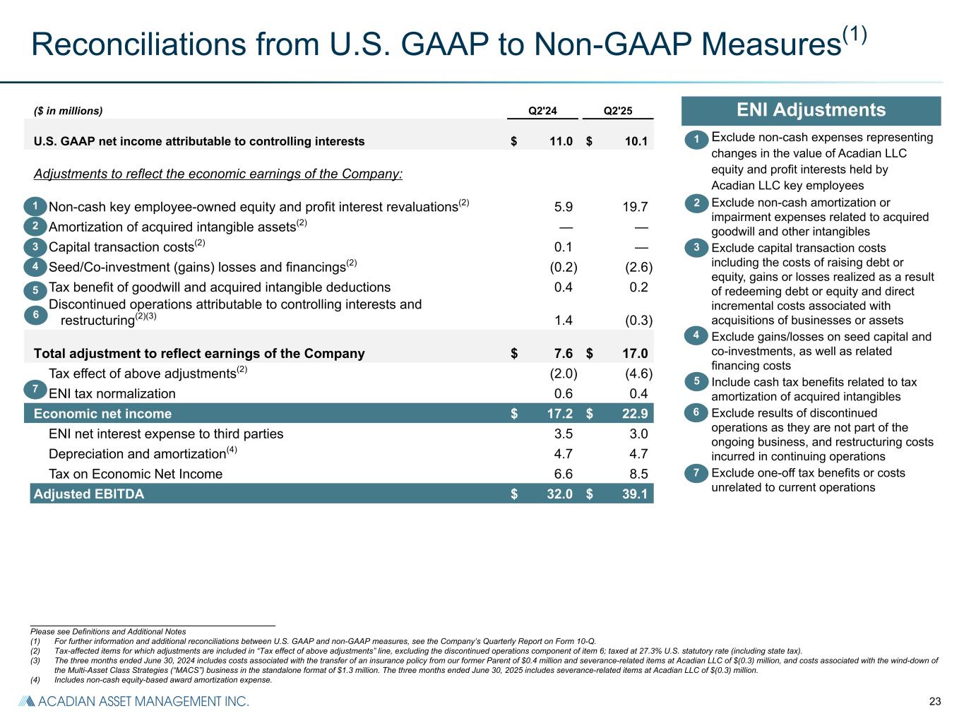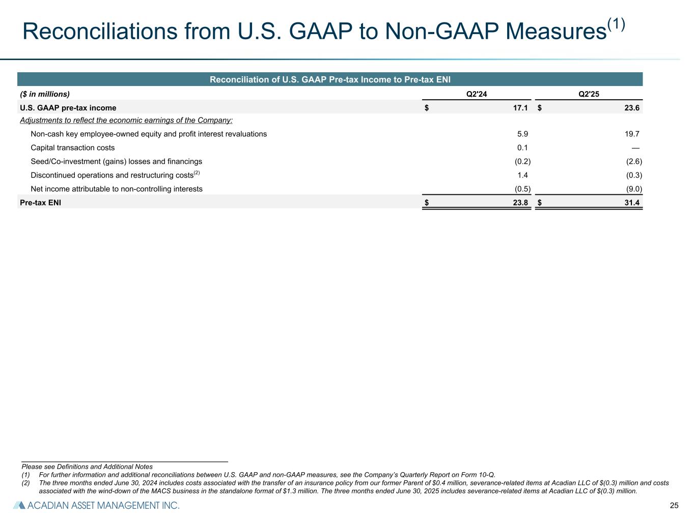 24 Reconciliations from U.S. GAAP to Non-GAAP Measures(1) Reconciliation of per-share U.S. GAAP Net Income to Economic Net Income per share ($) Q2'24 Q2'25 U.S. GAAP net income per share $ 0.29 $ 0.28 Adjustments to reflect the economic earnings of the Company: i. Non-cash key employee-owned equity and profit interest revaluations 0.15 0.55 ii. Amortization and impairment of goodwill and intangible assets — — iii. Capital transaction costs — — iv. Seed/Co-investment gains and financing (0.01) (0.07) v. Tax benefit of goodwill and acquired intangibles deductions 0.01 0.01 vi. Discontinued operations and restructuring 0.04 (0.01) vii. ENI tax normalization 0.02 0.01 Tax effect of above adjustments, as applicable (0.05) (0.13) Economic net income per share $ 0.45 $ 0.64 Reconciliation of U.S. GAAP Revenue to ENI Revenue ($ in millions) Q2'24 Q2'25 U.S. GAAP revenue $ 109.0 $ 127.4 Exclude revenue from consolidated Funds (0.7) (2.5) ENI revenue $ 108.3 $ 124.9 _______________________________________________________ Please see Definitions and Additional Notes (1) For further information and additional reconciliations between U.S. GAAP and non-GAAP measures, see the Company’s Quarterly Report on Form 10-Q. (2) The three months ended June 30, 2024 includes costs associated with the transfer of an insurance policy from our former Parent of $0.4 million, severance-related items at Acadian LLC of $(0.3) million, and costs associated with the wind-down of the MACS business in the standalone format of $1.3 million. The three months ended June 30, 2025 includes severance-related items at Acadian LLC of $(0.3) million. (3) Represents ENI variable compensation. For the three months ended June 30, 2024 and June 30, 2025, the U.S. GAAP equivalent of variable compensation was $27.9 million and $31.6 million, respectively. Reconciliation of U.S. GAAP Operating Expense to ENI Operating Expense ($ in millions) Q2'24 Q2'25 U.S. GAAP operating expense $ 88.4 $ 111.2 Less: items excluded from ENI Non-cash key employee-owned equity and profit interest revaluations (5.9) (19.7) Restructuring costs(2) (1.4) 0.4 Consolidated Funds’ operating expense (0.1) (1.4) Less: items segregated out of U.S. GAAP operating expense Variable compensation(3) (27.4) (31.9) Acadian key employee distributions (2.1) (4.0) ENI operating expense $ 51.5 $ 54.6