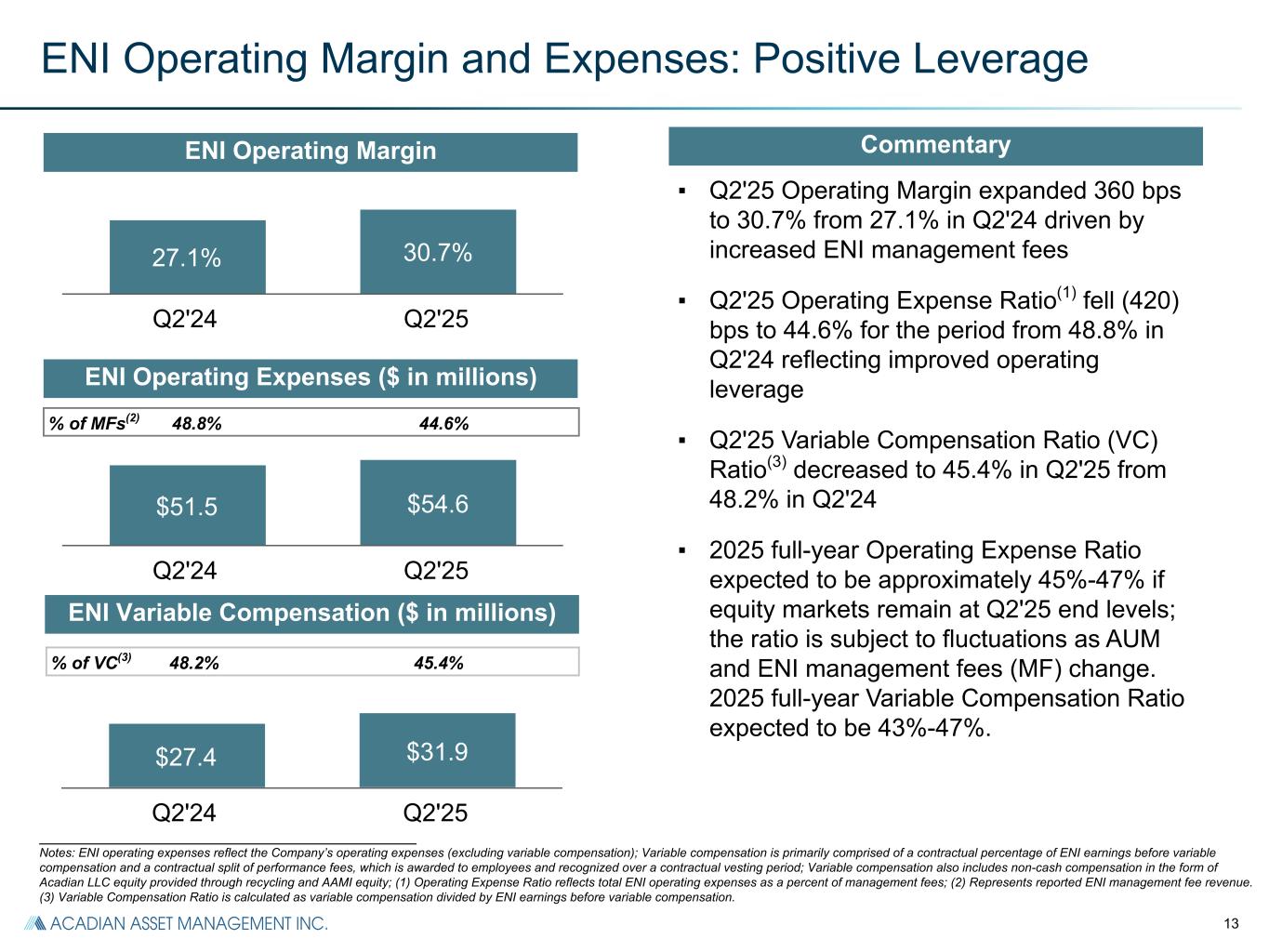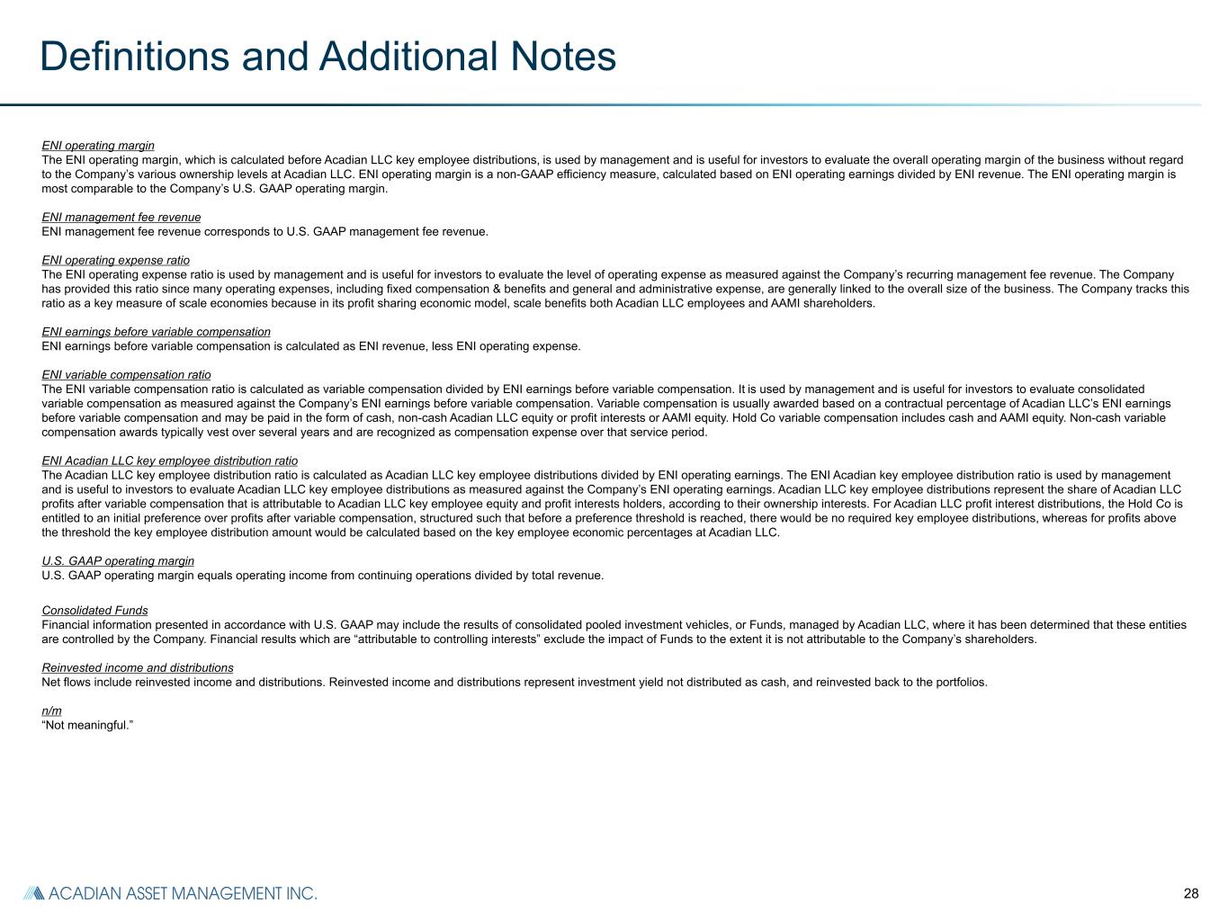 28 Definitions and Additional Notes ENI operating margin The ENI operating margin, which is calculated before Acadian LLC key employee distributions, is used by management and is useful for investors to evaluate the overall operating margin of the business without regard to the Company’s various ownership levels at Acadian LLC. ENI operating margin is a non-GAAP efficiency measure, calculated based on ENI operating earnings divided by ENI revenue. The ENI operating margin is most comparable to the Company’s U.S. GAAP operating margin. ENI management fee revenue ENI management fee revenue corresponds to U.S. GAAP management fee revenue. ENI operating expense ratio The ENI operating expense ratio is used by management and is useful for investors to evaluate the level of operating expense as measured against the Company’s recurring management fee revenue. The Company has provided this ratio since many operating expenses, including fixed compensation & benefits and general and administrative expense, are generally linked to the overall size of the business. The Company tracks this ratio as a key measure of scale economies because in its profit sharing economic model, scale benefits both Acadian LLC employees and AAMI shareholders. ENI earnings before variable compensation ENI earnings before variable compensation is calculated as ENI revenue, less ENI operating expense. ENI variable compensation ratio The ENI variable compensation ratio is calculated as variable compensation divided by ENI earnings before variable compensation. It is used by management and is useful for investors to evaluate consolidated variable compensation as measured against the Company’s ENI earnings before variable compensation. Variable compensation is usually awarded based on a contractual percentage of Acadian LLC’s ENI earnings before variable compensation and may be paid in the form of cash, non-cash Acadian LLC equity or profit interests or AAMI equity. Hold Co variable compensation includes cash and AAMI equity. Non-cash variable compensation awards typically vest over several years and are recognized as compensation expense over that service period. ENI Acadian LLC key employee distribution ratio The Acadian LLC key employee distribution ratio is calculated as Acadian LLC key employee distributions divided by ENI operating earnings. The ENI Acadian key employee distribution ratio is used by management and is useful to investors to evaluate Acadian LLC key employee distributions as measured against the Company’s ENI operating earnings. Acadian LLC key employee distributions represent the share of Acadian LLC profits after variable compensation that is attributable to Acadian LLC key employee equity and profit interests holders, according to their ownership interests. For Acadian LLC profit interest distributions, the Hold Co is entitled to an initial preference over profits after variable compensation, structured such that before a preference threshold is reached, there would be no required key employee distributions, whereas for profits above the threshold the key employee distribution amount would be calculated based on the key employee economic percentages at Acadian LLC. U.S. GAAP operating margin U.S. GAAP operating margin equals operating income from continuing operations divided by total revenue. Consolidated Funds Financial information presented in accordance with U.S. GAAP may include the results of consolidated pooled investment vehicles, or Funds, managed by Acadian LLC, where it has been determined that these entities are controlled by the Company. Financial results which are “attributable to controlling interests” exclude the impact of Funds to the extent it is not attributable to the Company’s shareholders. Reinvested income and distributions Net flows include reinvested income and distributions. Reinvested income and distributions represent investment yield not distributed as cash, and reinvested back to the portfolios. n/m “Not meaningful.”