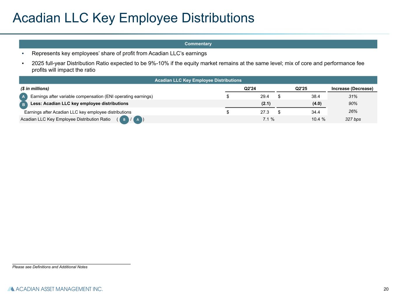 19 ENI Operating Expenses and ENI Variable Compensation ENI Operating Expenses ($ in millions) Q2'24 Q2'25 Increase (Decrease)$M % of MFs(1) $M % of MFs(1) Fixed compensation and benefits $ 24.3 23.0 % $ 25.0 20.4 % 3% G&A expenses (excl. sales-based compensation) 20.6 19.5 % 21.9 17.9 % 6% Depreciation and amortization 4.6 4.4 % 4.2 3.4 % (9)% Core operating expense subtotal $ 49.5 46.9 % $ 51.1 41.8 % 3% Sales-based compensation 2.0 1.9 % 3.5 2.9 % 75% Total ENI operating expenses $ 51.5 48.8 % $ 54.6 44.6 % 6% Note: ENI management fees $ 105.5 $ 122.3 16% ENI Operating Margin 27.1 % 30.7 % 360 bps ENI Variable Compensation ($ in millions) Q2'24 Q2'25 Increase (Decrease) Cash variable compensation $ 25.5 $ 30.5 20% Add: Non-cash equity-based award amortization 1.9 1.4 (26)% Variable compensation 27.4 31.9 16% Earnings before variable compensation $ 56.8 $ 70.3 24% Variable Compensation Ratio (VC as % of earnings before variable comp.) 48.2 % 45.4 % (286) bps Reconciliation of U.S. GAAP Operating Income to ENI Operating Earnings ($ in millions) Q2'24 Q2'25 U.S. GAAP operating income $ 20.6 $ 16.2 Exclude the impact of: Acadian LLC key employee-owned equity and profit interest revaluations 5.9 19.7 Restructuring costs 1.4 (0.4) Acadian LLC key employee distributions 2.1 4.0 Variable compensation 27.4 31.9 Consolidated Funds’ operating income (0.6) (1.1) ENI earnings before variable compensation 56.8 70.3 Less: ENI variable compensation (27.4) (31.9) ENI operating earnings $ 29.4 $ 38.4 _______________________________________________________ Please see Definitions and Additional Notes (1) Represents reported ENI management fee revenue.