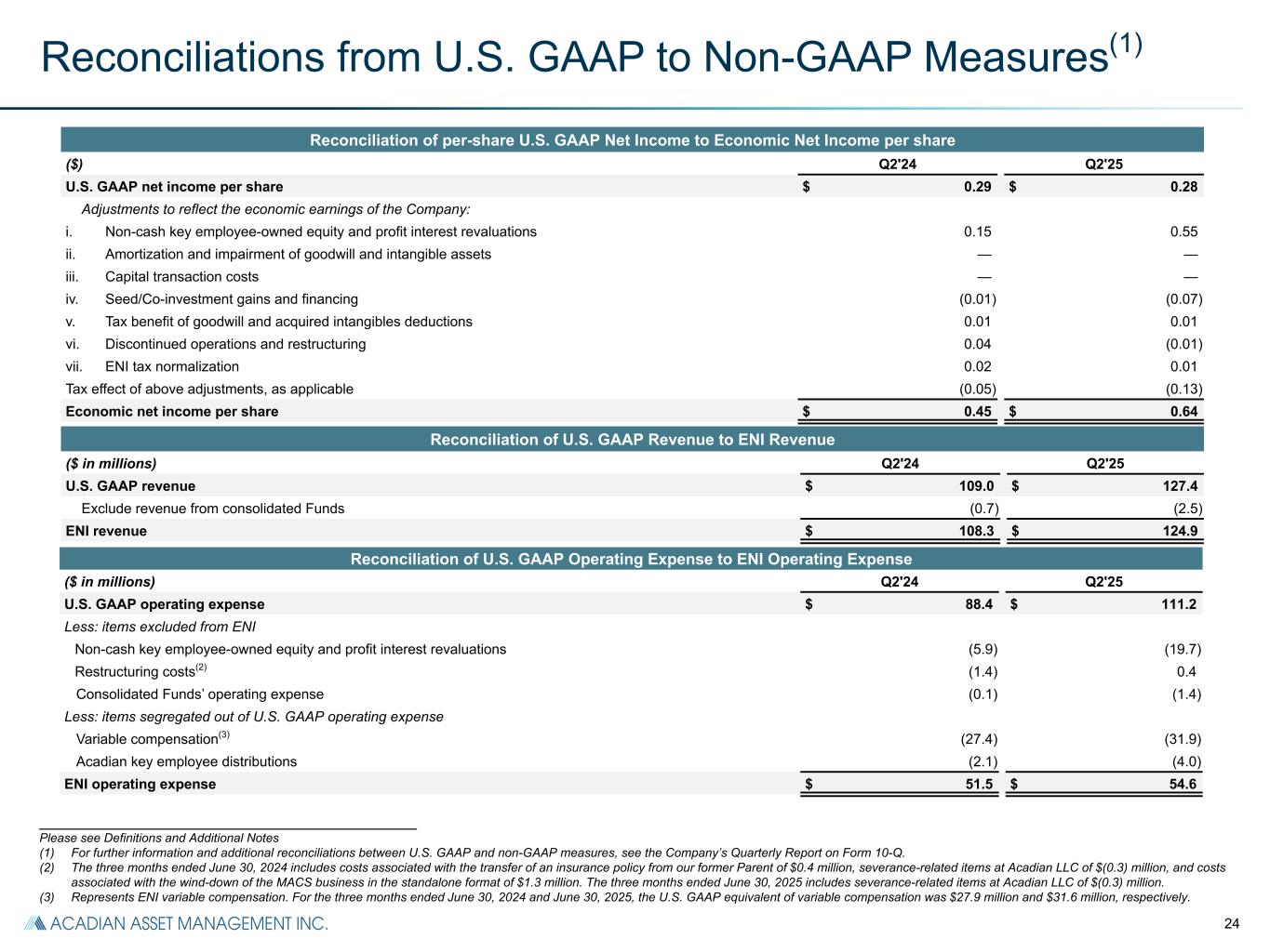 23 ($ in millions) Q2'24 Q2'25 U.S. GAAP net income attributable to controlling interests $ 11.0 $ 10.1 Adjustments to reflect the economic earnings of the Company: Non-cash key employee-owned equity and profit interest revaluations(2) 5.9 19.7 Amortization of acquired intangible assets(2) — — Capital transaction costs(2) 0.1 — Seed/Co-investment (gains) losses and financings(2) (0.2) (2.6) Tax benefit of goodwill and acquired intangible deductions 0.4 0.2 Discontinued operations attributable to controlling interests and restructuring(2)(3) 1.4 (0.3) Total adjustment to reflect earnings of the Company $ 7.6 $ 17.0 Tax effect of above adjustments(2) (2.0) (4.6) ENI tax normalization 0.6 0.4 Economic net income $ 17.2 $ 22.9 ENI net interest expense to third parties 3.5 3.0 Depreciation and amortization(4) 4.7 4.7 Tax on Economic Net Income 6.6 8.5 Adjusted EBITDA $ 32.0 $ 39.1 Reconciliations from U.S. GAAP to Non-GAAP Measures(1) i Exclude non-cash expenses representing changes in the value of Acadian LLC equity and profit interests held by Acadian LLC key employees ii Exclude non-cash amortization or impairment expenses related to acquired goodwill and other intangibles iii Exclude capital transaction costs including the costs of raising debt or equity, gains or losses realized as a result of redeeming debt or equity and direct incremental costs associated with acquisitions of businesses or assets iv Exclude gains/losses on seed capital and co-investments, as well as related financing costs v Include cash tax benefits related to tax amortization of acquired intangibles vi Exclude results of discontinued operations as they are not part of the ongoing business, and restructuring costs incurred in continuing operations vii Exclude one-off tax benefits or costs unrelated to current operations ENI Adjustments 1 3 2 3 4 5 7 6 2 1 4 5 6 7 _______________________________________________________ Please see Definitions and Additional Notes (1) For further information and additional reconciliations between U.S. GAAP and non-GAAP measures, see the Company’s Quarterly Report on Form 10-Q. (2) Tax-affected items for which adjustments are included in “Tax effect of above adjustments” line, excluding the discontinued operations component of item 6; taxed at 27.3% U.S. statutory rate (including state tax). (3) The three months ended June 30, 2024 includes costs associated with the transfer of an insurance policy from our former Parent of $0.4 million and severance-related items at Acadian LLC of $(0.3) million, and costs associated with the wind-down of the Multi-Asset Class Strategies (“MACS”) business in the standalone format of $1.3 million. The three months ended June 30, 2025 includes severance-related items at Acadian LLC of $(0.3) million. (4) Includes non-cash equity-based award amortization expense.