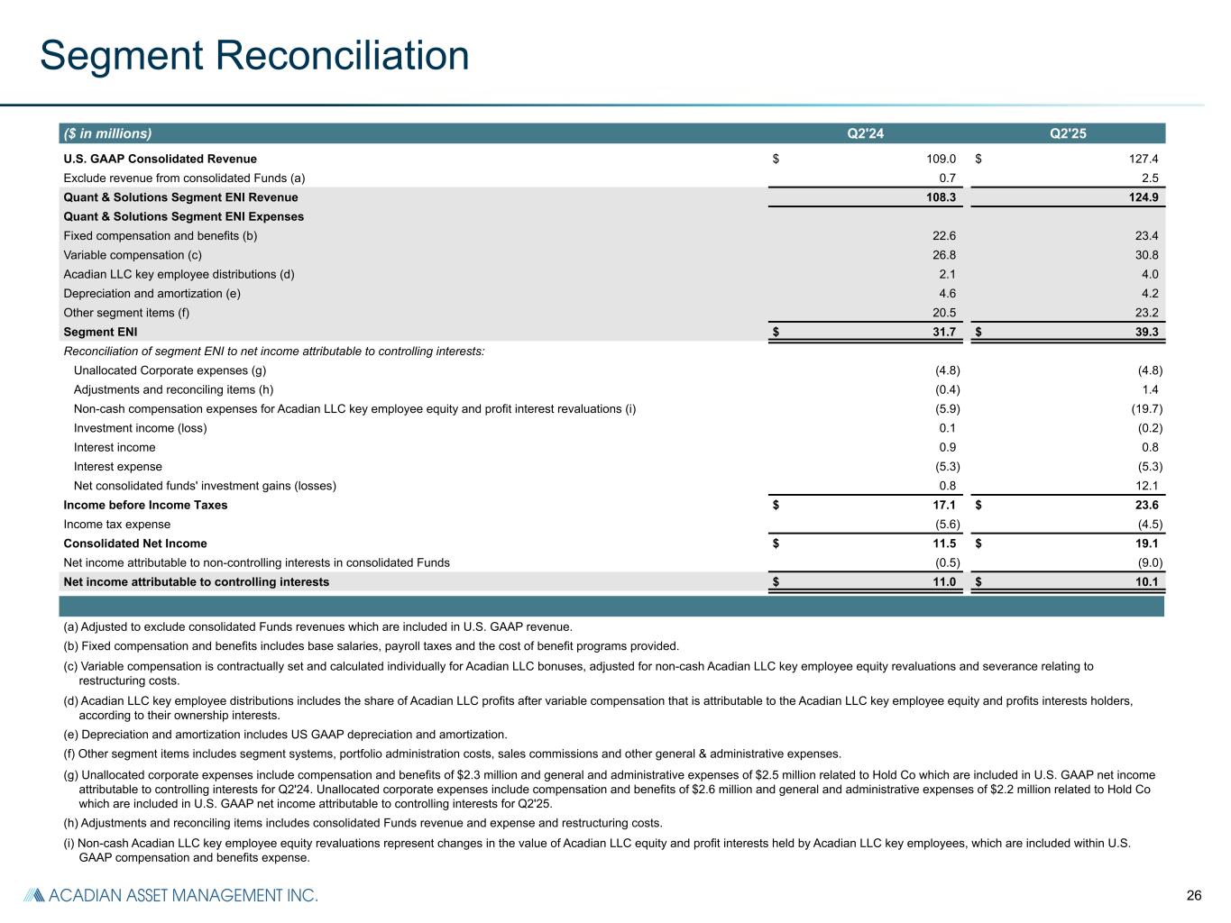 25 Reconciliations from U.S. GAAP to Non-GAAP Measures(1) _______________________________________________________ Please see Definitions and Additional Notes (1) For further information and additional reconciliations between U.S. GAAP and non-GAAP measures, see the Company’s Quarterly Report on Form 10-Q. (2) The three months ended June 30, 2024 includes costs associated with the transfer of an insurance policy from our former Parent of $0.4 million, severance-related items at Acadian LLC of $(0.3) million and costs associated with the wind-down of the MACS business in the standalone format of $1.3 million. The three months ended June 30, 2025 includes severance-related items at Acadian LLC of $(0.3) million. Reconciliation of U.S. GAAP Pre-tax Income to Pre-tax ENI ($ in millions) Q2'24 Q2'25 U.S. GAAP pre-tax income $ 17.1 $ 23.6 Adjustments to reflect the economic earnings of the Company: Non-cash key employee-owned equity and profit interest revaluations 5.9 19.7 Capital transaction costs 0.1 — Seed/Co-investment (gains) losses and financings (0.2) (2.6) Discontinued operations and restructuring costs(2) 1.4 (0.3) Net income attributable to non-controlling interests (0.5) (9.0) Pre-tax ENI $ 23.8 $ 31.4