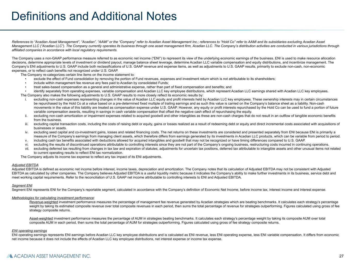 27 References to “Acadian Asset Management”, “Acadian”, “AAMI” or the “Company” refer to Acadian Asset Management Inc.; references to “Hold Co” refer to AAMI and its subsidiaries excluding Acadian Asset Management LLC (“Acadian LLC”). The Company currently operates its business through one asset management firm, Acadian LLC. The Company’s distribution activities are conducted in various jurisdictions through affiliated companies in accordance with local regulatory requirements. The Company uses a non-GAAP performance measure referred to as economic net income (“ENI”) to represent its view of the underlying economic earnings of the business. ENI is used to make resource allocation decisions, determine appropriate levels of investment or dividend payout, manage balance sheet leverage, determine Acadian LLC variable compensation and equity distributions, and incentivize management. The Company’s ENI adjustments to U.S. GAAP include both reclassifications of U.S. GAAP revenue and expense items, as well as adjustments to U.S. GAAP results, primarily to exclude non-cash, non-economic expenses, or to reflect cash benefits not recognized under U.S. GAAP. The Company re-categorizes certain line items on the income statement to: • exclude the effect of Fund consolidation by removing the portion of Fund revenues, expenses and investment return which is not attributable to its shareholders; • include within management fee revenue any fees paid to Acadian by consolidated Funds; • treat sales-based compensation as a general and administrative expense, rather than part of fixed compensation and benefits; and • identify separately from operating expenses, variable compensation and Acadian LLC key employee distributions, which represent Acadian LLC earnings shared with Acadian LLC key employees. The Company also makes the following adjustments to U.S. GAAP results to more closely reflect its economic results by: i. excluding non-cash expenses representing changes in the value of Acadian LLC equity and profit interests held by Acadian LLC key employees. These ownership interests may in certain circumstances be repurchased by the Hold Co at a value based on a pre-determined fixed multiple of trailing earnings and as such this value is carried on the Company’s balance sheet as a liability. Non-cash movements in the value of this liability are treated as compensation expense under U.S. GAAP. However, any equity or profit interests repurchased by the Hold Co can be used to fund a portion of future variable compensation awards, resulting in savings in cash variable compensation that offset the negative cash effect of repurchasing the equity. ii. excluding non-cash amortization or impairment expenses related to acquired goodwill and other intangibles as these are non-cash charges that do not result in an outflow of tangible economic benefits from the business. iii. excluding capital transaction costs, including the costs of raising debt or equity, gains or losses realized as a result of redeeming debt or equity and direct incremental costs associated with acquisitions of businesses or assets. iv. excluding seed capital and co-investment gains, losses and related financing costs. The net returns on these investments are considered and presented separately from ENI because ENI is primarily a measure of the Company’s earnings from managing client assets, which therefore differs from earnings generated by its investments in Acadian LLC products, which can be variable from period to period. v. including cash tax benefits associated with deductions allowed for acquired intangibles and goodwill that may not be recognized or have timing differences compared to U.S. GAAP. vi. excluding the results of discontinued operations attributable to controlling interests since they are not part of the Company’s ongoing business, restructuring costs incurred in continuing operations. vii. excluding deferred tax resulting from changes in tax law and expiration of statutes, adjustments for uncertain tax positions, deferred tax attributable to intangible assets and other unusual items not related to current operating results to reflect ENI tax normalization. The Company adjusts its income tax expense to reflect any tax impact of its ENI adjustments. Adjusted EBITDA Adjusted EBITDA is defined as economic net income before interest, income taxes, depreciation and amortization. The Company notes that its calculation of Adjusted EBITDA may not be consistent with Adjusted EBITDA as calculated by other companies. The Company believes Adjusted EBITDA is a useful liquidity metric because it indicates the Company’s ability to make further investments in its business, service debt and meet working capital requirements. Refer to the reconciliation of U.S. GAAP net income attributable to controlling interests to ENI and Adjusted EBITDA. Segment ENI Segment ENI represents ENI for the Company’s reportable segment, calculated in accordance with the Company’s definition of Economic Net Income, before income tax, interest income and interest expense. Methodologies for calculating investment performance: Revenue-weighted investment performance measures the percentage of management fee revenue generated by Acadian strategies which are beating benchmarks. It calculates each strategy’s percentage weight by taking its estimated composite revenue over total composite revenues in each period, then sums the total percentage of revenue for strategies outperforming. Figures calculated using gross of fee strategy composite returns. Asset-weighted investment performance measures the percentage of AUM in strategies beating benchmarks. It calculates each strategy’s percentage weight by taking its composite AUM over total composite AUM in each period, then sums the total percentage of AUM for strategies outperforming. Figures calculated using gross of fee strategy composite returns. ENI operating earnings ENI 