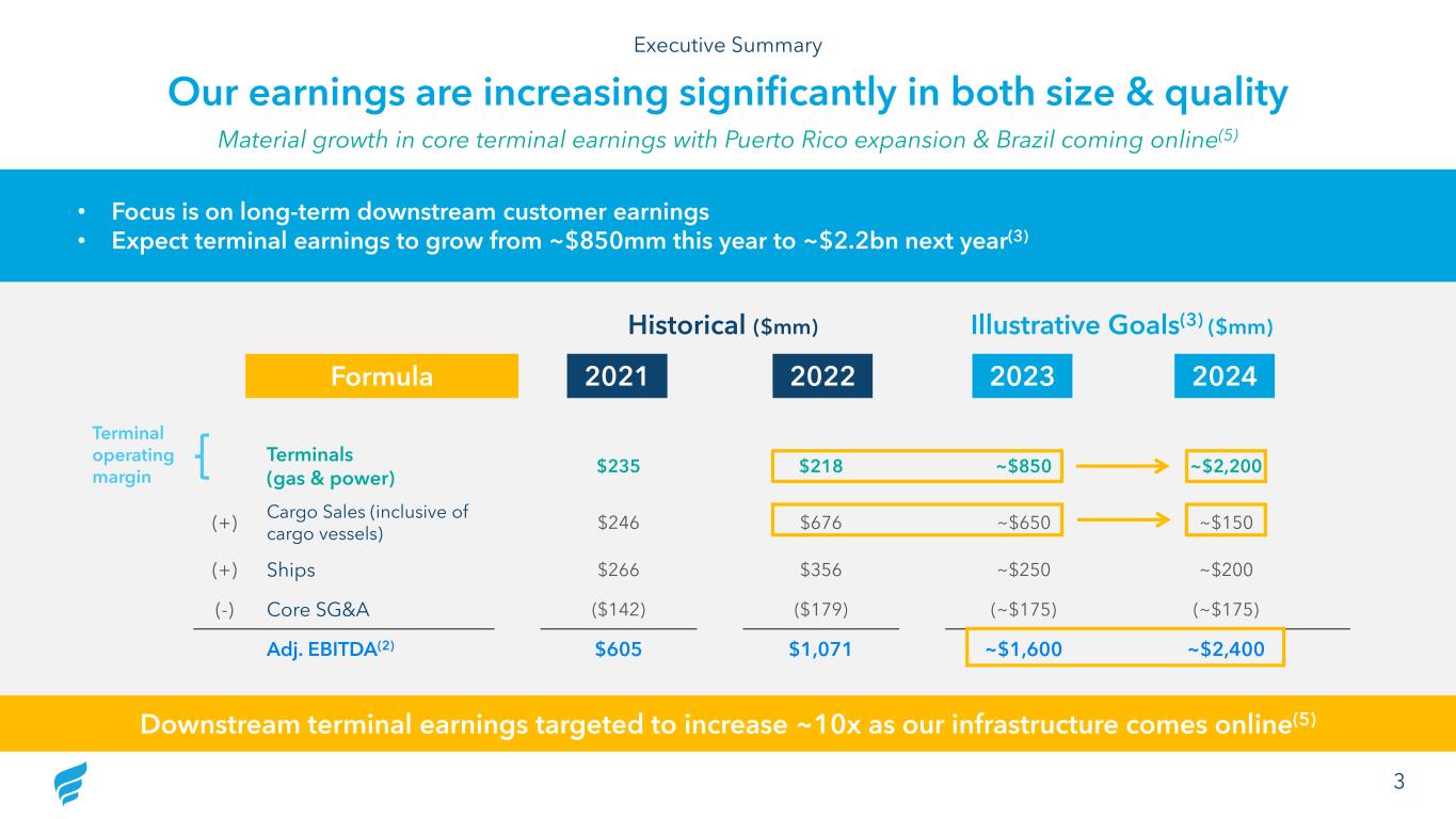 2 Focused on growing volumes in markets where NFE is already operational, requiring minimal additional capex(1) Executive Summary NFE is a $10bn+ leading LNG infrastructure company with long-term, diversified & stable cash flows Earnings underpinned by long-term contracts 12yrs avg. contract duration ~75% of ‘24 AEBITDA from IG counterparties(4) La Paz Mexico Puerto Sandino Nicaragua San Juan Puerto Rico Old Harbour Jamaica Montego Bay Jamaica Barcarena Brazil Jamalco CHP Jamaica Santa Catarina Brazil Miami Liquefier USA Power plant Terminals & facilities under development Terminals & facilities in operation Fast LNG 2021 2022 2023 2024 Terminal Volumes TBtu 55 49 88 158 Cargo Sales TBtu 20 39 48 27 Total Volumes TBtu 74 88 136 185 Adj. EBITDA(2) $mm $605 $1,071 ~$1,600 ~$2,400 Large portfolio of critical & irreplaceable energy infrastructure Illustrative Goals(3)Historical Robust terminal volumes & earnings growth