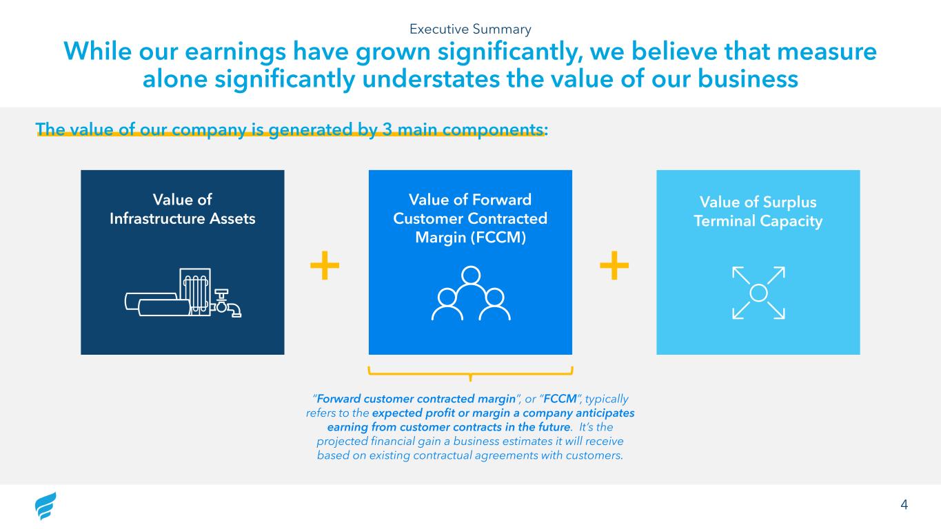 4 Executive Summary While our earnings have grown significantly, we believe that measure alone significantly understates the value of our business The value of our company is generated by 3 main components: + + Value of Infrastructure Assets Value of Forward Customer Contracted Margin (FCCM) Value of Surplus Terminal Capacity “Forward customer contracted margin”, or “FCCM”, typically refers to the expected profit or margin a company anticipates earning from customer contracts in the future. It’s the projected financial gain a business estimates it will receive based on existing contractual agreements with customers.