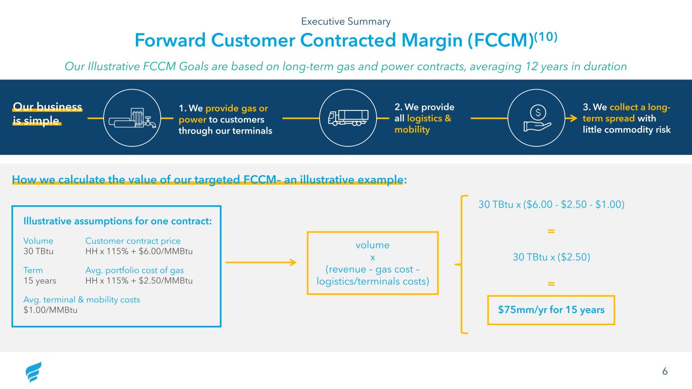 30 TBtu x ($2.50) 6 Executive Summary Forward Customer Contracted Margin (FCCM)(10) Our Illustrative FCCM Goals are based on long-term gas and power contracts, averaging 12 years in duration 1. We provide gas or power to customers through our terminals 2. We provide all logistics & mobility 3. We collect a long- term spread with little commodity risk Our business is simple Illustrative assumptions for one contract: Volume 30 TBtu Term 15 years Avg. terminal & mobility costs $1.00/MMBtu Customer contract price HH x 115% + $6.00/MMBtu Avg. portfolio cost of gas HH x 115% + $2.50/MMBtu 30 TBtu x ($6.00 - $2.50 - $1.00) $75mm/yr for 15 years = = volume x (revenue – gas cost – logistics/terminals costs) How we calculate the value of our targeted FCCM– an illustrative example: