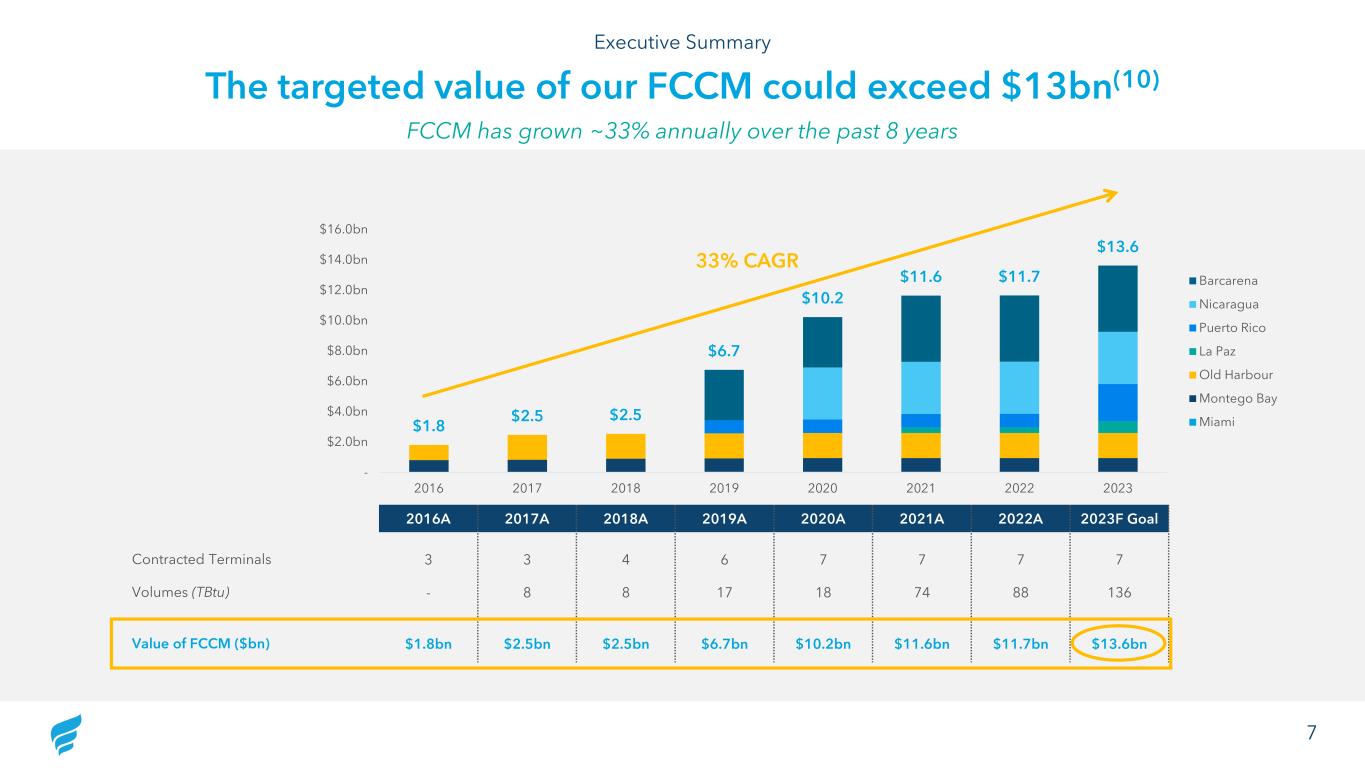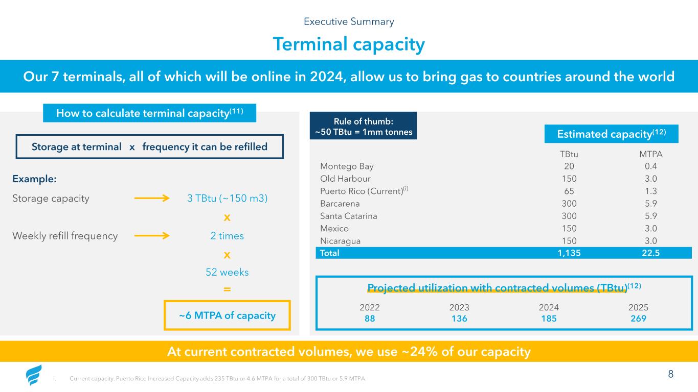 $1.8 $2.5 $2.5 $6.7 $10.2 $11.6 $11.7 $13.6 - $2.0bn $4.0bn $6.0bn $8.0bn $10.0bn $12.0bn $14.0bn $16.0bn 2016 2017 2018 2019 2020 2021 2022 2023 Barcarena Nicaragua Puerto Rico La Paz Old Harbour Montego Bay Miami 7 Executive Summary The targeted value of our FCCM could exceed $13bn(10) 2016A 2017A 2018A 2019A 2020A 2021A 2022A 2023F Goal Contracted Terminals 3 3 4 6 7 7 7 7 Volumes (TBtu) - 8 8 17 18 74 88 136 Value of FCCM ($bn) $1.8bn $2.5bn $2.5bn $6.7bn $10.2bn $11.6bn $11.7bn $13.6bn FCCM has grown ~33% annually over the past 8 years 33% CAGR