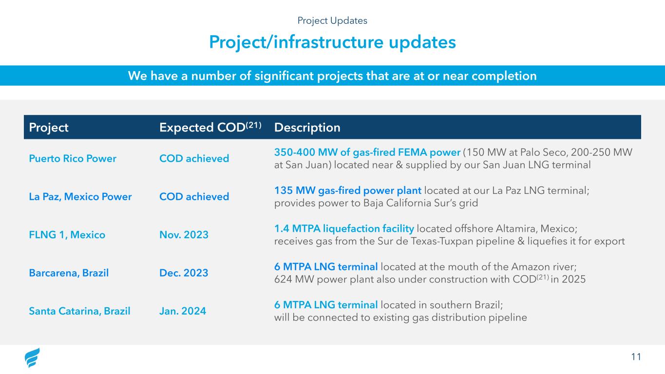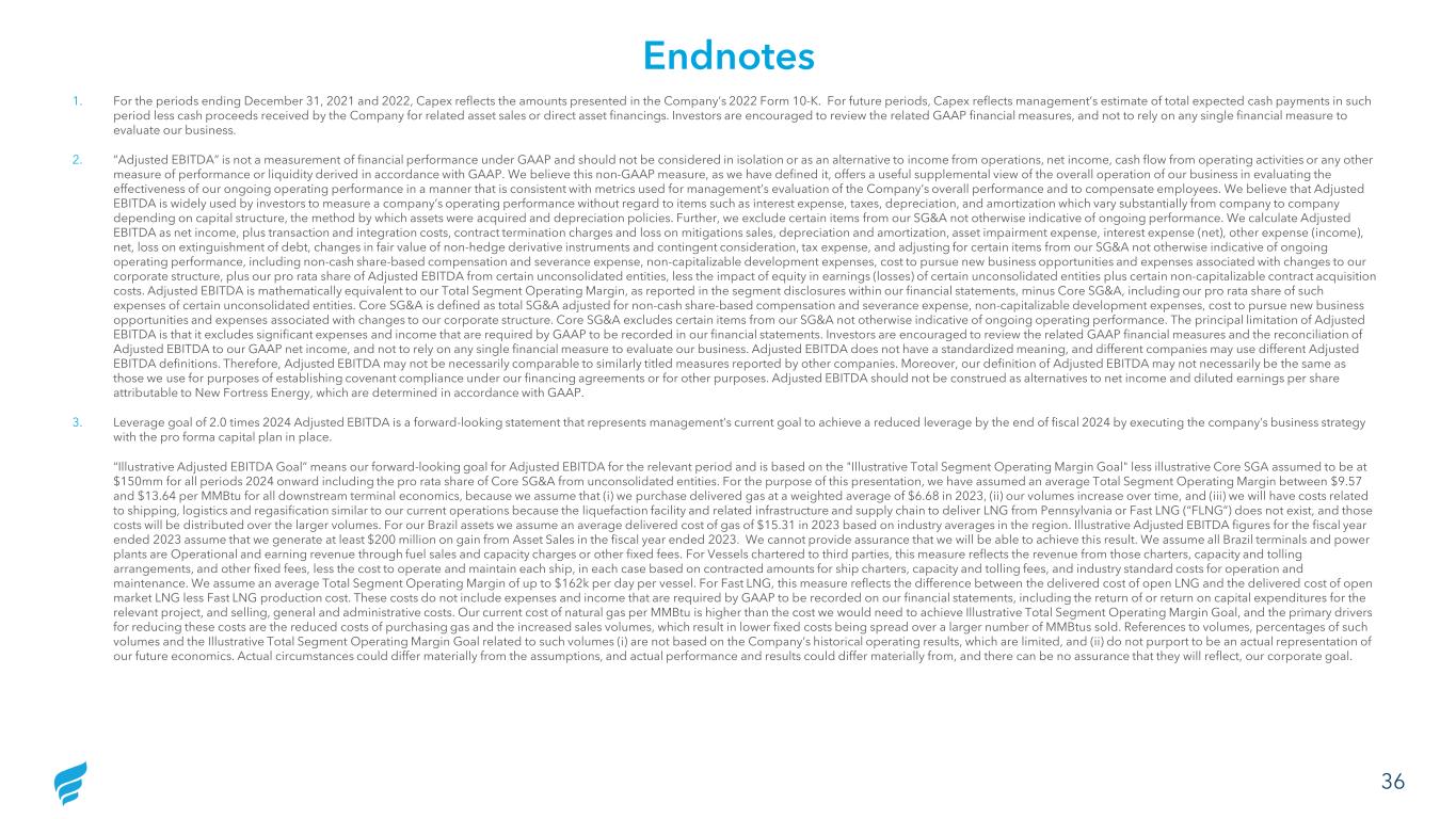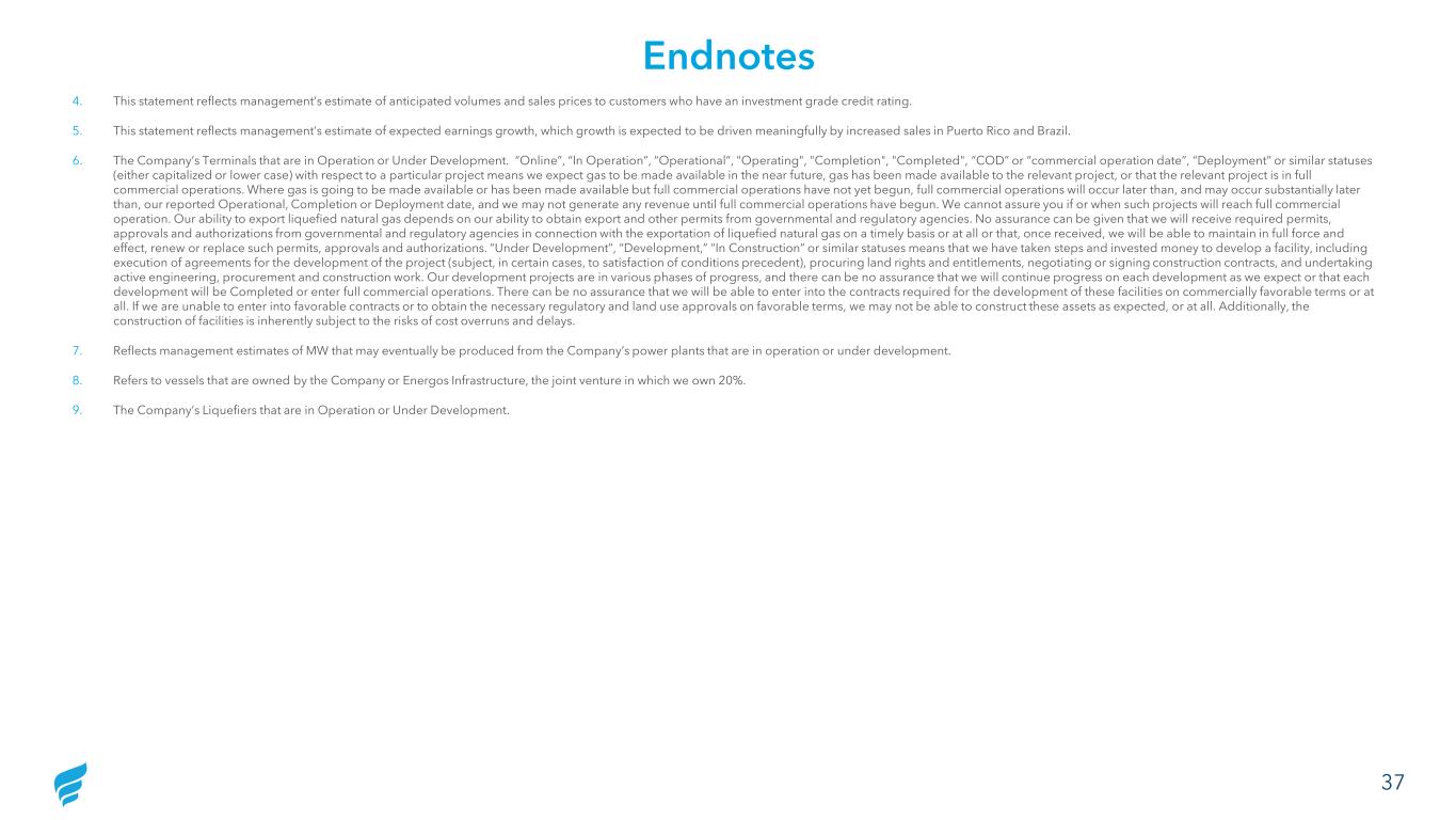 Endnotes 37 4. This statement reflects management’s estimate of anticipated volumes and sales prices to customers who have an investment grade credit rating. 5. This statement reflects management’s estimate of expected earnings growth, which growth is expected to be driven meaningfully by increased sales in Puerto Rico and Brazil. 6. The Company’s Terminals that are in Operation or Under Development. “Online”, “In Operation”, “Operational”, "Operating", "Completion", "Completed", “COD” or “commercial operation date”, “Deployment” or similar statuses (either capitalized or lower case) with respect to a particular project means we expect gas to be made available in the near future, gas has been made available to the relevant project, or that the relevant project is in full commercial operations. Where gas is going to be made available or has been made available but full commercial operations have not yet begun, full commercial operations will occur later than, and may occur substantially later than, our reported Operational, Completion or Deployment date, and we may not generate any revenue until full commercial operations have begun. We cannot assure you if or when such projects will reach full commercial operation. Our ability to export liquefied natural gas depends on our ability to obtain export and other permits from governmental and regulatory agencies. No assurance can be given that we will receive required permits, approvals and authorizations from governmental and regulatory agencies in connection with the exportation of liquefied natural gas on a timely basis or at all or that, once received, we will be able to maintain in full force and effect, renew or replace such permits, approvals and authorizations. “Under Development”, “Development,” “In Construction” or similar statuses means that we have taken steps and invested money to develop a facility, including execution of agreements for the development of the project (subject, in certain cases, to satisfaction of conditions precedent), procuring land rights and entitlements, negotiating or signing construction contracts, and undertaking active engineering, procurement and construction work. Our development projects are in various phases of progress, and there can be no assurance that we will continue progress on each development as we expect or that each development will be Completed or enter full commercial operations. There can be no assurance that we will be able to enter into the contracts required for the development of these facilities on commercially favorable terms or at all. If we are unable to enter into favorable contracts or to obtain the necessary regulatory and land use approvals on favorable terms, we may not be able to construct these assets as expected, or at all. Additionally, the construction of facilities is inherently subject to the risks of cost overruns and delays. 7. Reflects management estimates of MW that may eventually be produced from the Company’s power plants that are in operation or under development. 8. Refers to vessels that are owned by the Company or Energos Infrastructure, the joint venture in which we own 20%. 9. The Company’s Liquefiers that are in Operation or Under Development.