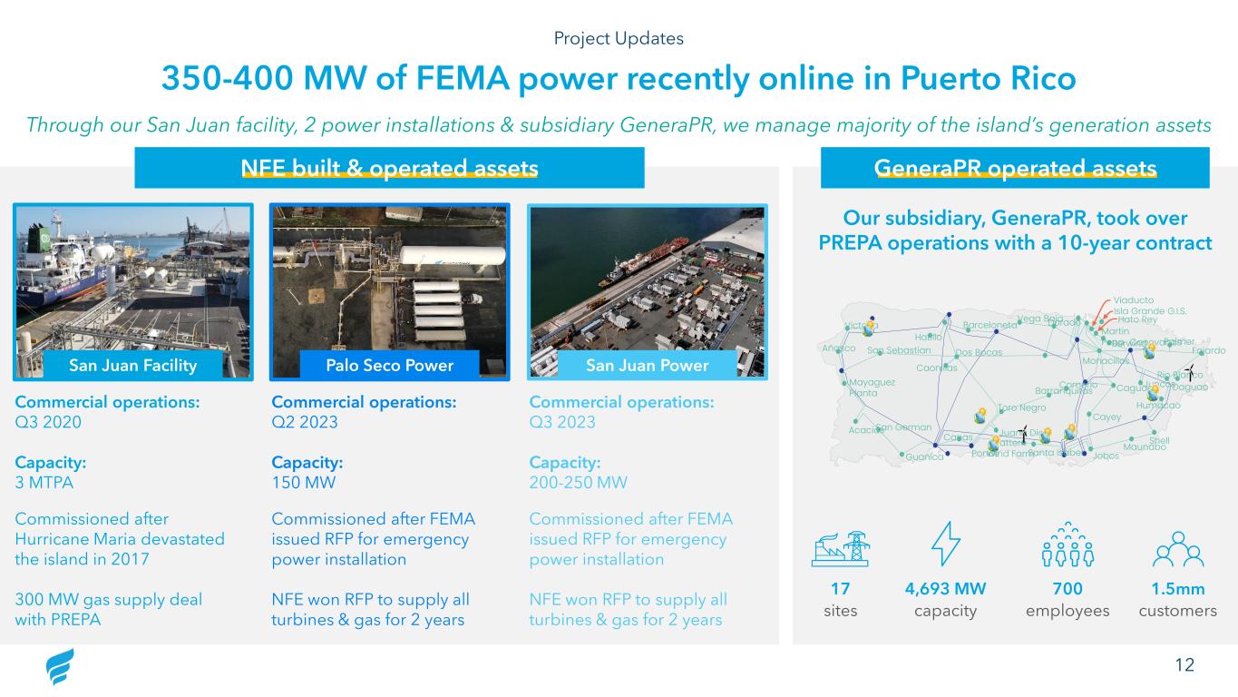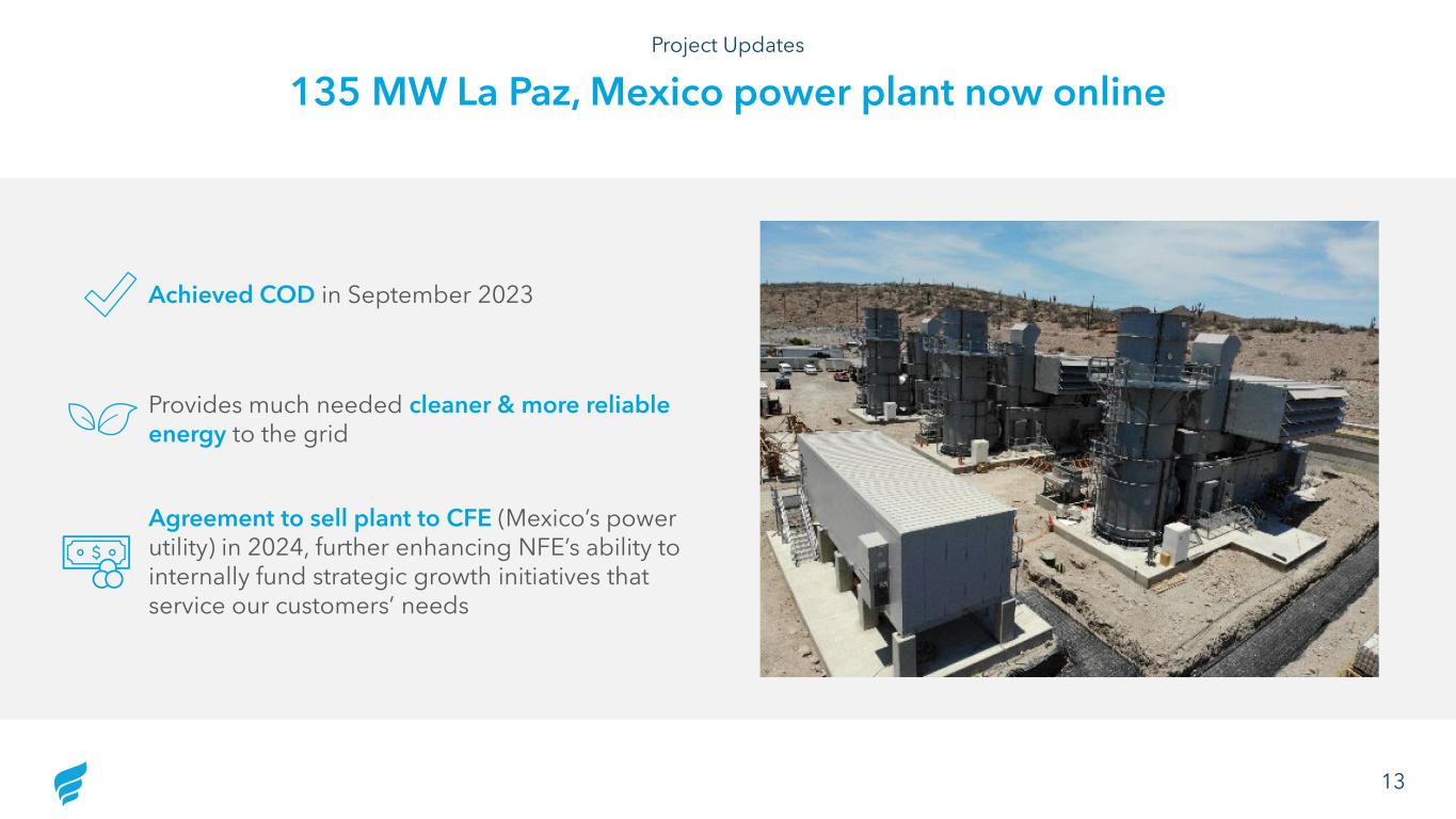 Our subsidiary, GeneraPR, took over PREPA operations with a 10-year contract 12 Project Updates 350-400 MW of FEMA power recently online in Puerto Rico Through our San Juan facility, 2 power installations & subsidiary GeneraPR, we manage majority of the island’s generation assets Commissioned after Hurricane Maria devastated the island in 2017 300 MW gas supply deal with PREPA San Juan Facility Commercial operations: Q3 2020 Capacity: 3 MTPA Commissioned after FEMA issued RFP for emergency power installation NFE won RFP to supply all turbines & gas for 2 years Palo Seco Power Commercial operations: Q2 2023 Capacity: 150 MW Commissioned after FEMA issued RFP for emergency power installation NFE won RFP to supply all turbines & gas for 2 years San Juan Power Commercial operations: Q3 2023 Capacity: 200-250 MW 17 sites 4,693 MW capacity 700 employees 1.5mm customers Insert map of PREPA assets San Sebastian Victoria Añasco Mayaguez Planta Caonillas Dos Bocas Hatillo Barceloneta Vega BajaDorado Toro Negro Juana Diaz Pattern Wind Farm BarranquitasComerio Viaducto Hato Rey Isla Grande G.I.S. AcaciasSan German Guanica Canas Santa Isabel Jobos Maunabo Shell Cayey CaguasJuncos Humacao Daguao Rio Blanco Palmer Fajardo Canovan s Martin PenaBerwind Ponce Monacillos NFE built & operated assets GeneraPR operated assets