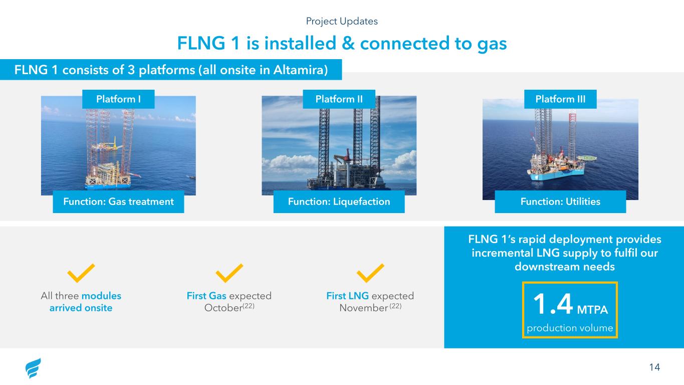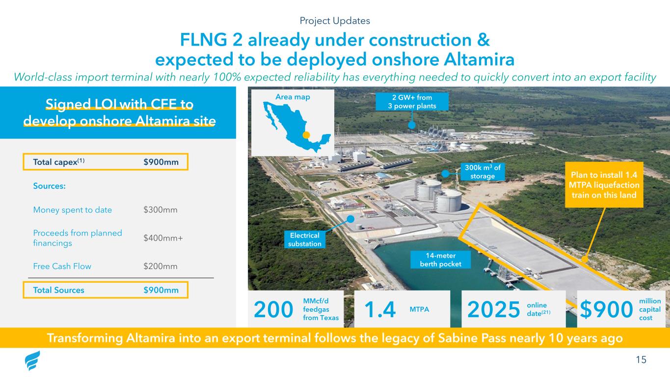 FLNG 1 consists of 3 platforms (all onsite in Altamira) 14 Project Updates FLNG 1 is installed & connected to gas Platform I Function: Gas treatment Platform II Function: Liquefaction Platform III Function: Utilities All three modules arrived onsite First Gas expected October(22) First LNG expected November (22) 1.4 MTPA FLNG 1’s rapid deployment provides incremental LNG supply to fulfil our downstream needs production volume