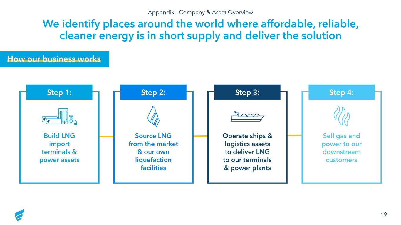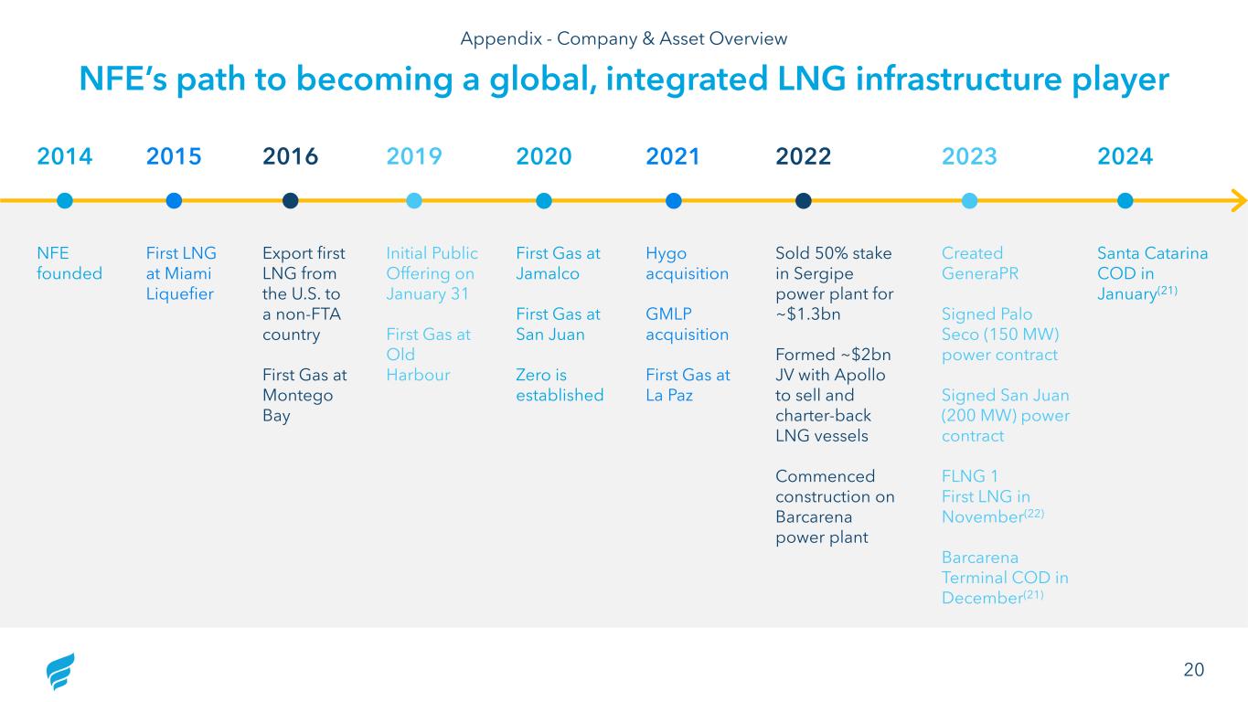 19 Appendix - Company & Asset Overview Step 3: Operate ships & logistics assets to deliver LNG to our terminals & power plants Step 2: Source LNG from the market & our own liquefaction facilities Step 1: Build LNG import terminals & power assets Step 4: Sell gas and power to our downstream customers We identify places around the world where affordable, reliable, cleaner energy is in short supply and deliver the solution How our business works