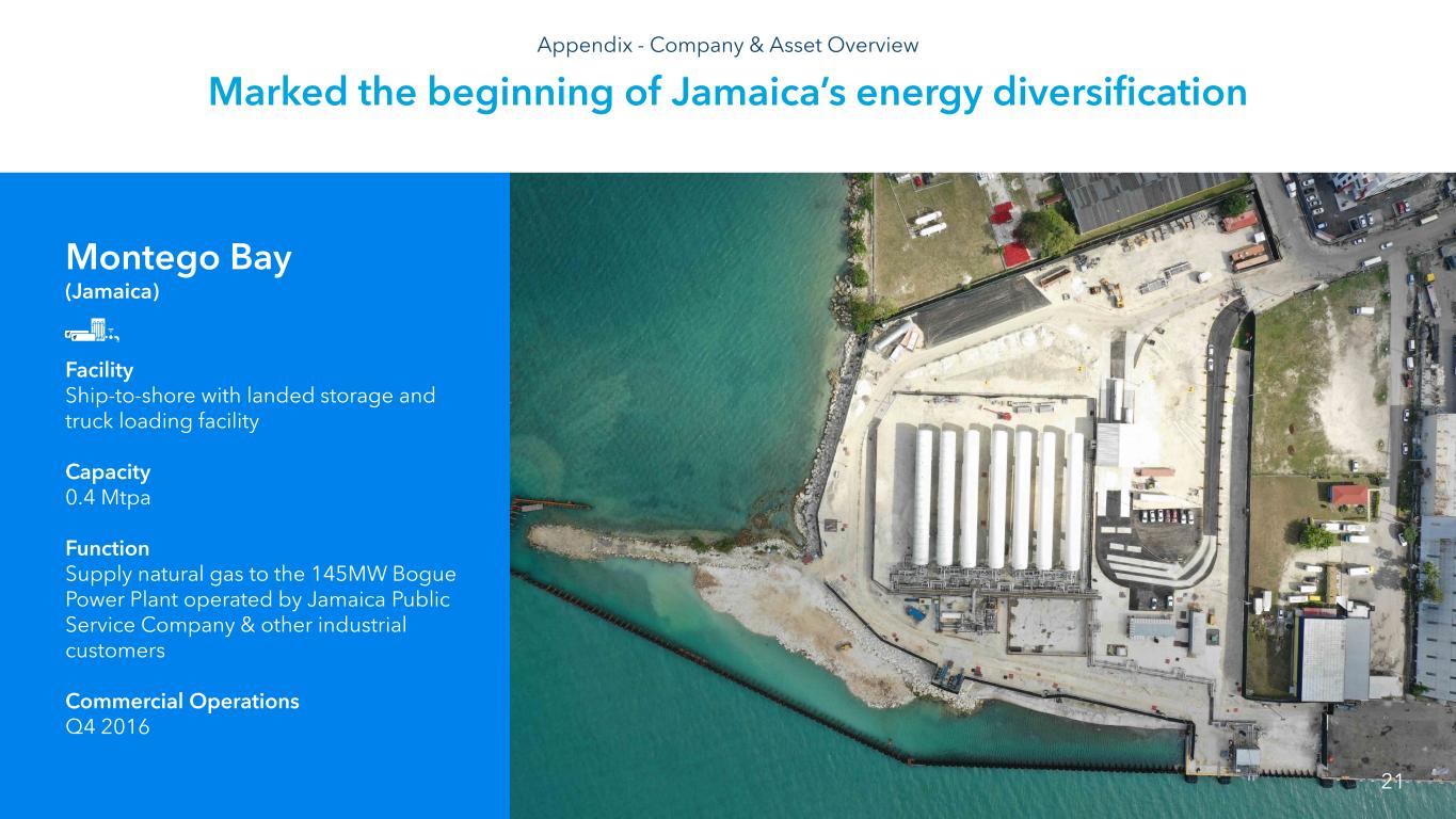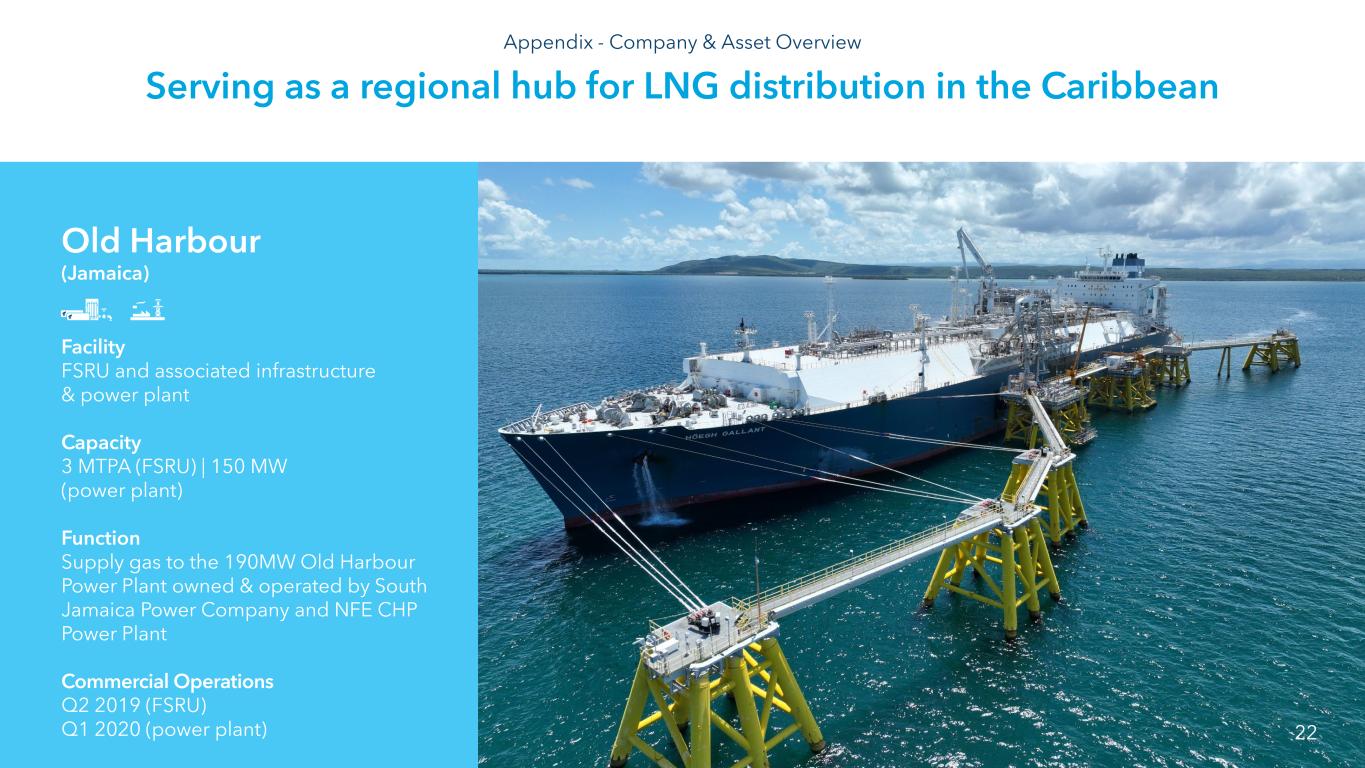 Marked the beginning of Jamaica’s energy diversification 21 Appendix - Company & Asset Overview Montego Bay (Jamaica) Facility Ship-to-shore with landed storage and truck loading facility Capacity 0.4 Mtpa Function Supply natural gas to the 145MW Bogue Power Plant operated by Jamaica Public Service Company & other industrial customers Commercial Operations Q4 2016