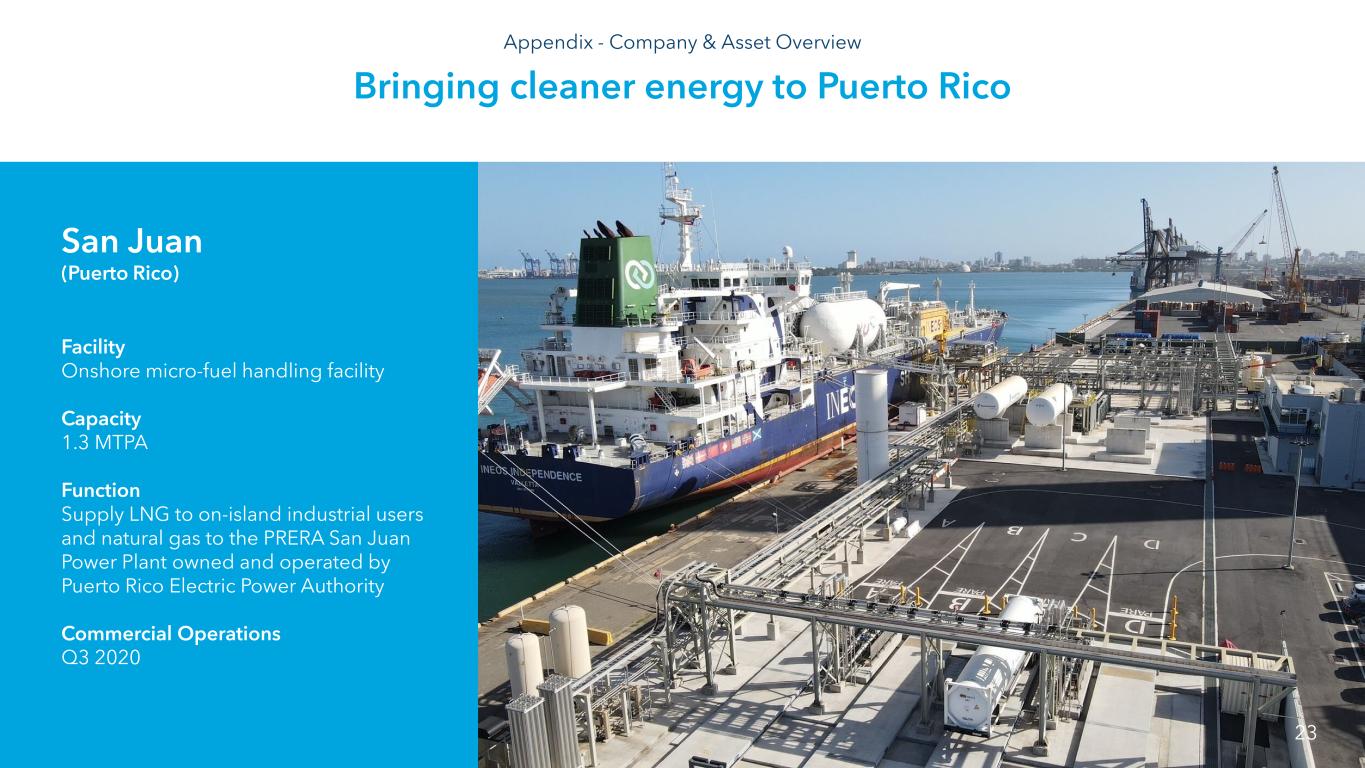 Serving as a regional hub for LNG distribution in the Caribbean 22 Appendix - Company & Asset Overview Old Harbour (Jamaica) Facility FSRU and associated infrastructure & power plant Capacity 3 MTPA (FSRU) | 150 MW (power plant) Function Supply gas to the 190MW Old Harbour Power Plant owned & operated by South Jamaica Power Company and NFE CHP Power Plant Commercial Operations Q2 2019 (FSRU) Q1 2020 (power plant)