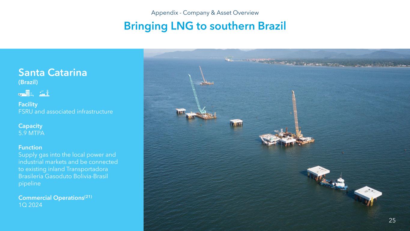 Supplying the Amazon river basin with cleaner energy Appendix - Company & Asset Overview Barcarena (Brazil) Facility FSRU and associated infrastructure & power plant Capacity 5.9 MTPA (FSRU) | 624 MW (power plant) Function Supply gas to Alunorte Alumina Refinery owend by Norsk Hydro ASA and NFE Barcarena Power Plant Commercial Operations(21) 4Q 2023 (FSRU) 2025 (power plant) 24