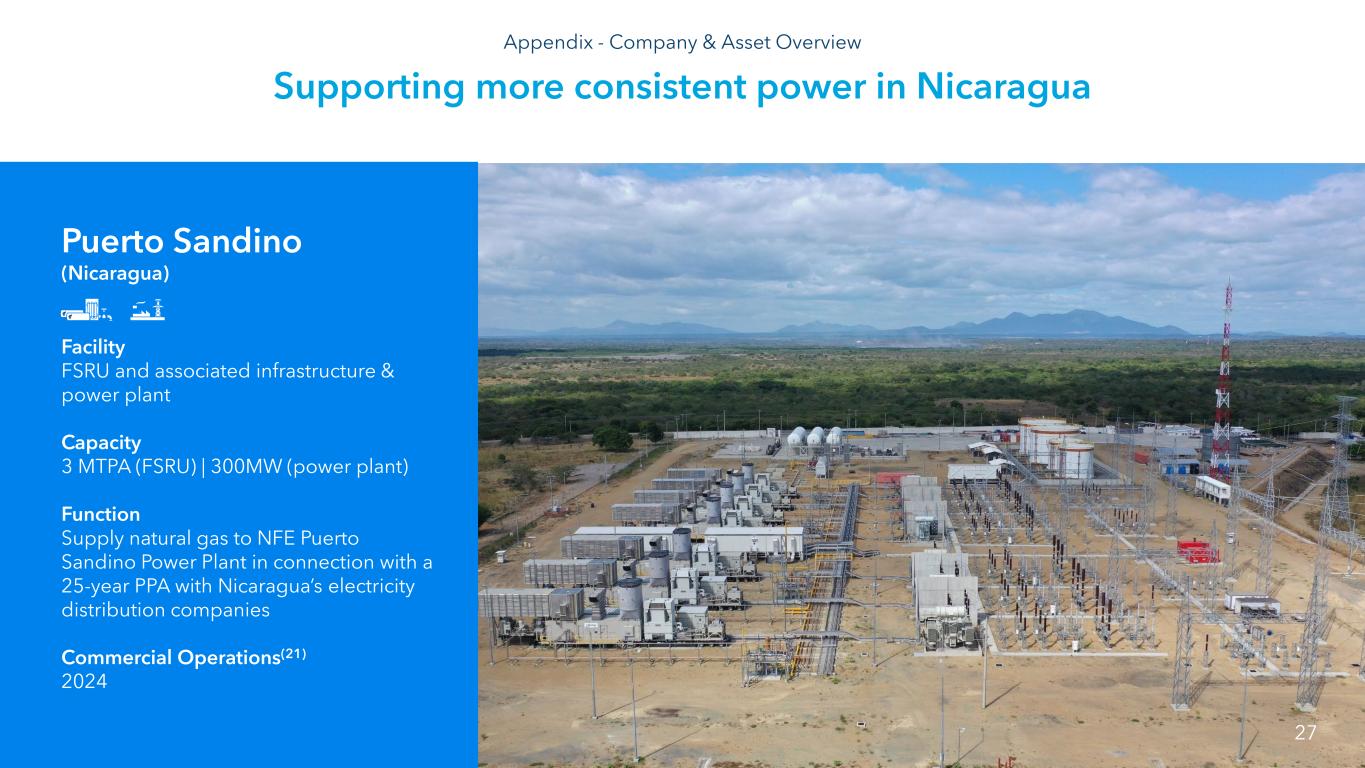 26 Powering La Paz with positive energy Appendix - Company & Asset Overview La Paz (Mexico) Facility Onshore LNG receiving facility & power plant Capacity 3 MTPA (LNG facility) | 100 MW (power plant) Function Supply LNG to multiple CFE power generation facilities and NFE La Paz power Plant Commercial Operations Q2 2021 (LNG facility) Q3 2023 (power plant)