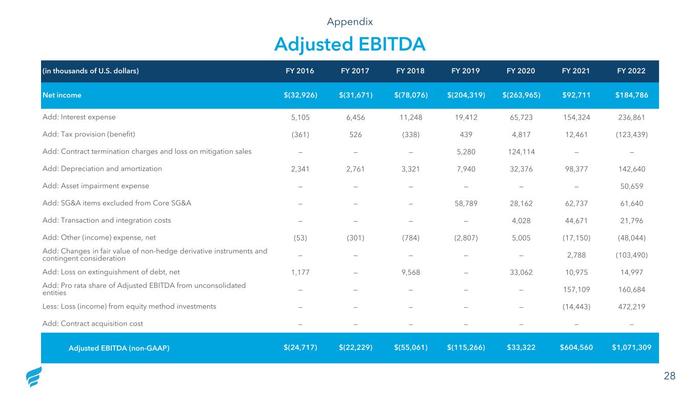 Appendix Adjusted EBITDA 28 (in thousands of U.S. dollars) FY 2016 FY 2017 FY 2018 FY 2019 FY 2020 FY 2021 FY 2022 Net income $(32,926) $(31,671) $(78,076) $(204,319) $(263,965) $92,711 $184,786 Add: Interest expense 5,105 6,456 11,248 19,412 65,723 154,324 236,861 Add: Tax provision (benefit) (361) 526 (338) 439 4,817 12,461 (123,439) Add: Contract termination charges and loss on mitigation sales — — — 5,280 124,114 — — Add: Depreciation and amortization 2,341 2,761 3,321 7,940 32,376 98,377 142,640 Add: Asset impairment expense — — — — — — 50,659 Add: SG&A items excluded from Core SG&A — — — 58,789 28,162 62,737 61,640 Add: Transaction and integration costs — — — — 4,028 44,671 21,796 Add: Other (income) expense, net (53) (301) (784) (2,807) 5,005 (17,150) (48,044) Add: Changes in fair value of non-hedge derivative instruments and contingent consideration — — — — — 2,788 (103,490) Add: Loss on extinguishment of debt, net 1,177 — 9,568 — 33,062 10,975 14,997 Add: Pro rata share of Adjusted EBITDA from unconsolidated entities — — — — — 157,109 160,684 Less: Loss (income) from equity method investments — — — — — (14,443) 472,219 Add: Contract acquisition cost — — — — — — — Adjusted EBITDA (non-GAAP) $(24,717) $(22,229) $(55,061) $(115,266) $33,322 $604,560 $1,071,309